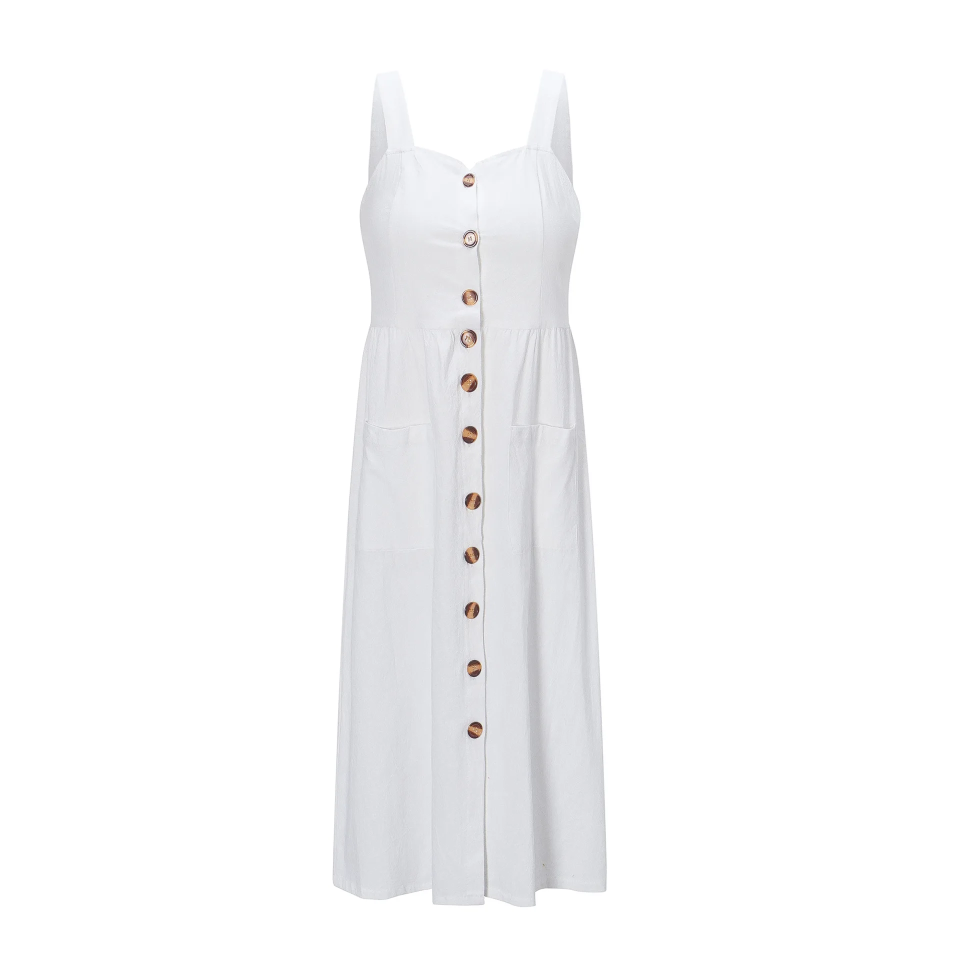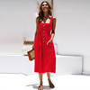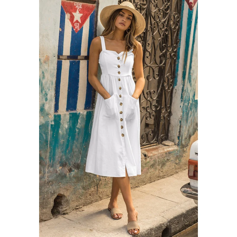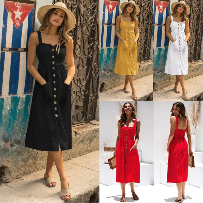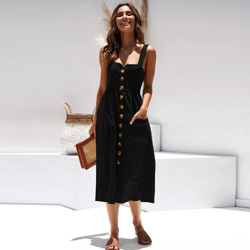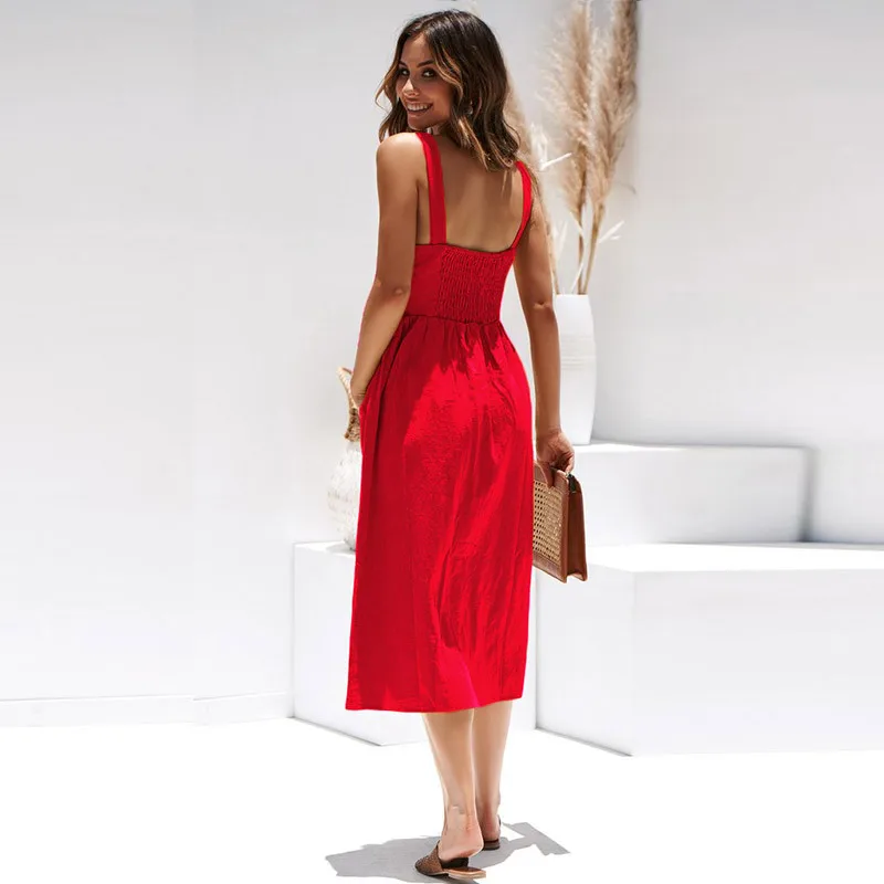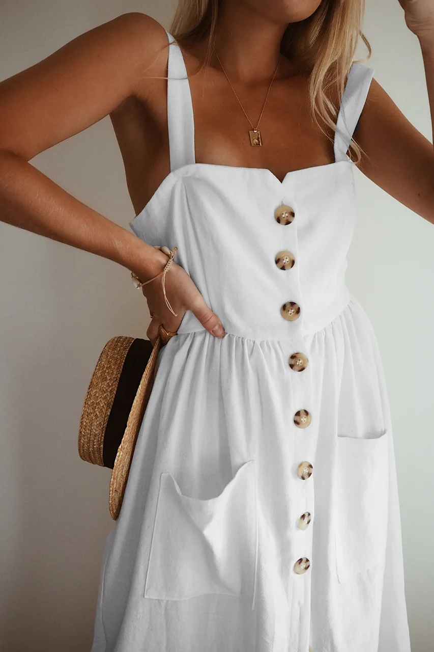 Summer Camisole Dress Women Elegant Wide Straps Single-breasted Midi Dress Female Fashion Pocket Slim Sun Dress Stretch bust
