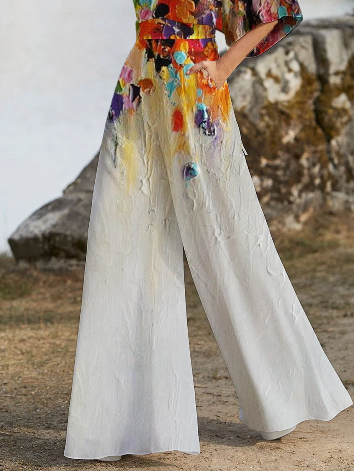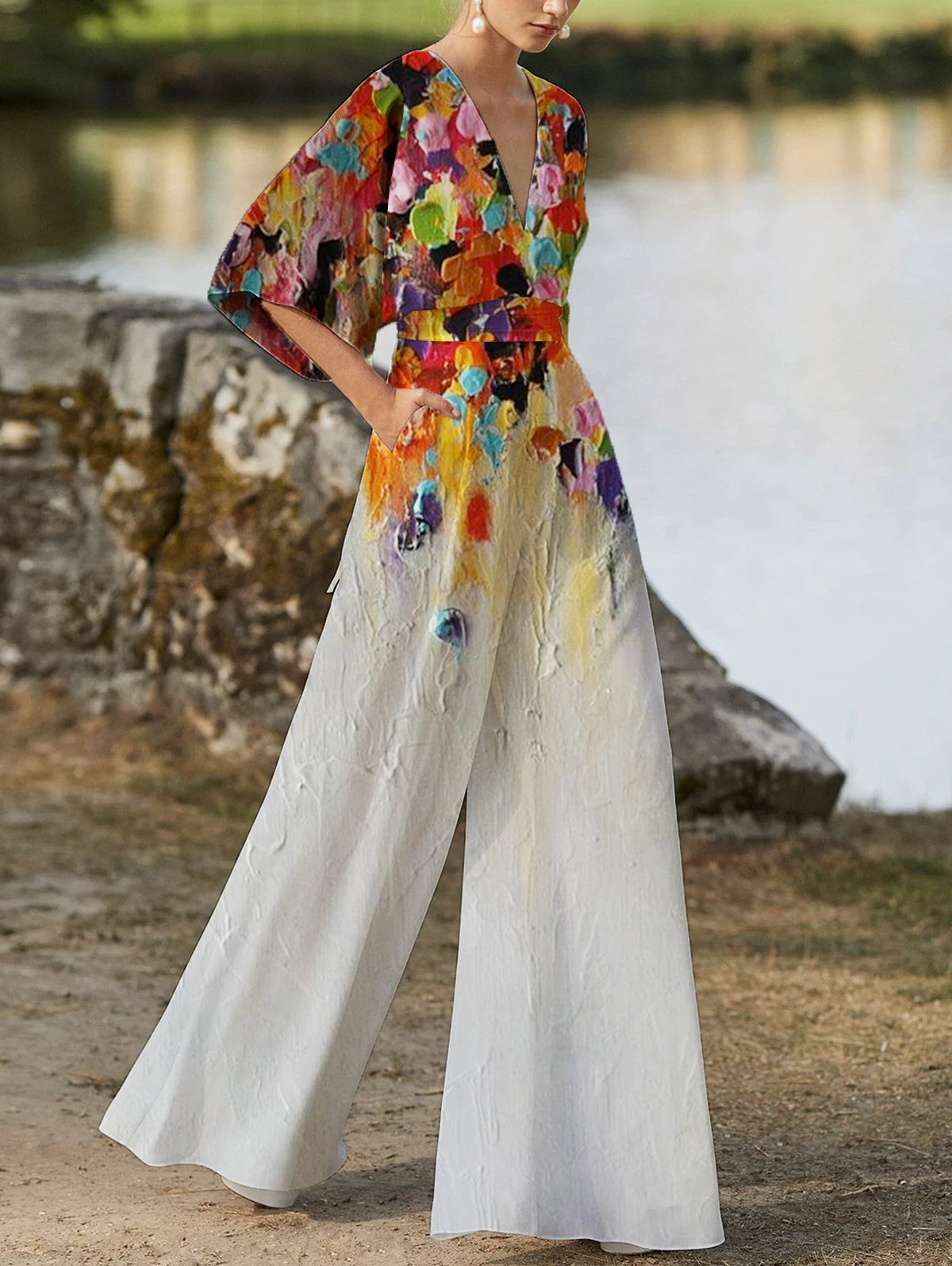 Summer Casual Women Printed Wide Leg Jumpsuit Female V-Neck Half Sleeve High Waist Draped Tie Dye Loose Romper New Fashion