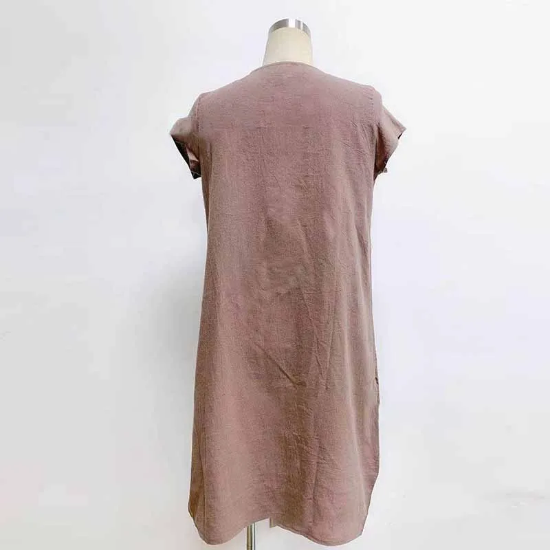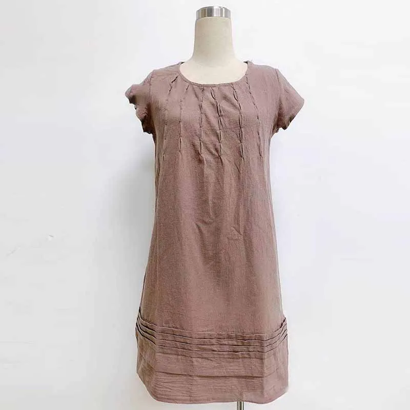 Summer Cotton Linen Dresses Plus Size Pleated Short Sleeve Skirt O-Neck Solid Color Knee Length A-Line Casual Loose Dress Boho