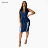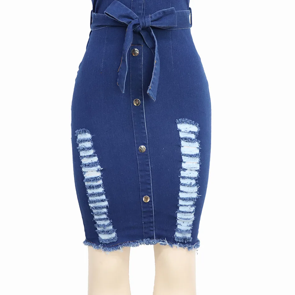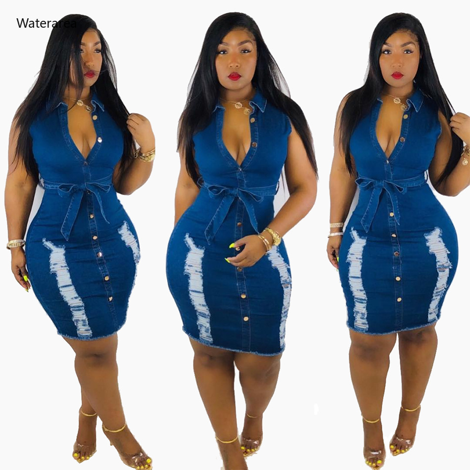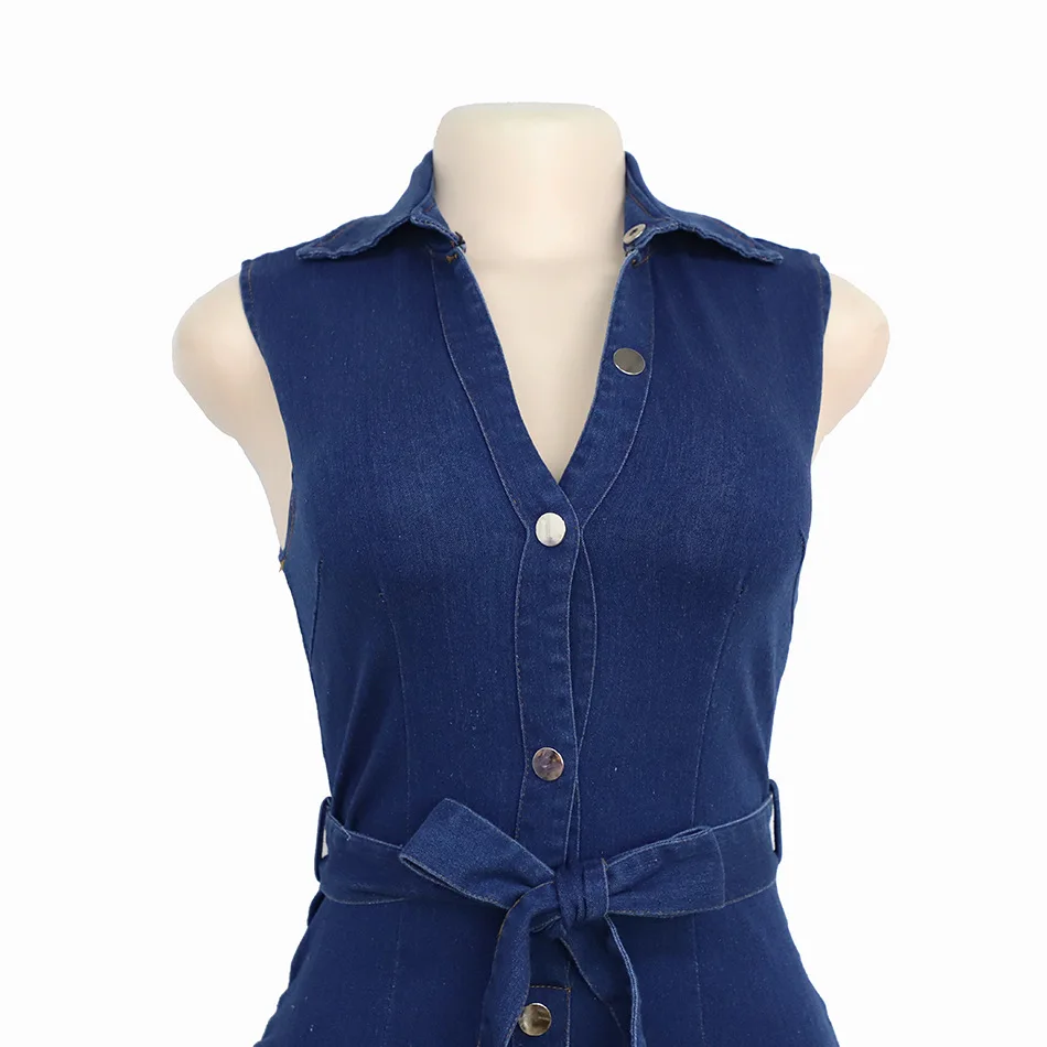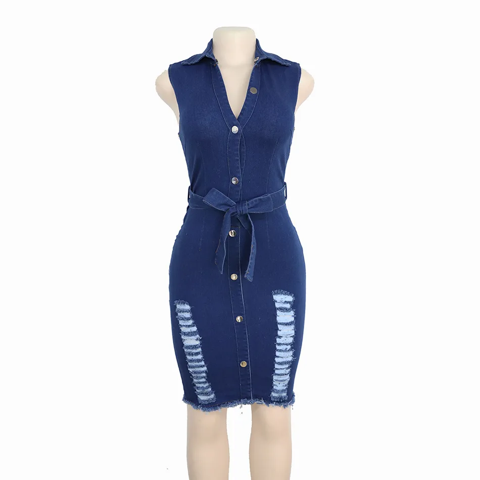 Summer Dress Plus Size Women Turn-down Collar Sleeveless Frayed Single-Breasted Denim Knee Length Dress Office Lady Dress98025