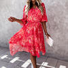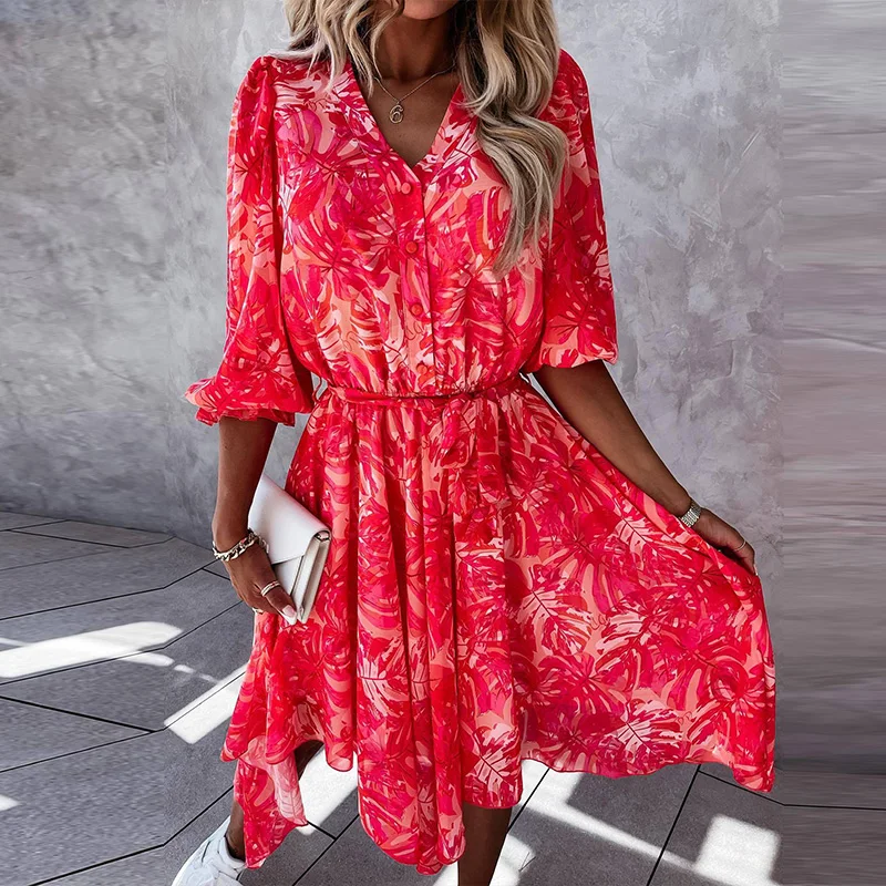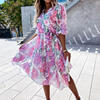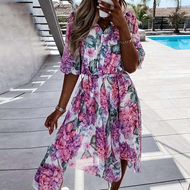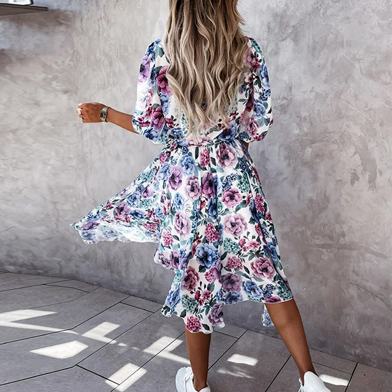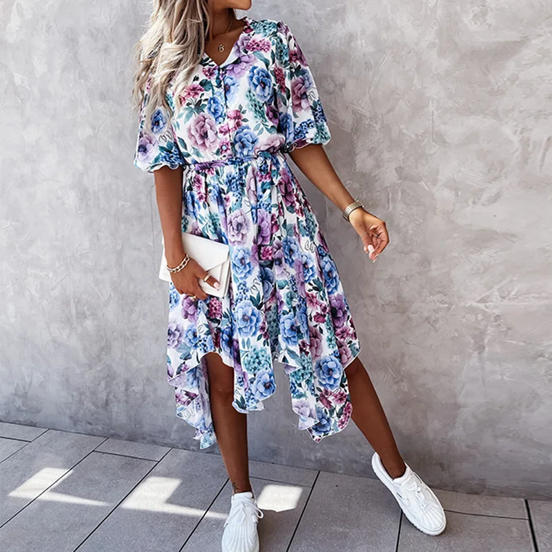 Summer Half Sleeve Floral Print Chiffon Dress Elegant Women V-Neck Button Midi Dress Ladies Fashion Irregular Slim Party Dresses