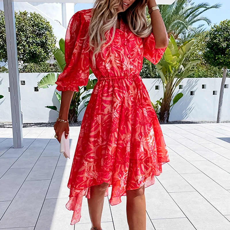 Summer Half Sleeve Floral Print Chiffon Dress Elegant Women V-Neck Button Midi Dress Ladies Fashion Irregular Slim Party Dresses