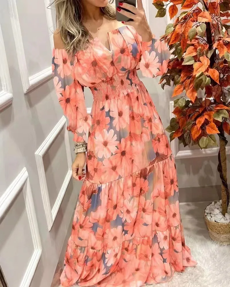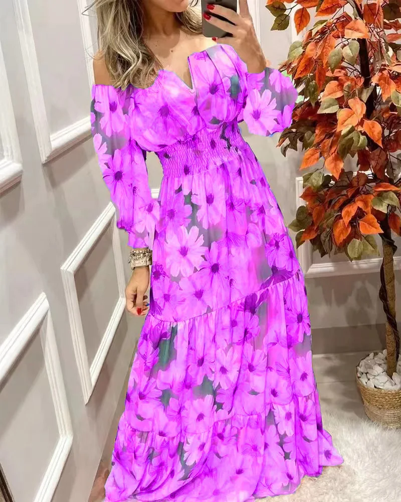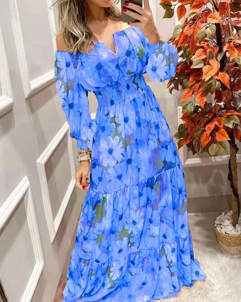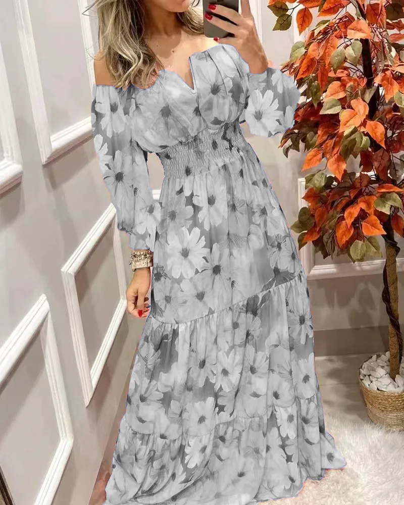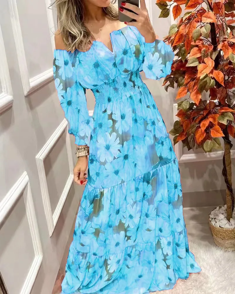 Summer New French Retro One-shoulder V-neck Long-sleeved Dress Women Ruffle Stitching Big Swing Floral Print Maxi Dress Femme