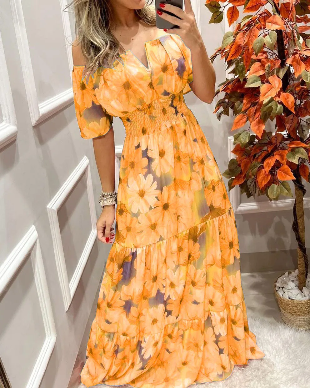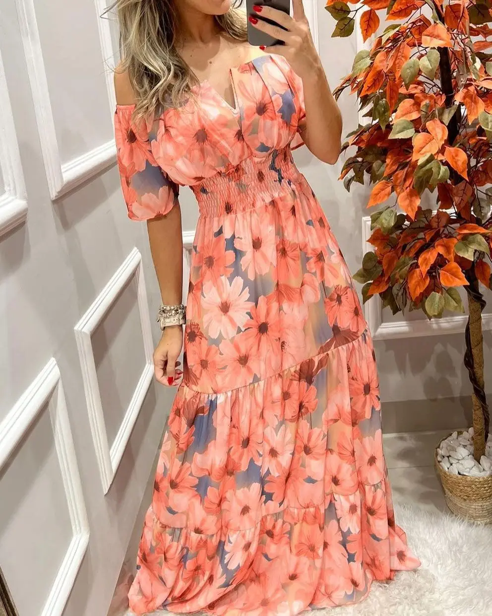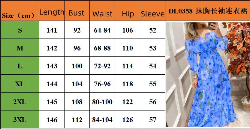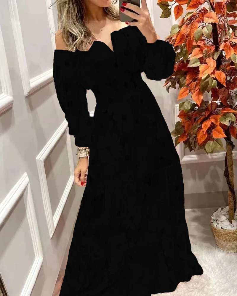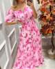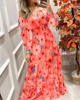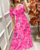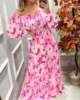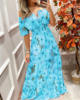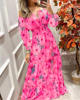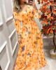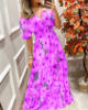 Summer New French Retro One-shoulder V-neck Long-sleeved Dress Women Ruffle Stitching Big Swing Floral Print Maxi Dress Femme