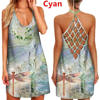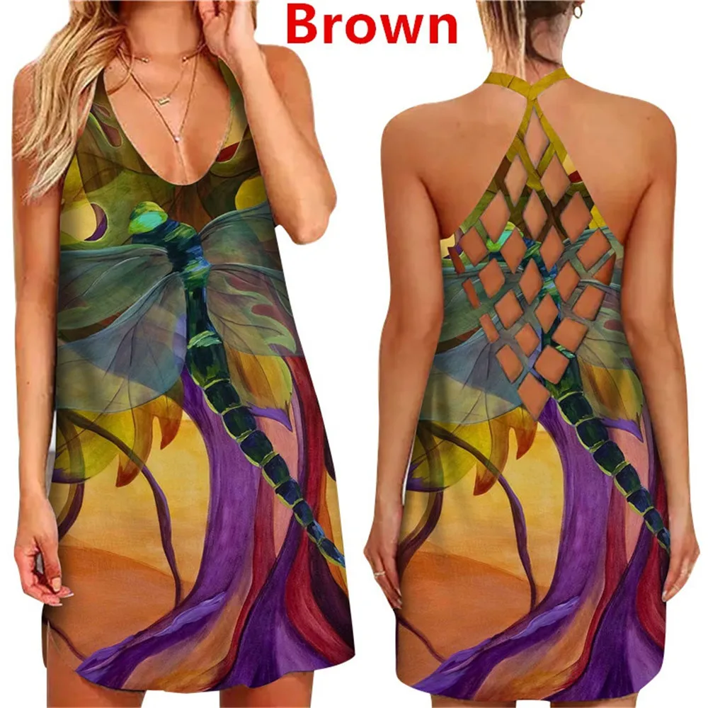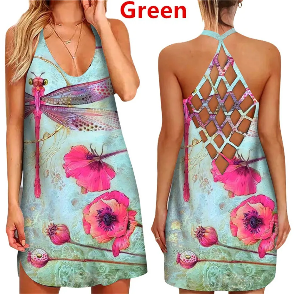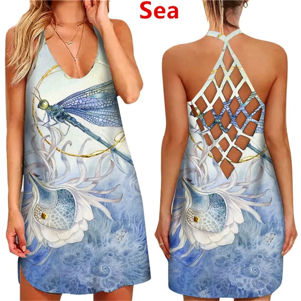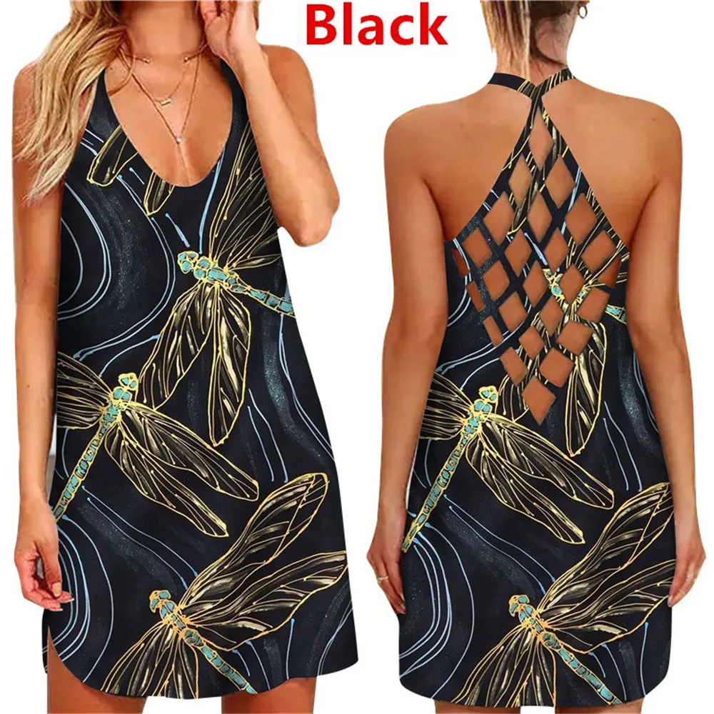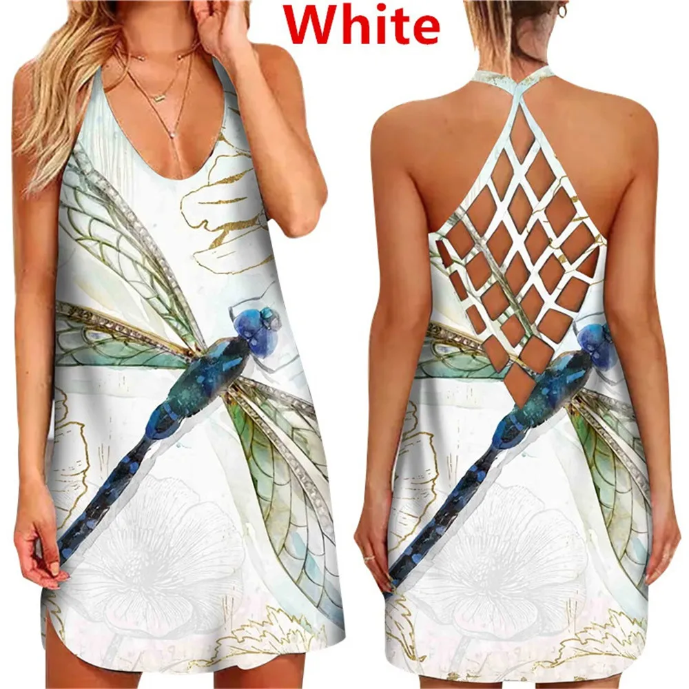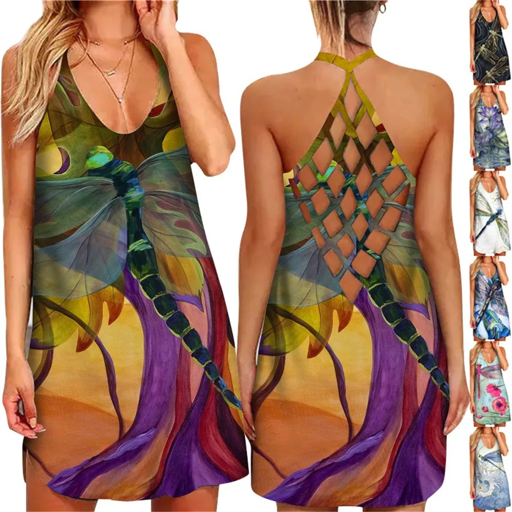 summer new women's dress V-neck sleeveless dragonfly print women's short skirt Sexy Cutout Casual Vacation Beachwear Beach Dress