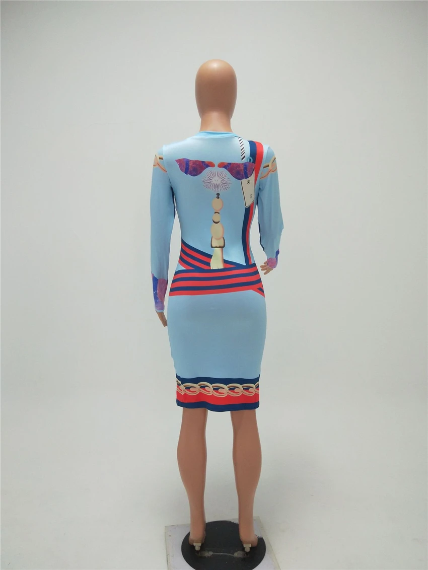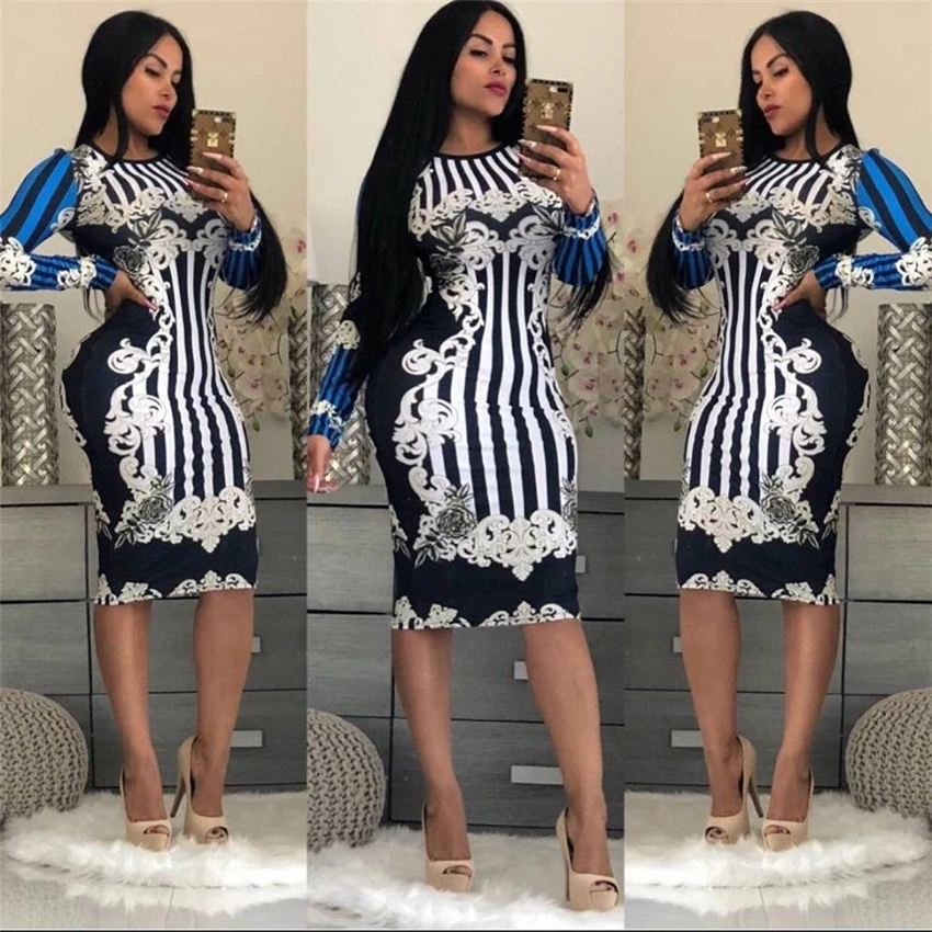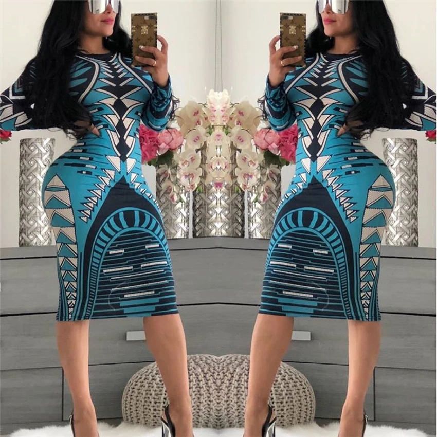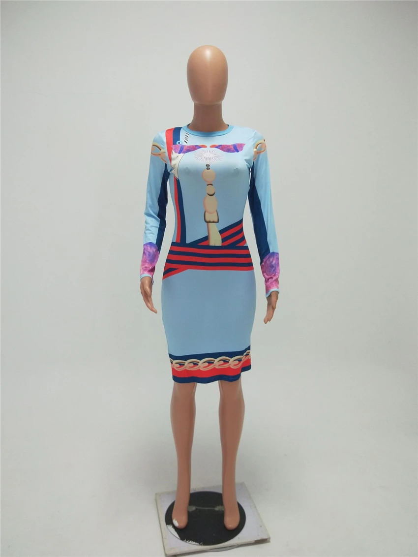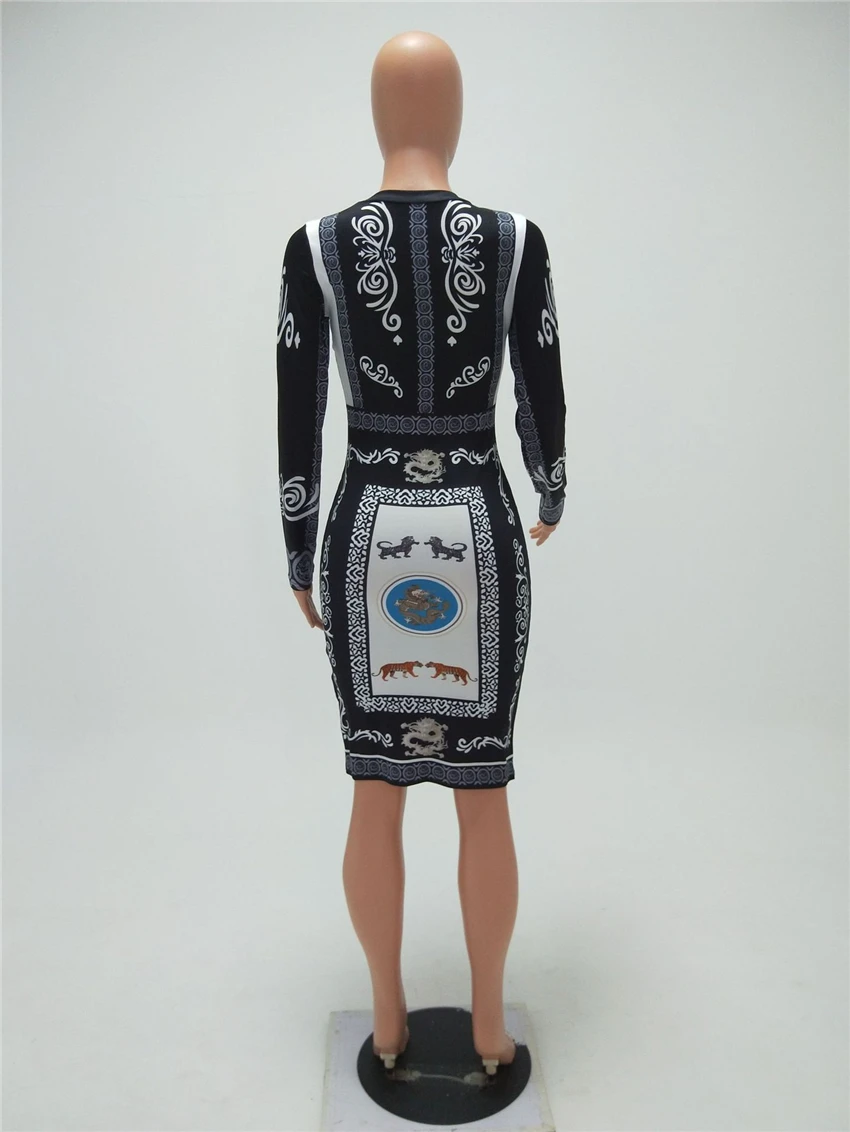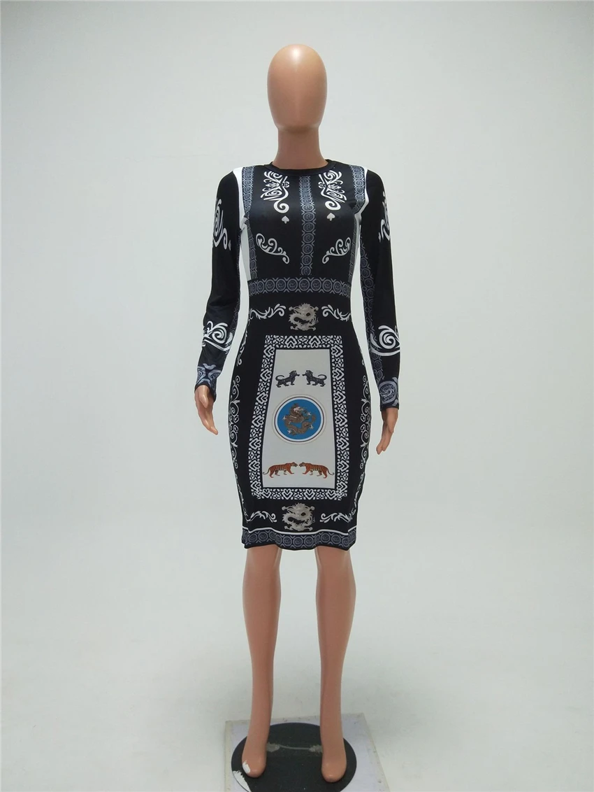 Summer Print Novelty Bandage Bodycon Dress Women Long Sleeve Knee-length Casual Dress Elegant Slim Midi Party Dresses vestidos