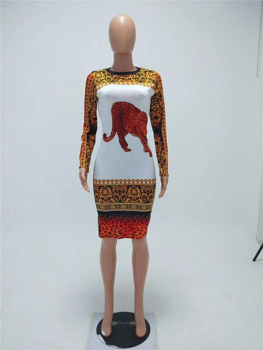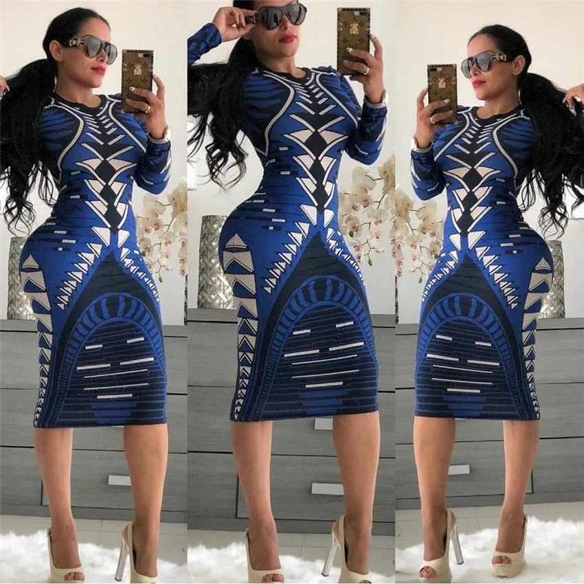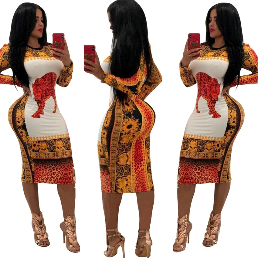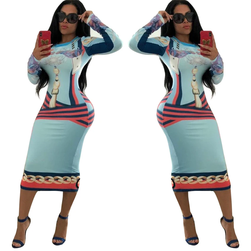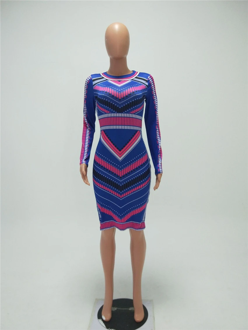 Summer Print Novelty Bandage Bodycon Dress Women Long Sleeve Knee-length Casual Dress Elegant Slim Midi Party Dresses vestidos