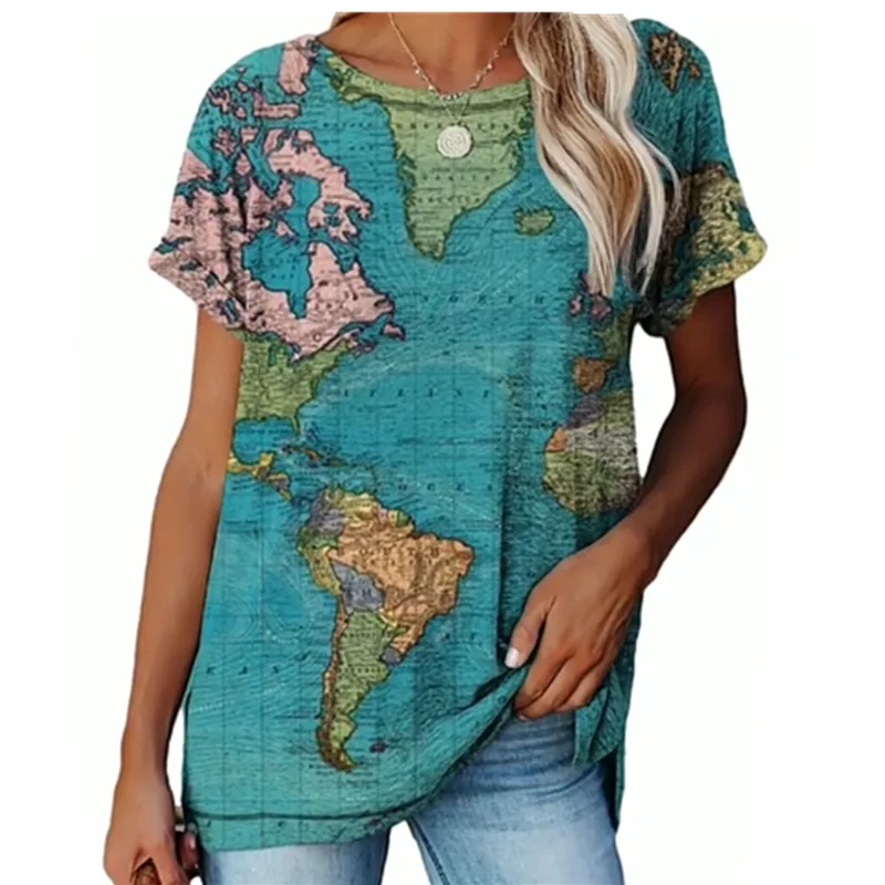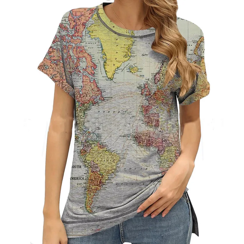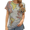 Summer Retro Geometric Pattern T-shirt Round Neck Casual Simple Women's Tops Map Printing Short-sleeved Pullover T-shirt