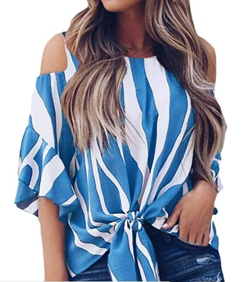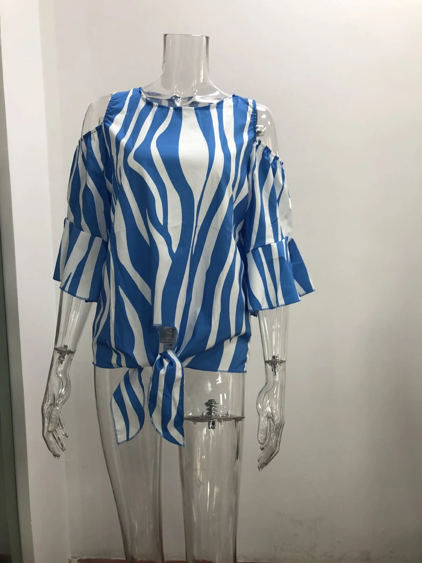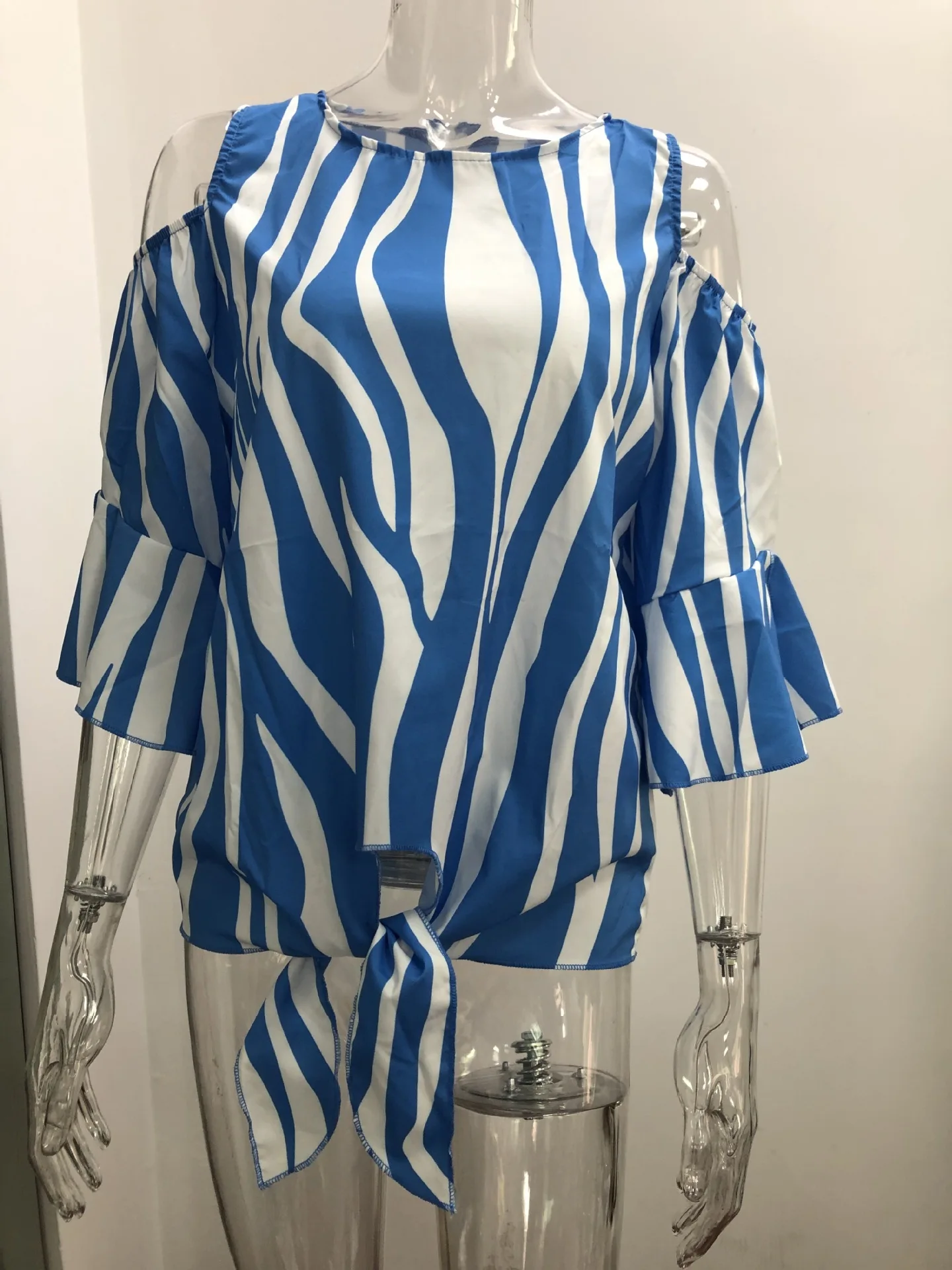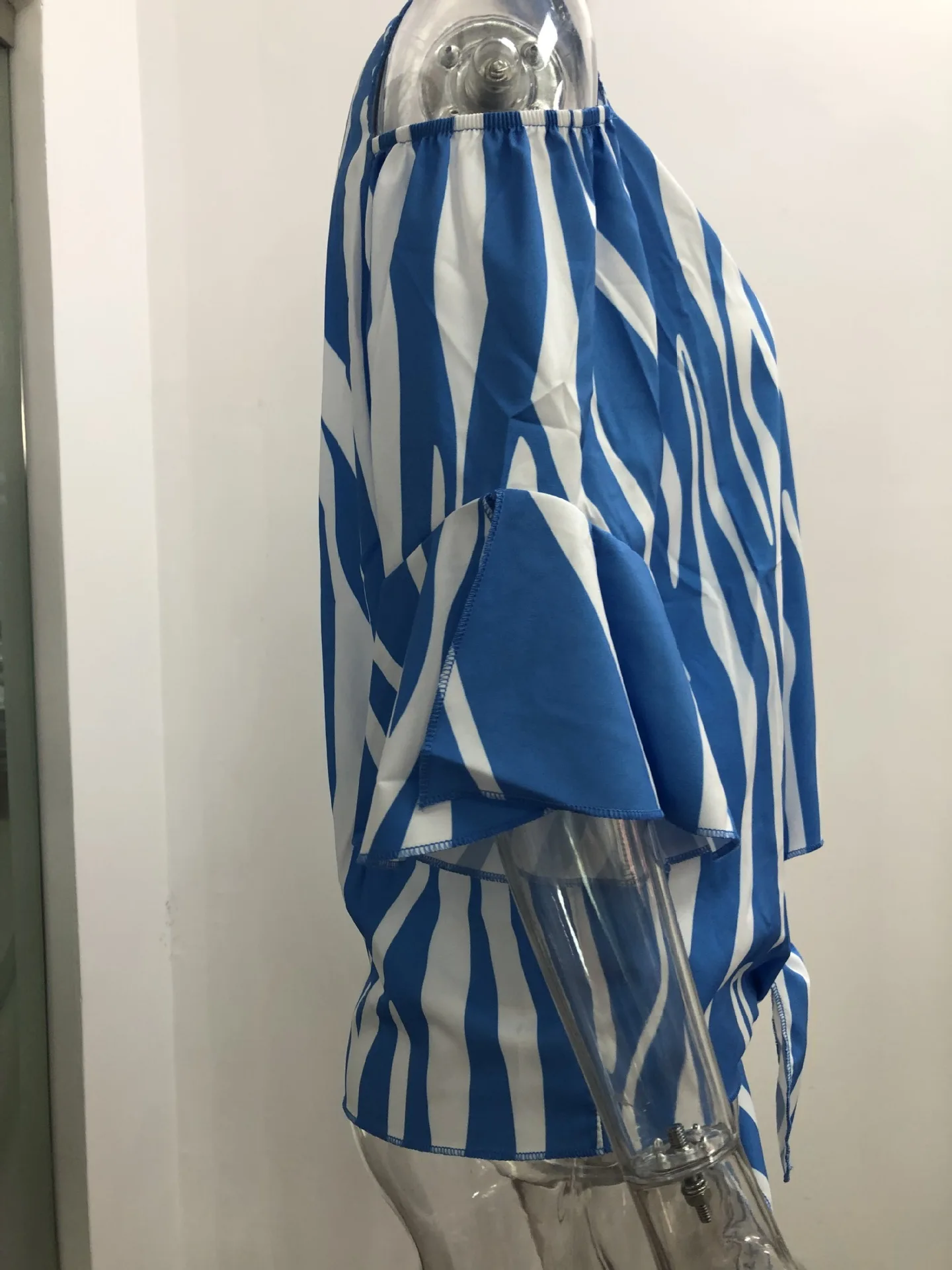 Summer Shirts 2022 Woman Striped Pirnted O-Neck Half Sleeve Blouse Female Fashion Loose Streetwear Sexy Ladies Blue Tops Femme