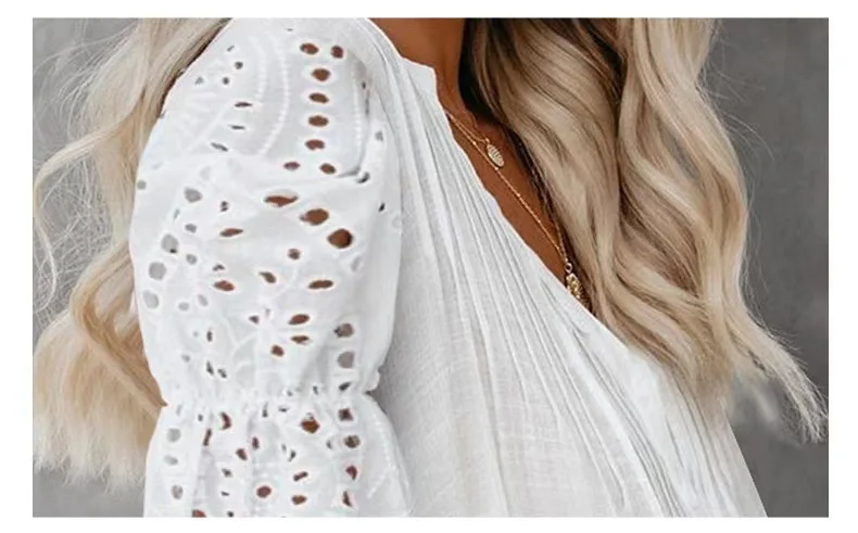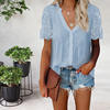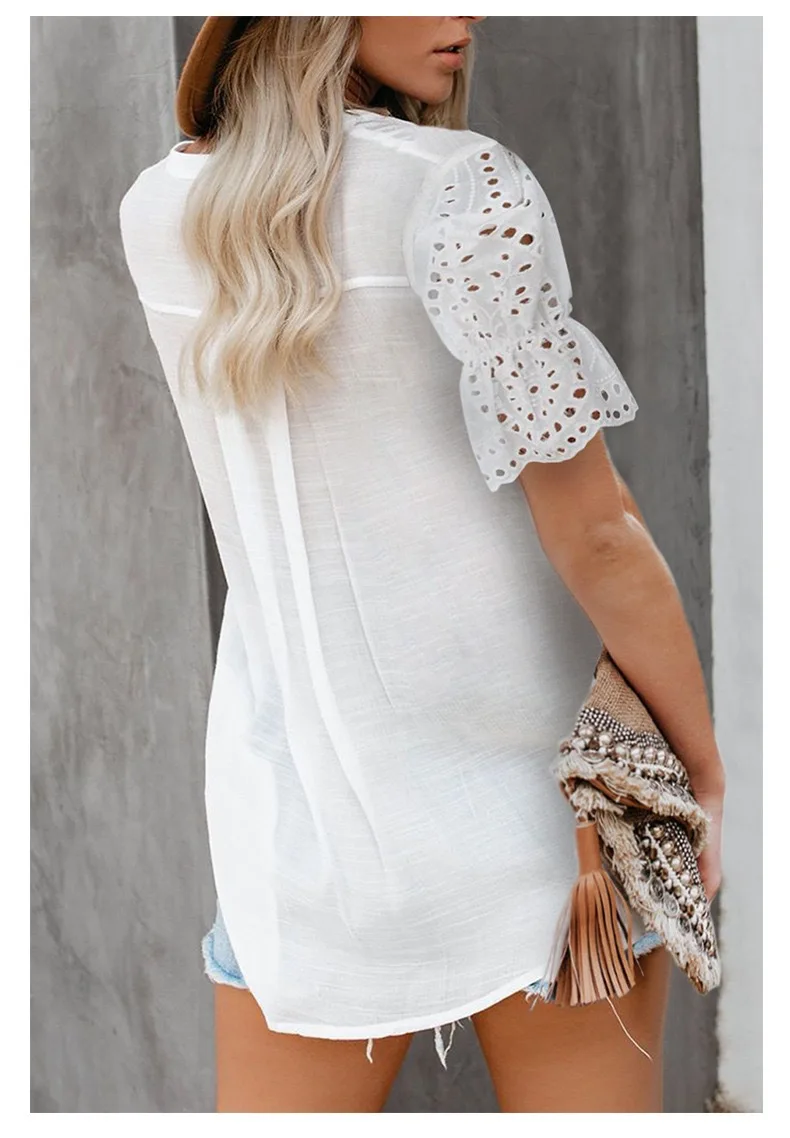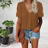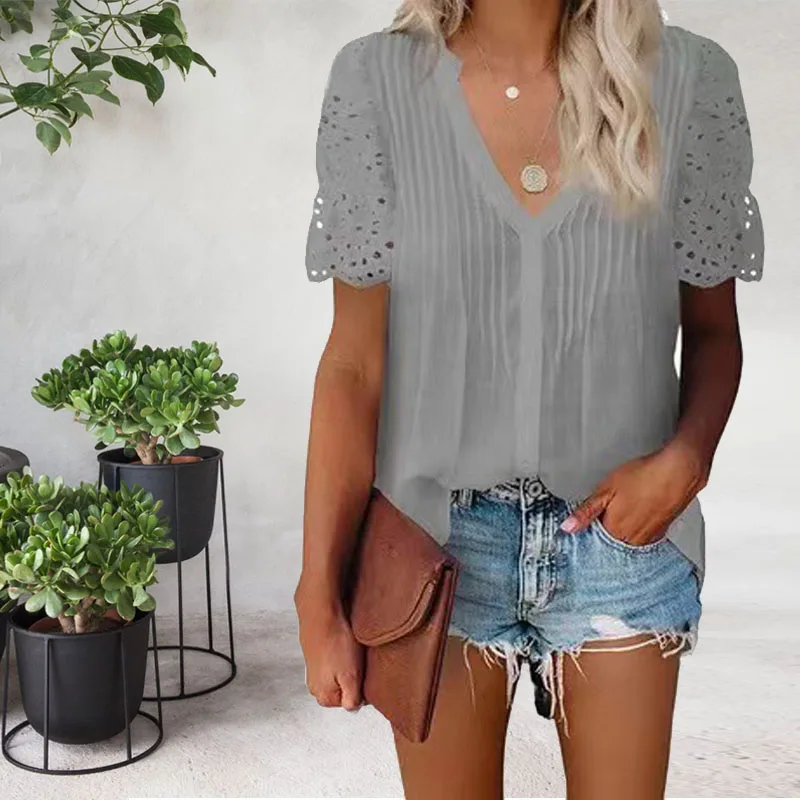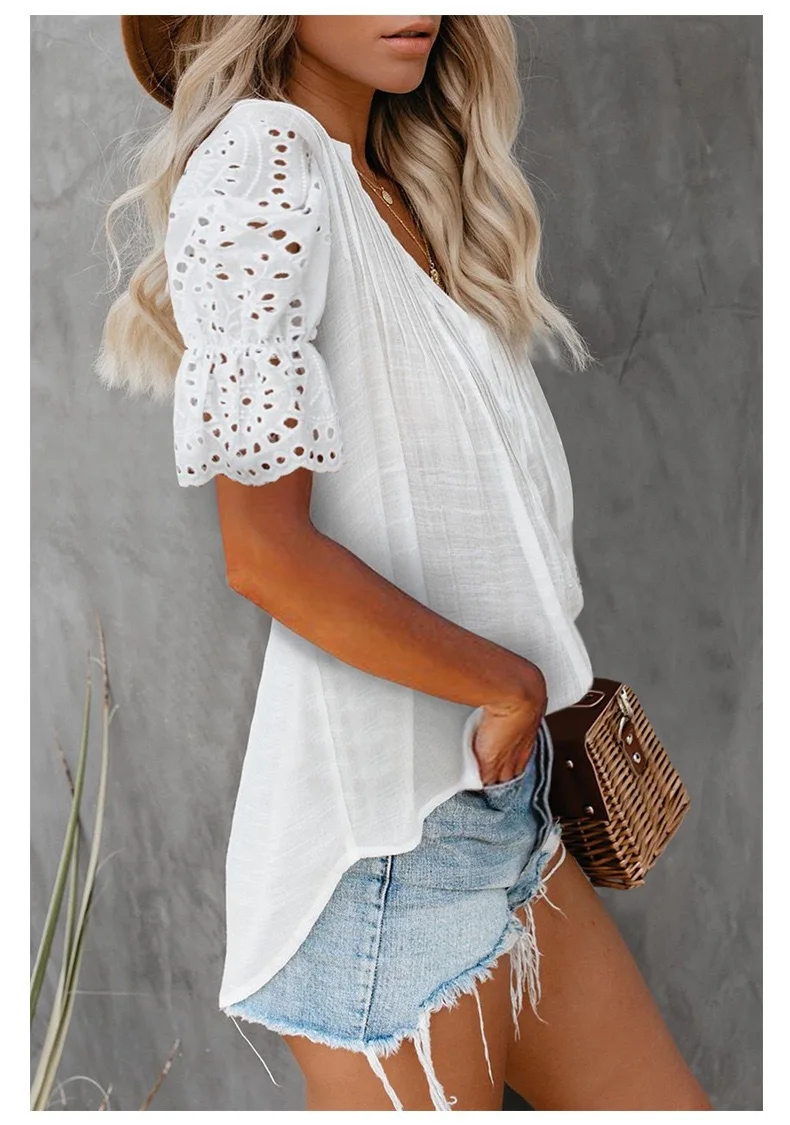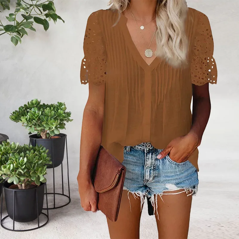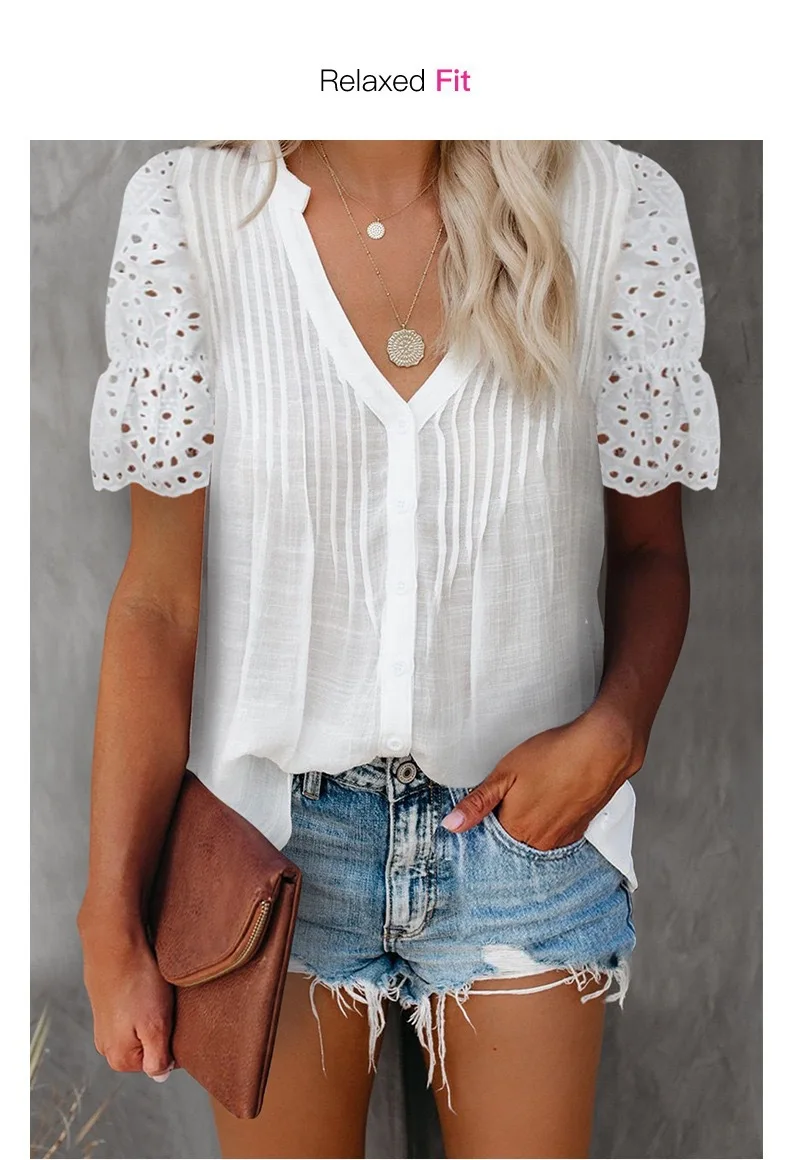 Summer Solid Color V-neck Pleated Lace Stitching Short-sleeved Shirt Casual Elegant Chiffon Shirt 6 Colors Size