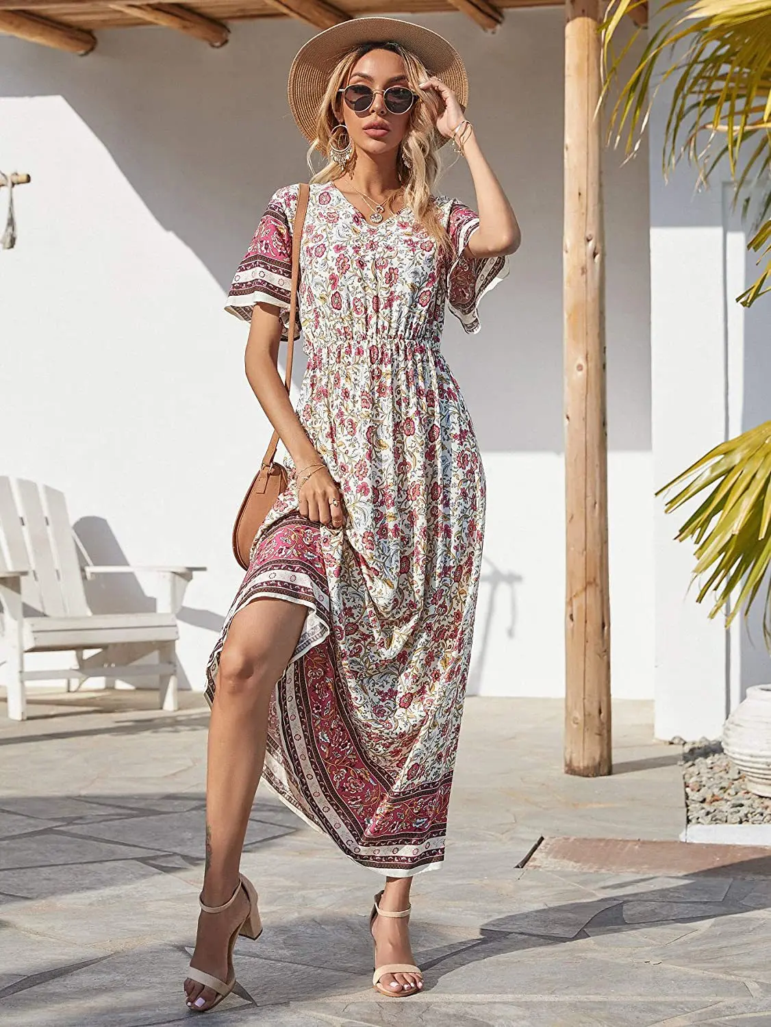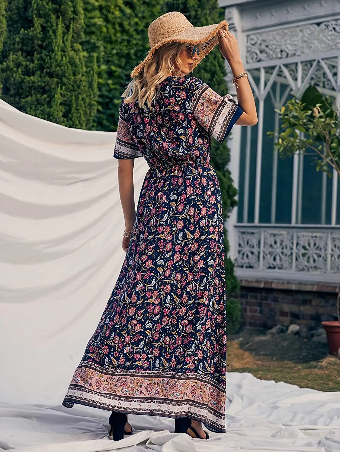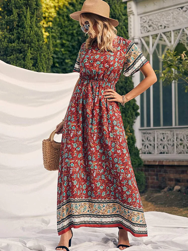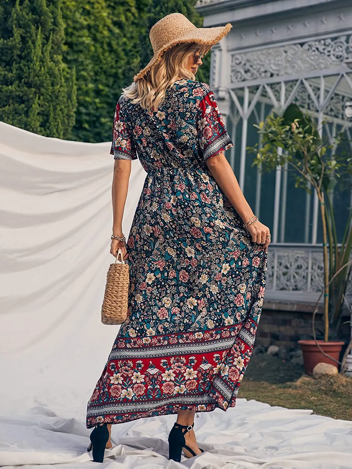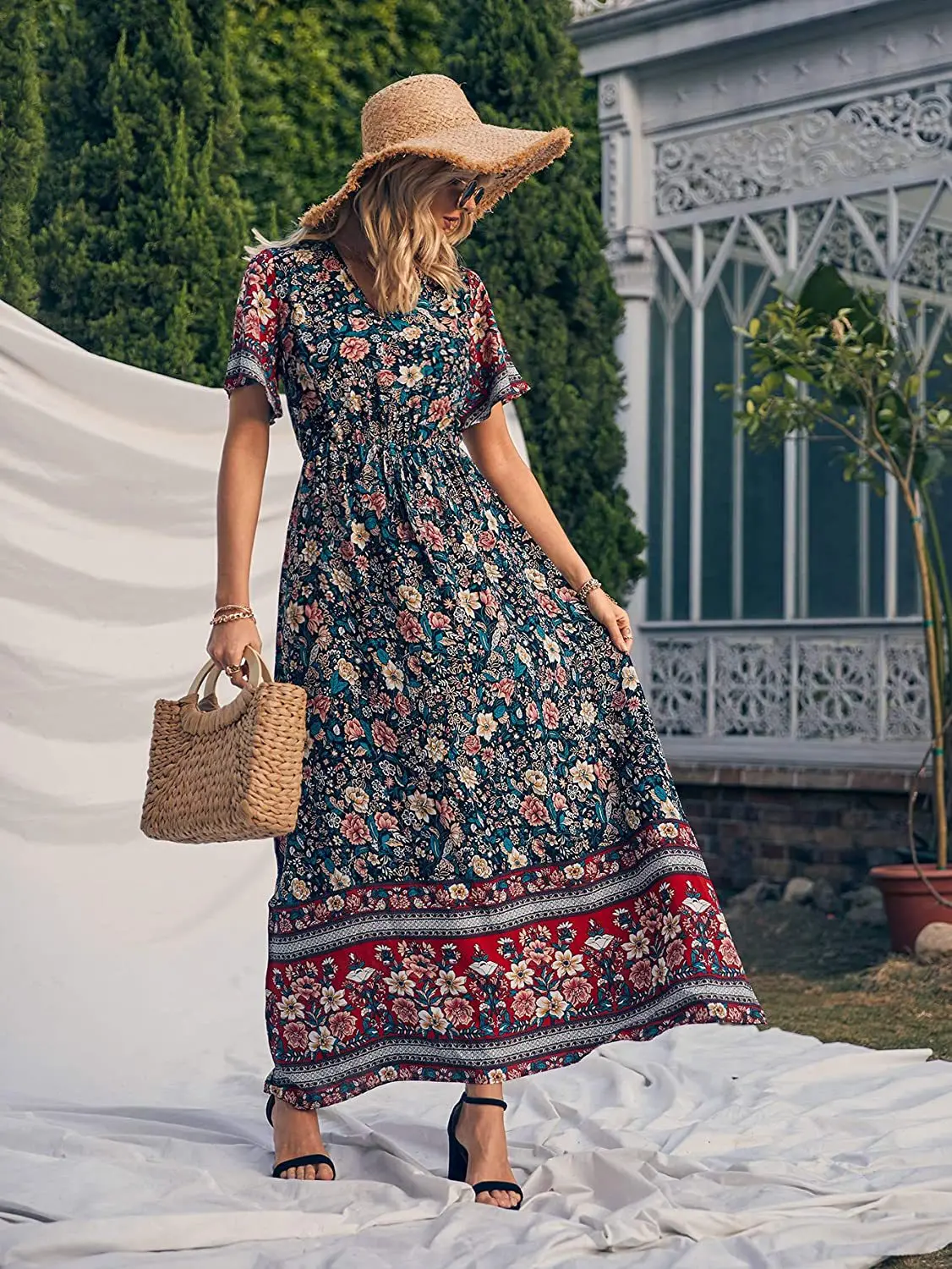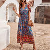 Summer Women Maxi Dresses Elegant Classic High Quality Boho Lady V-Neck Slim Elastic Waist Floral Print Holiday Beach Long Skirt