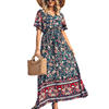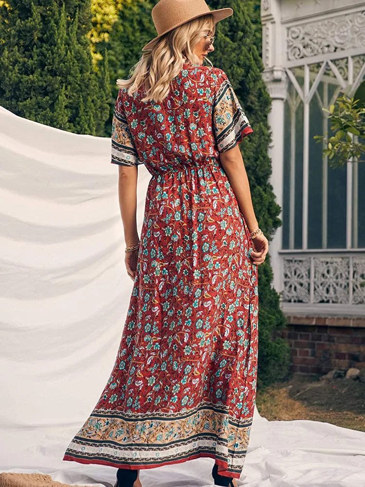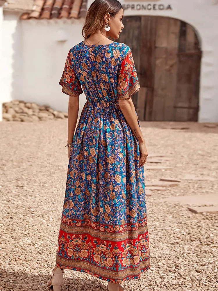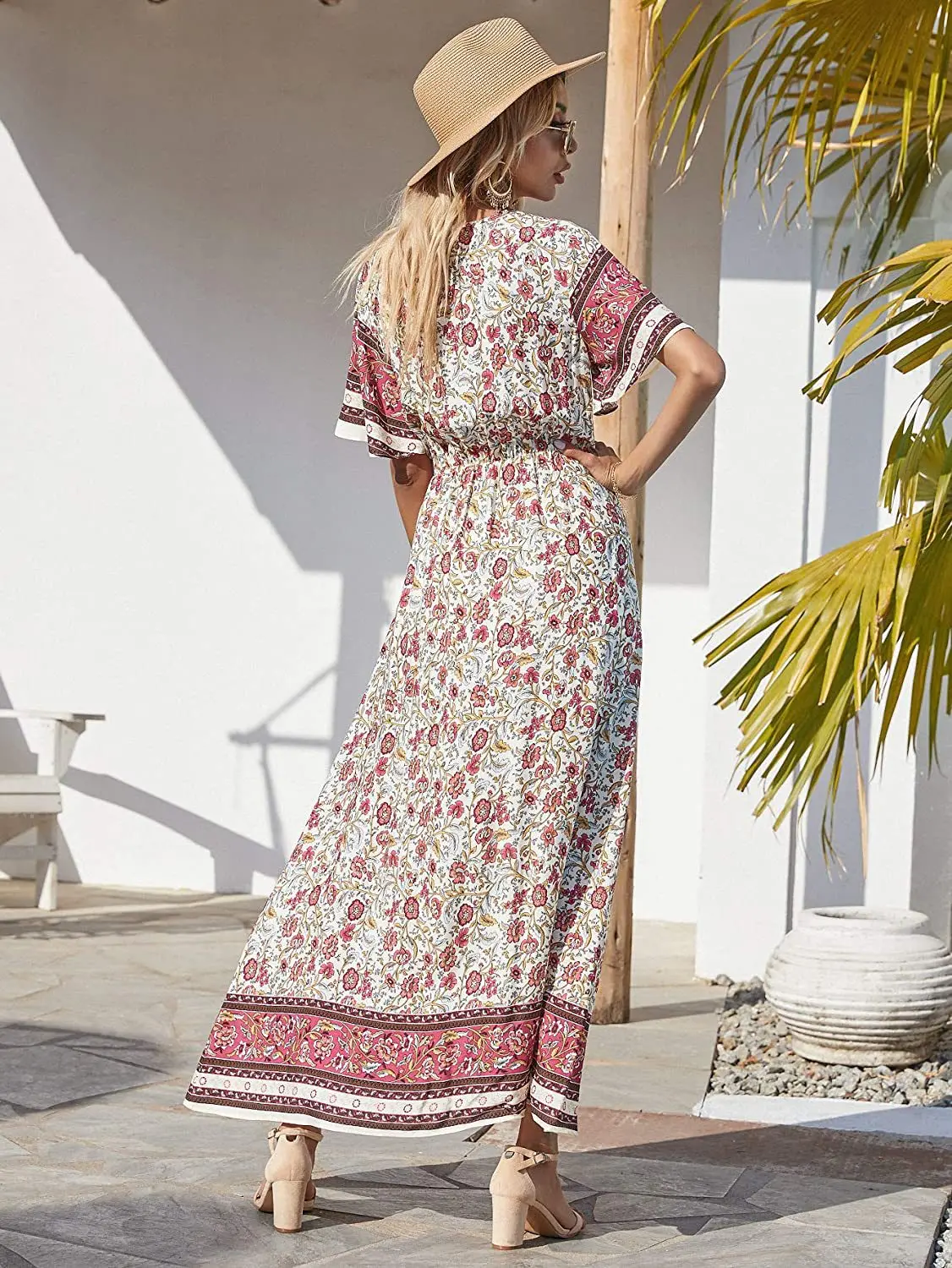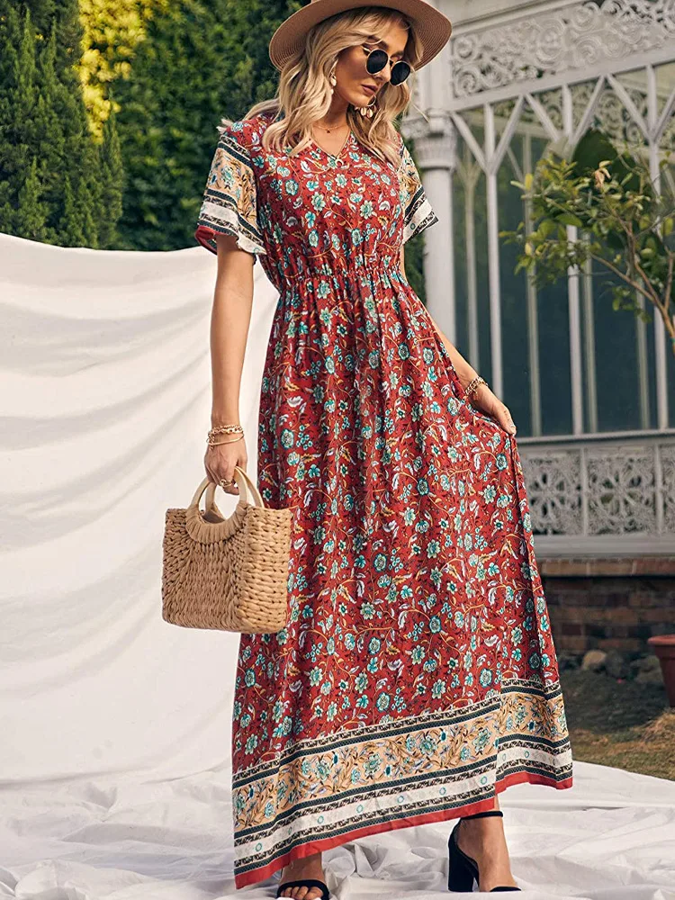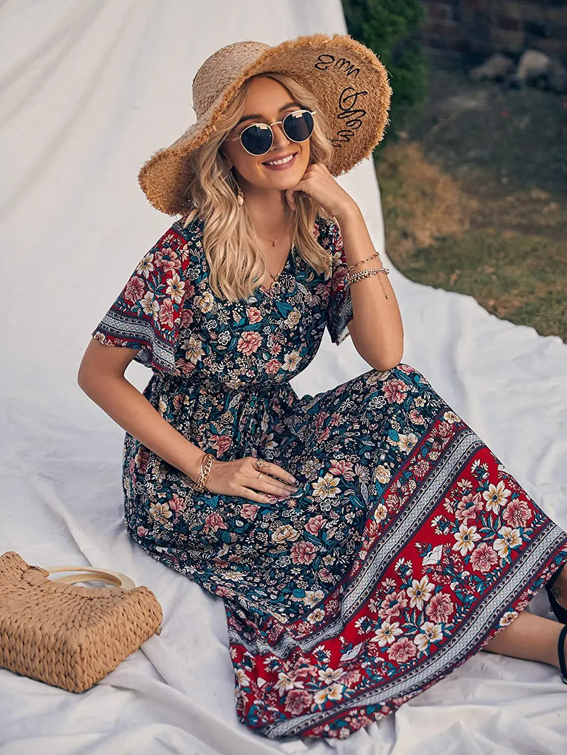 Summer Women Maxi Dresses Elegant Classic High Quality Boho Lady V-Neck Slim Elastic Waist Floral Print Holiday Beach Long Skirt