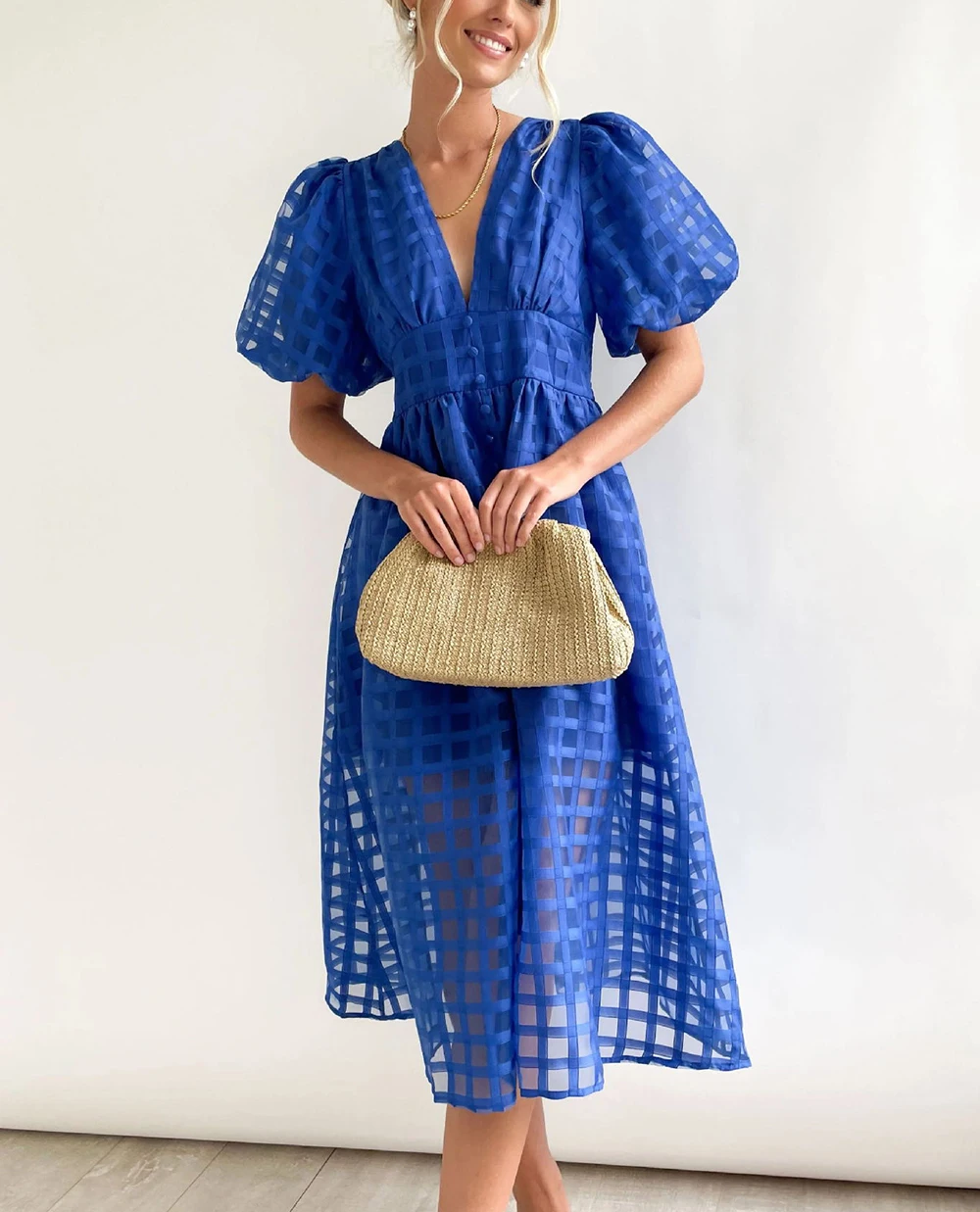 Summer Women’s Dress 2024 V Neck Sexy Midi Vintage Transparent Dress A-line Puff Sleeve Split Party Elegant Dresses for Women