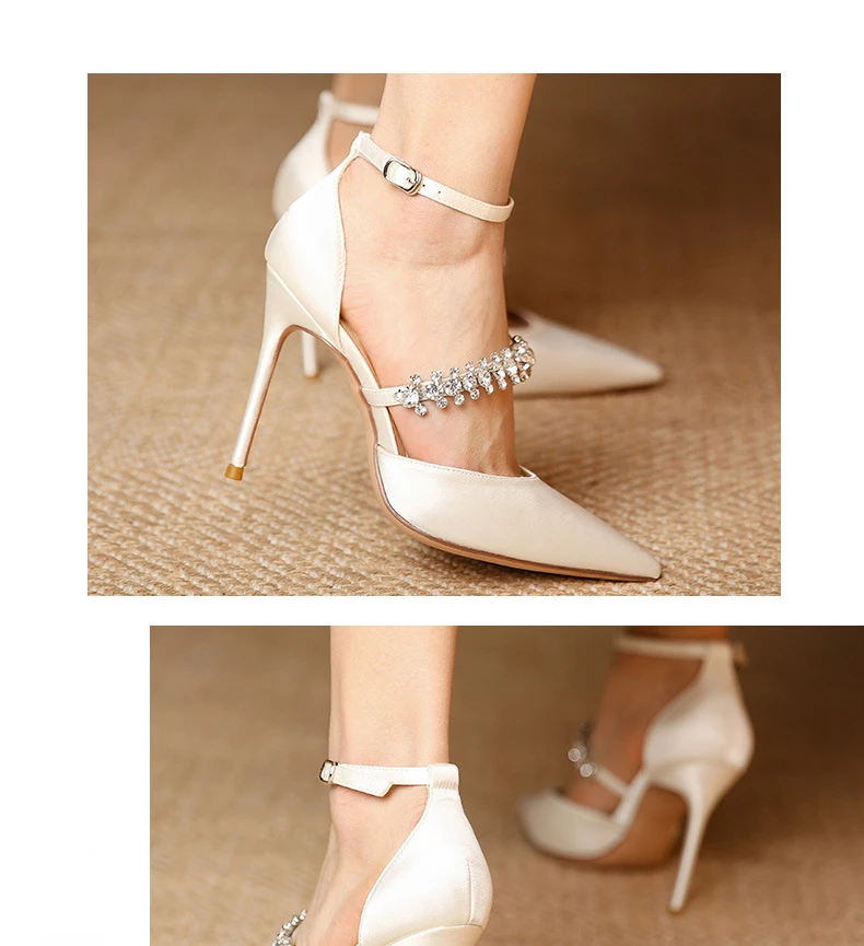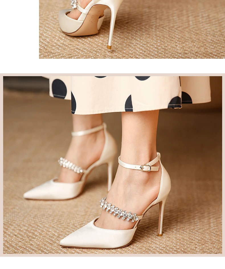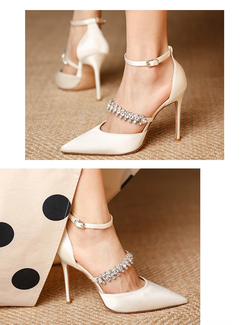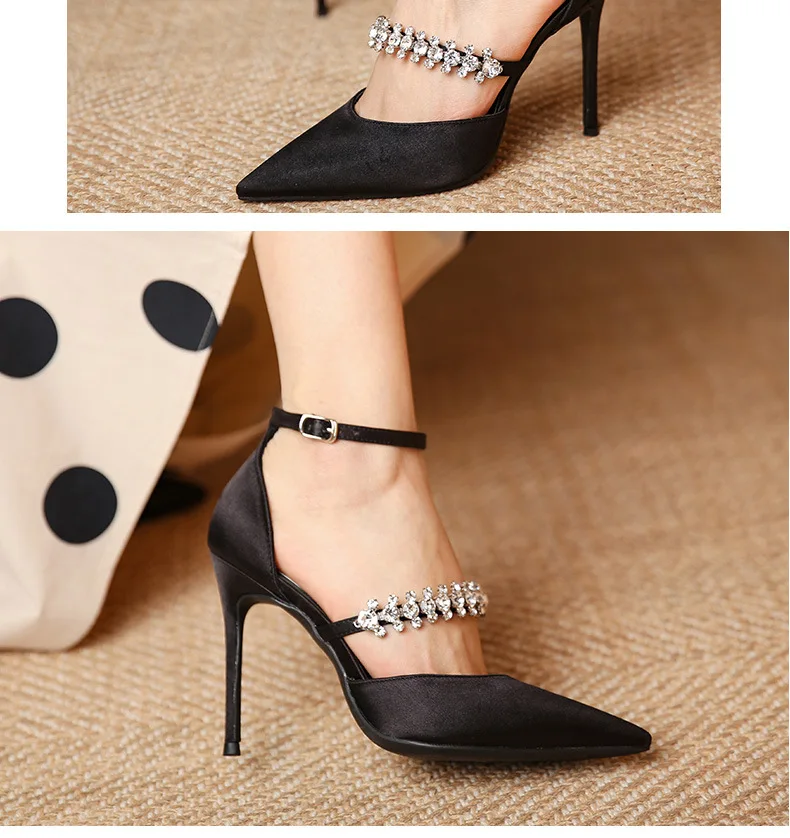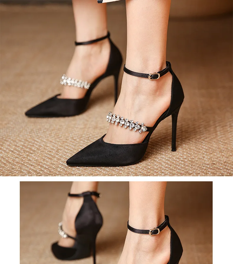 Summer Women's Satin Solid Color Buckle High Heels Fashion Pointed Toe Stiletto Fairy Bow Toe Rhinestone Banquet Sandals