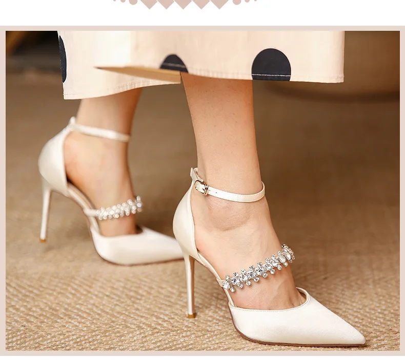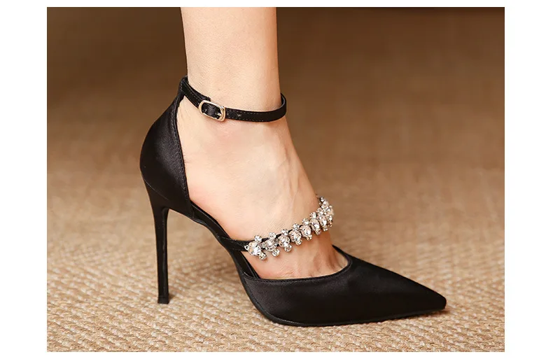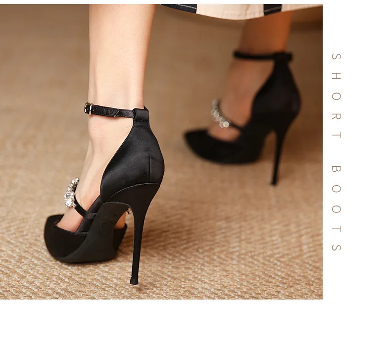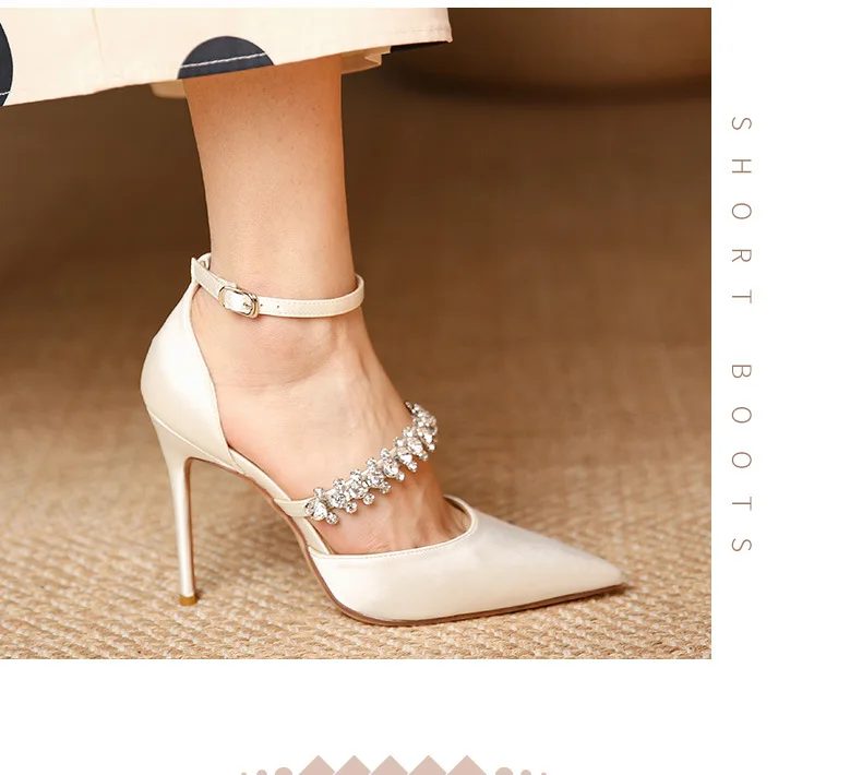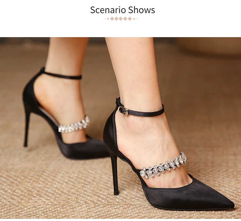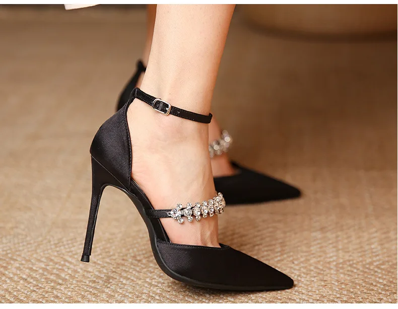 Summer Women's Satin Solid Color Buckle High Heels Fashion Pointed Toe Stiletto Fairy Bow Toe Rhinestone Banquet Sandals