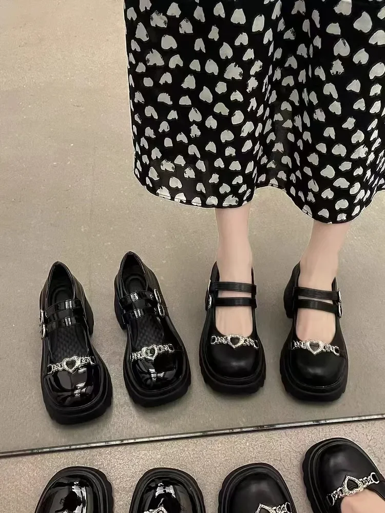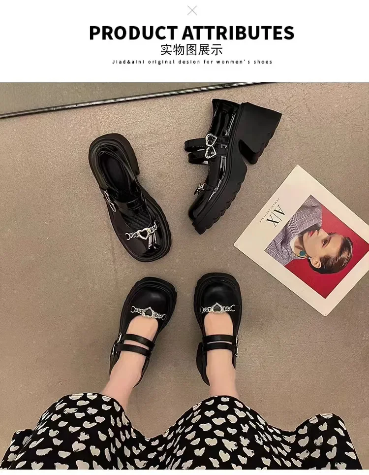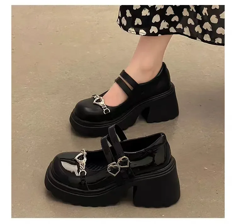 Sweet Heart-Shaped Buckle Lolita Shoes Women Patent Leather Platform Mary Janes Woman Metal Decoration Chunky Heels Pumps