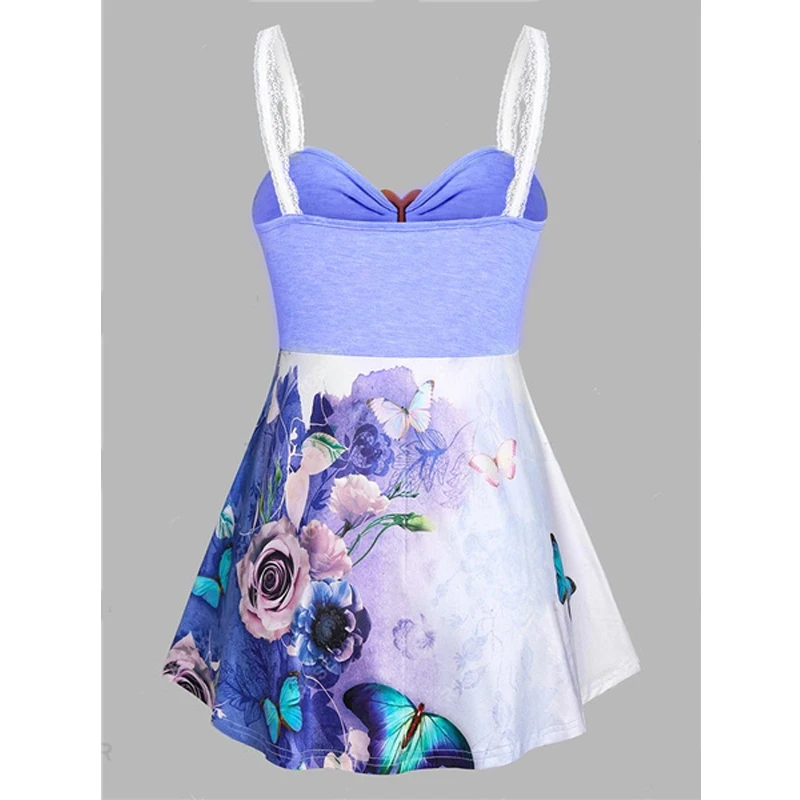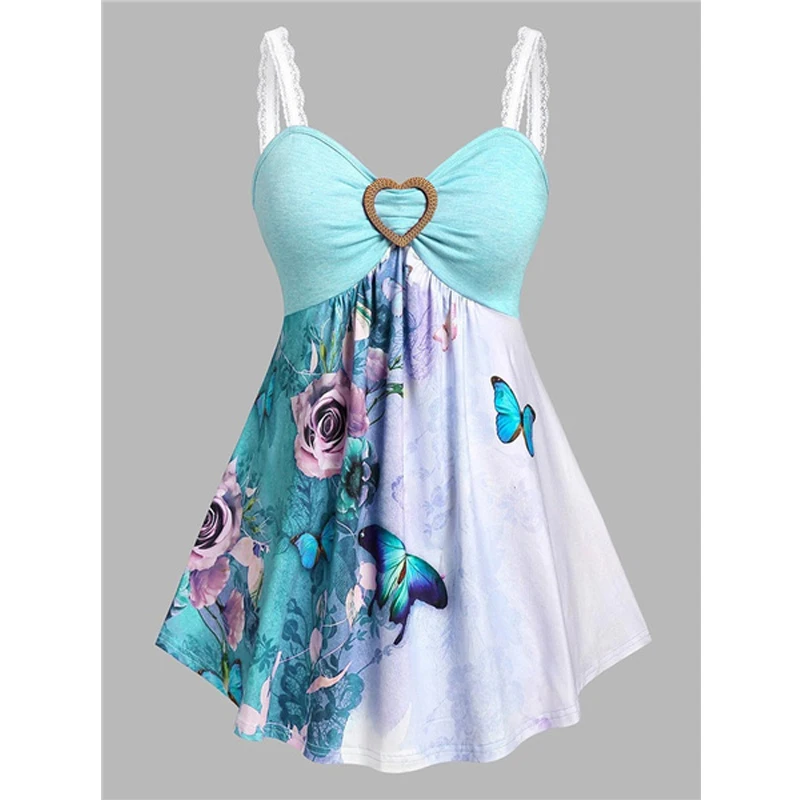 Tank Top Women Summer Fashion Heart Ring V Neck Butterfly Printed Tops Casual Lace Shoulder Straps Sleeveless Backless Blouse
