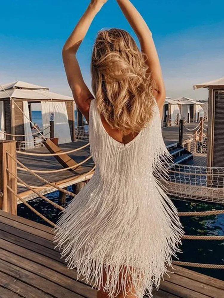 Tassel Design Sexy V Neck Sleeveless Party Dress Women