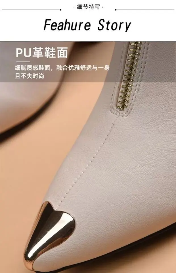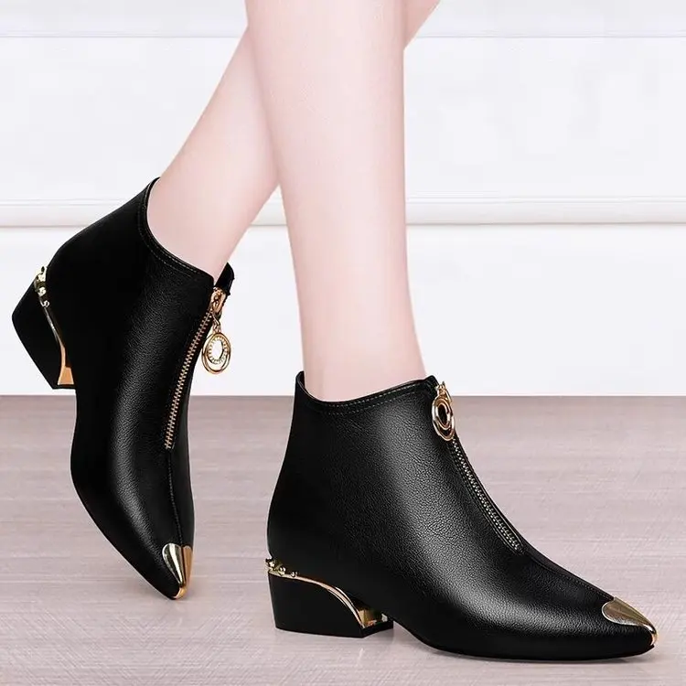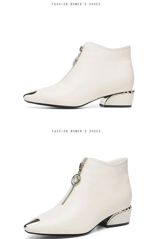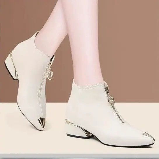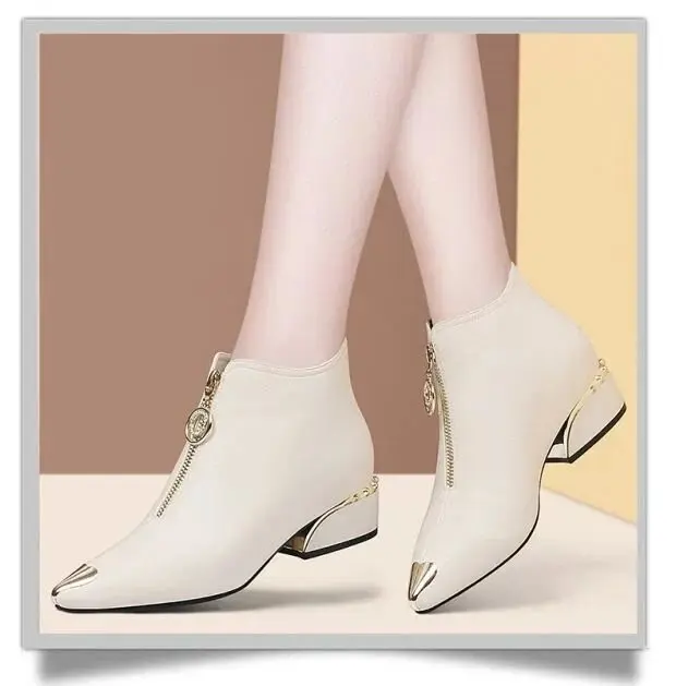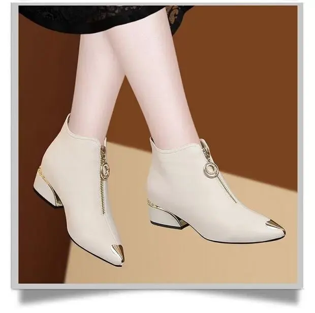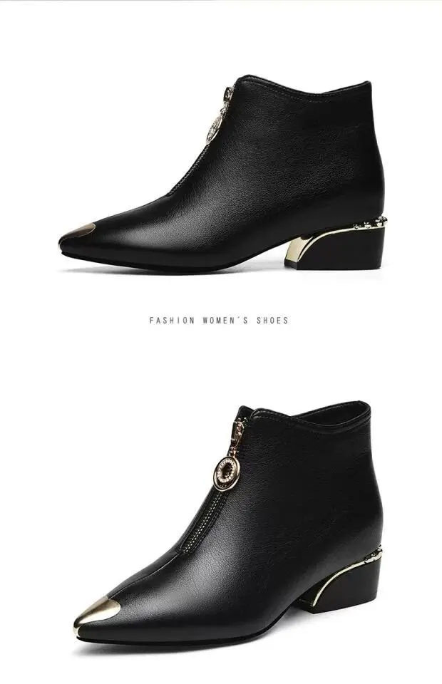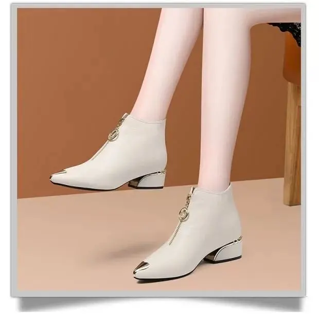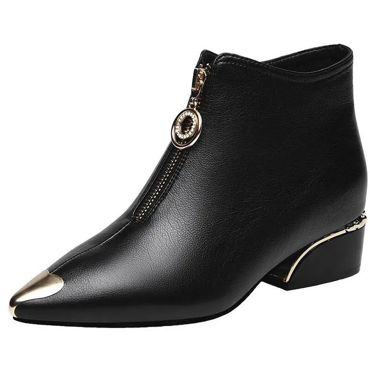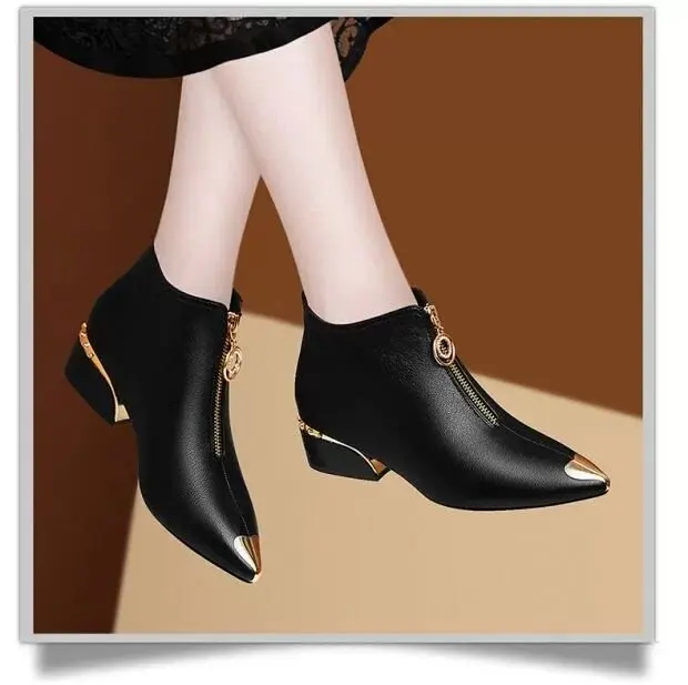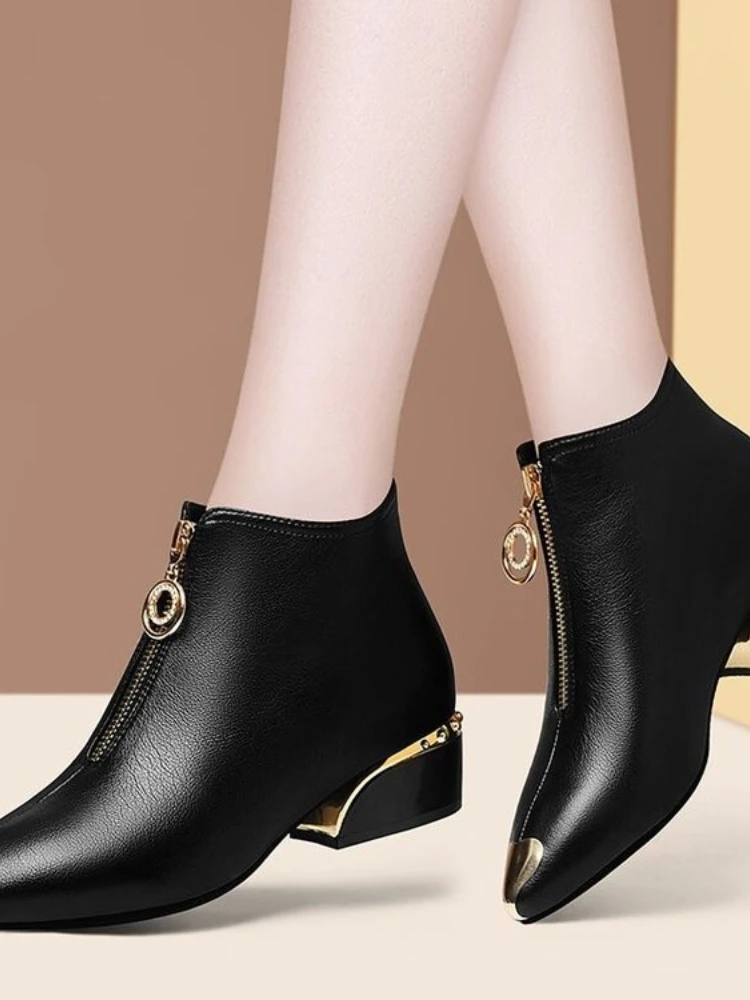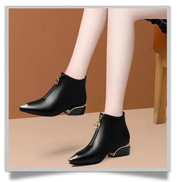 Top Brand Plus Velvet Short Boots Women Autumn and Winter 4cm High Heels 2023 New Metal Pointed Ankle Boots Thick Heel