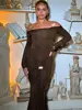 Tossy Autumn Fashion Backless Long Dress High Waist Slim Pleated Patchwork Solid Off-Shoulder Party Dress Women’s Bodycon Dress