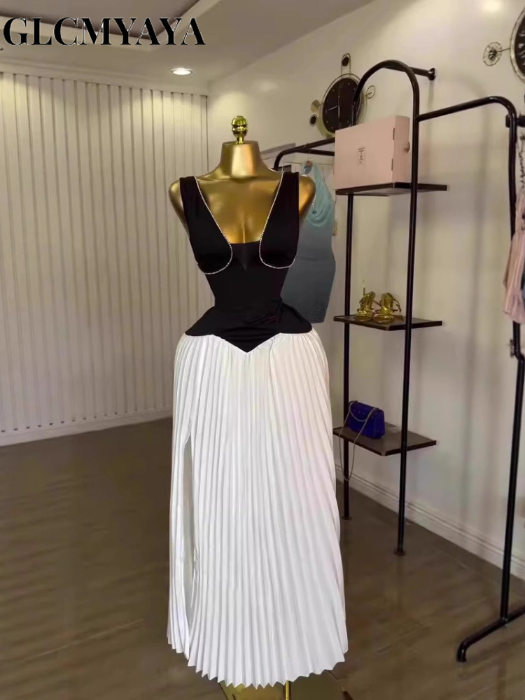 Tossy Autumn Sleeveless Patchwork Maxi Dress Women’s Contrast High Waist Slim Elegant Vintage Party Dress Female Sexy Dress 2025