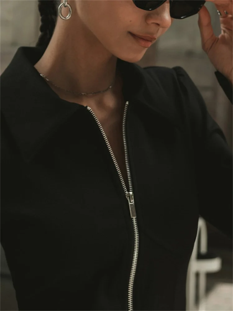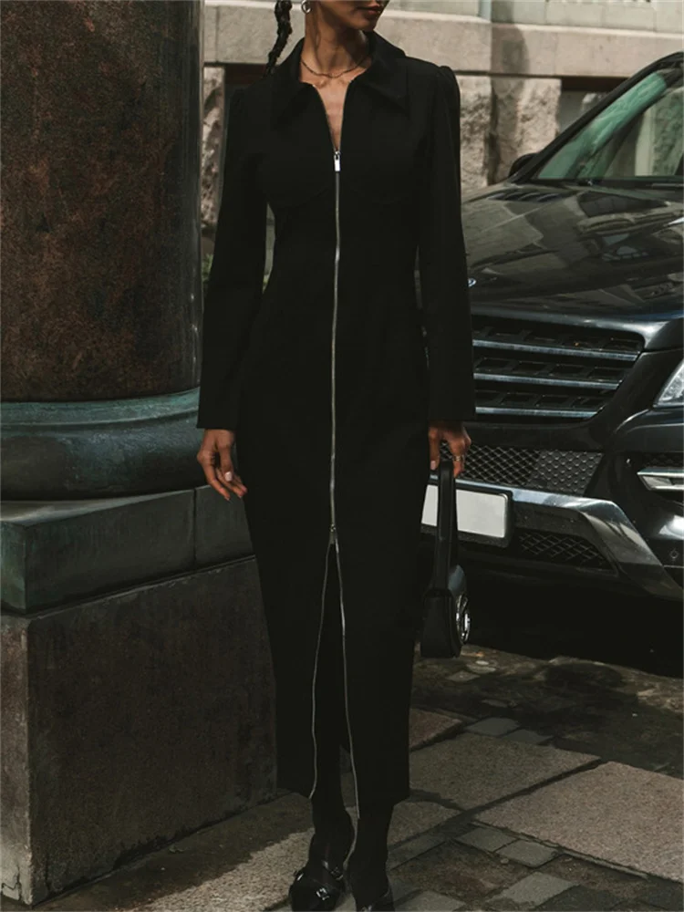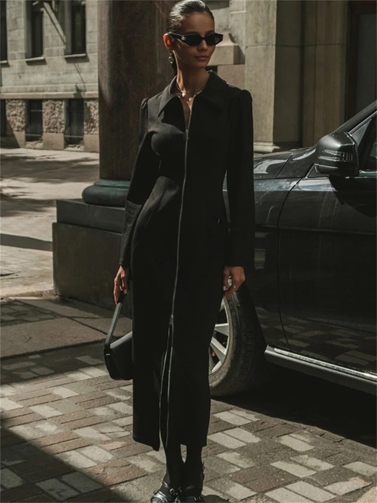 Tossy Black Zipper Lapel Maxi Dress For Women Cardigan Fashion Patchwork Vintage Slim High Waist Elegant Streetwear Women Dress