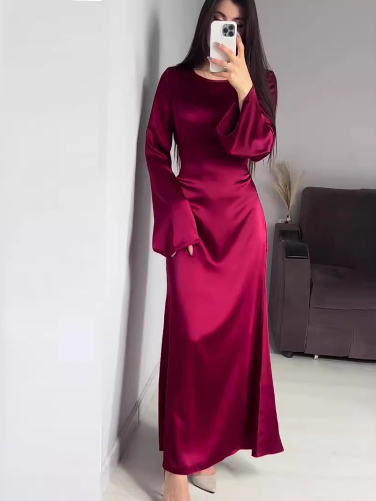 Tossy Elegant Satin High Waist Women Maxi Dress Bell Sleeve Lace Up Slim Banquet Mermaid Bodycon Dresses Throbbing in Autumn