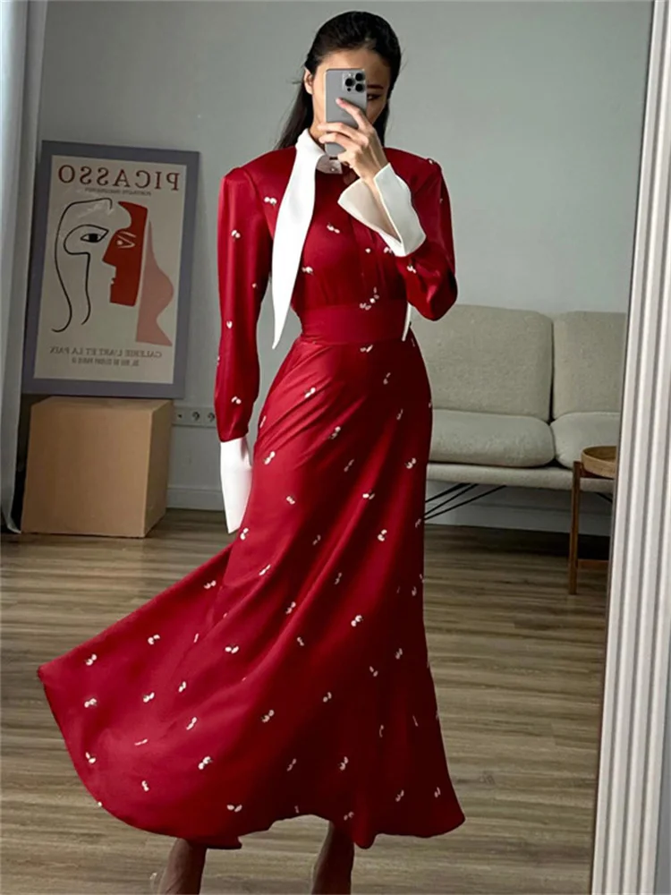 Tossy Elegant Satin Printed Long Dress Women’s High Waist Patchwork Commute Slim Autumn 2024 Contrast Dress Female Maxi Dress