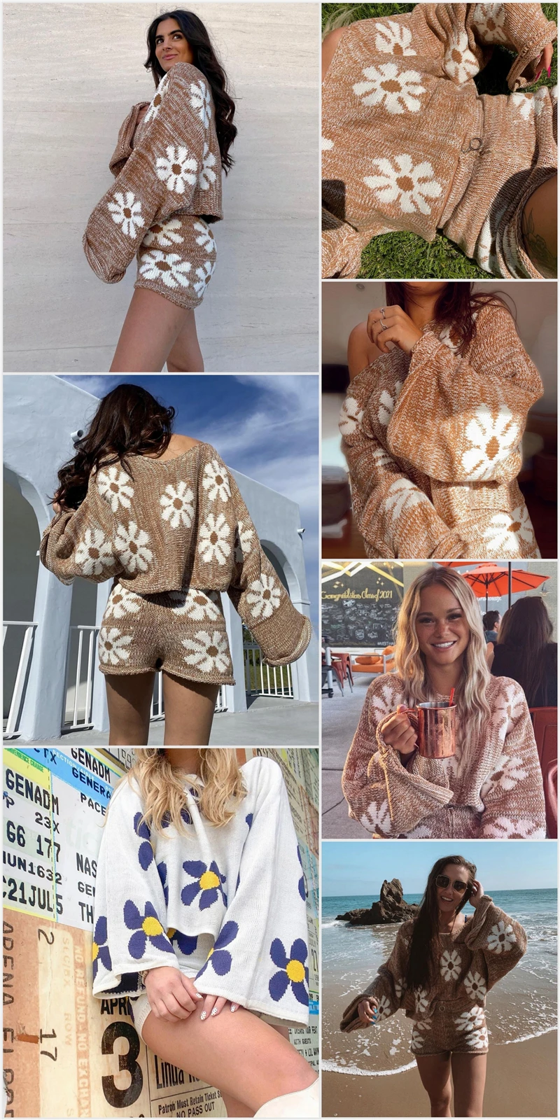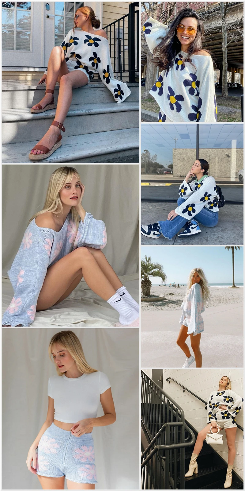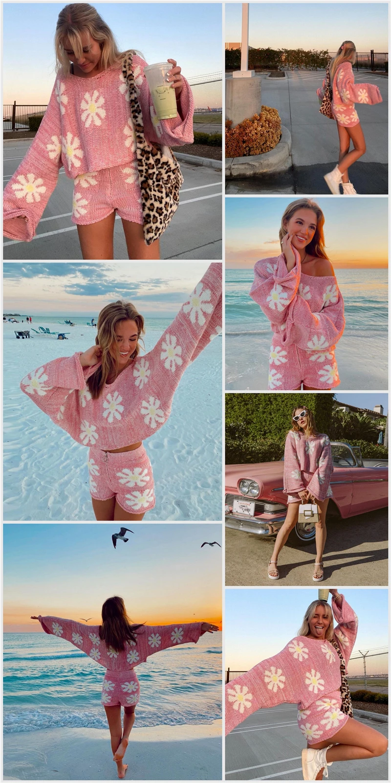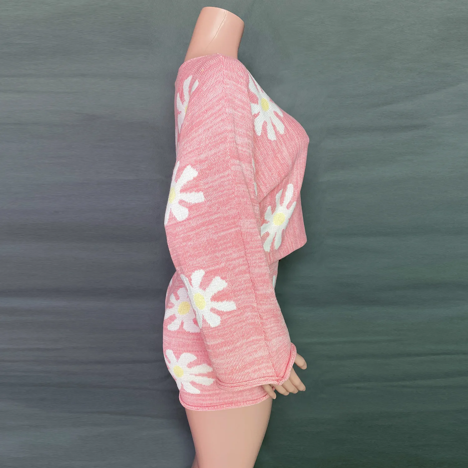 Tossy Knitted Women’s 2 Piece Sets Outfits Casual Pink Floral Sweet Oversized Sweater Suit With Shorts For Women 2022 Tracksuit