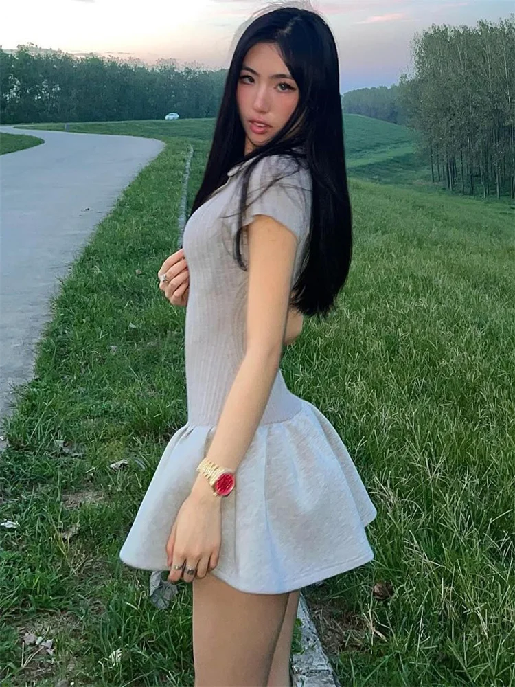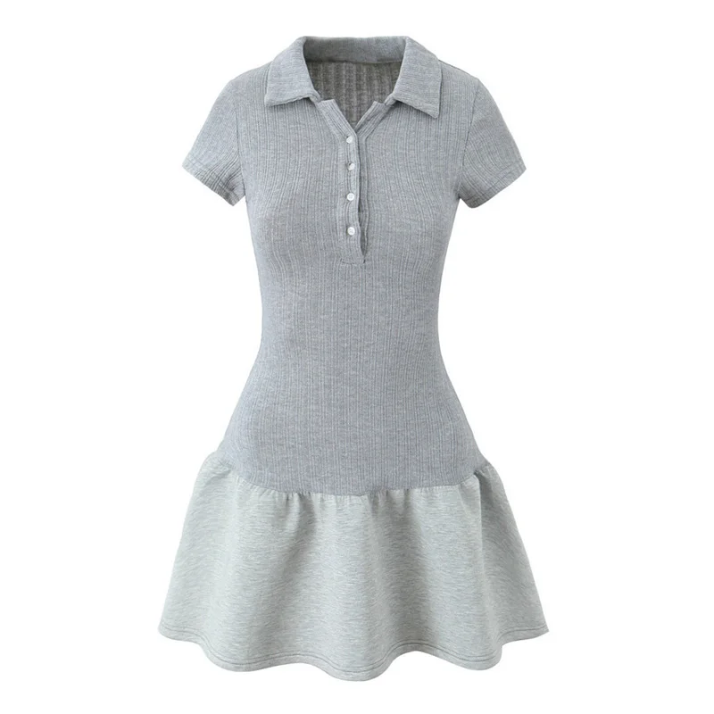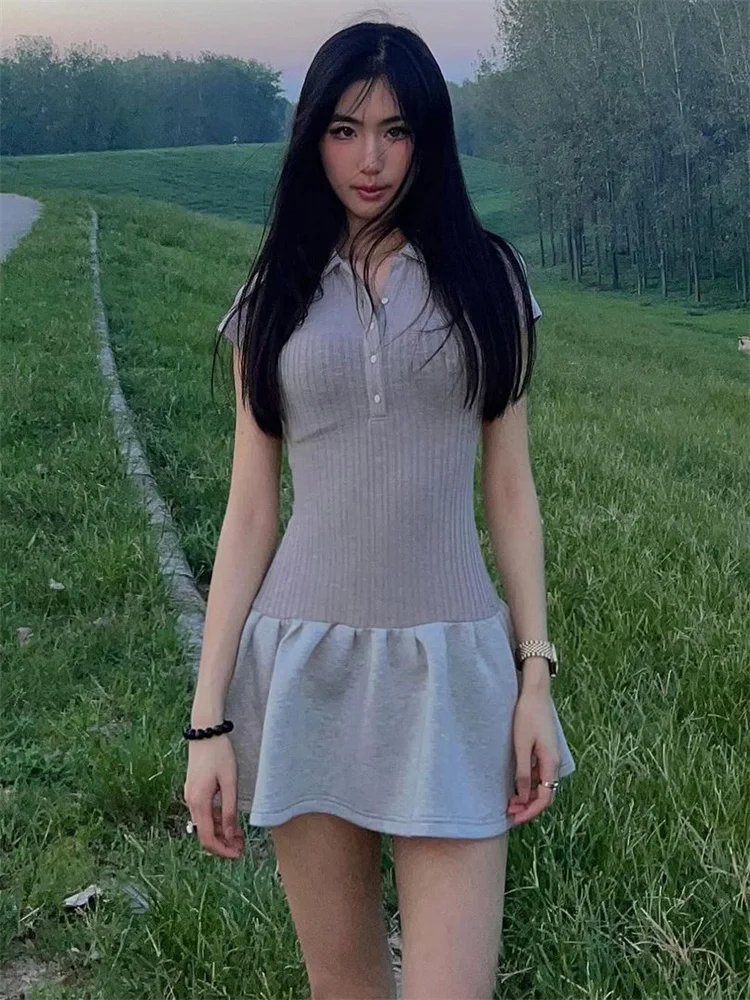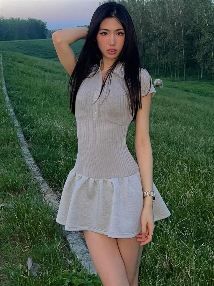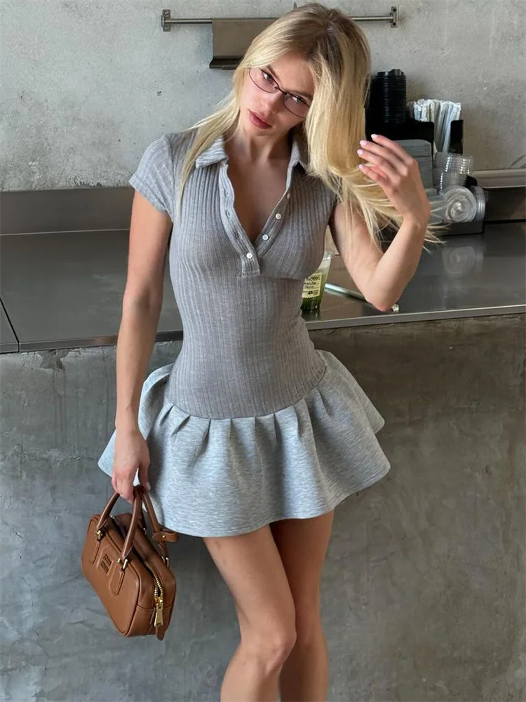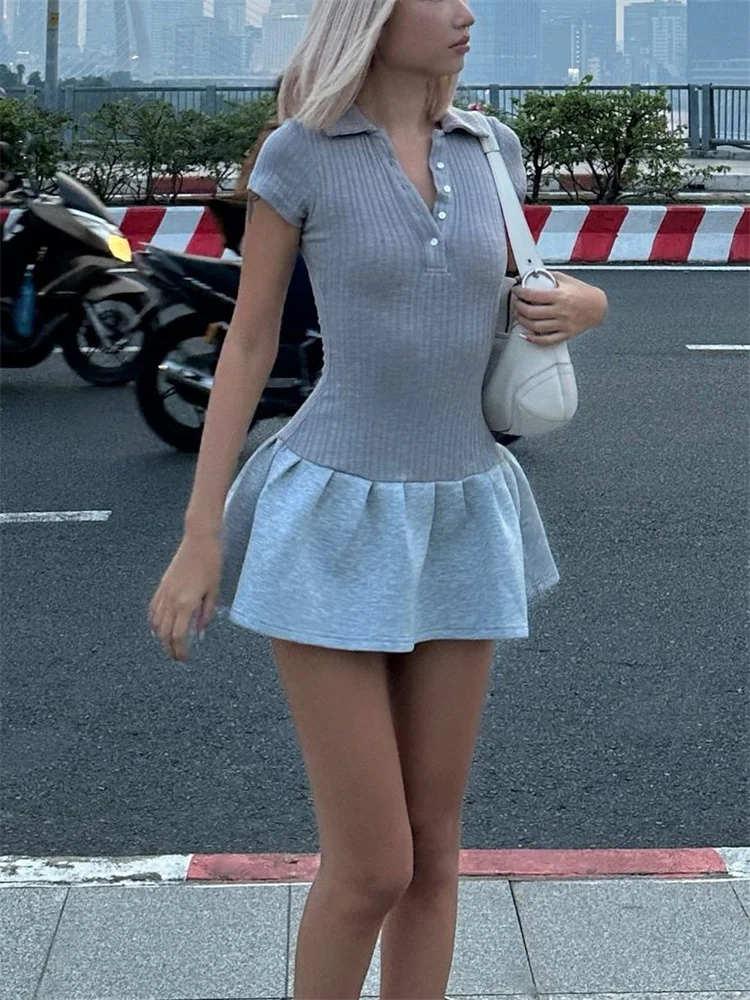 Tossy Ribbed Knit Fashion MIni Dress Women’s Short Sleeve Lapel High Waist Patchwork Commute Autumn Dress Female Bodycon Dress