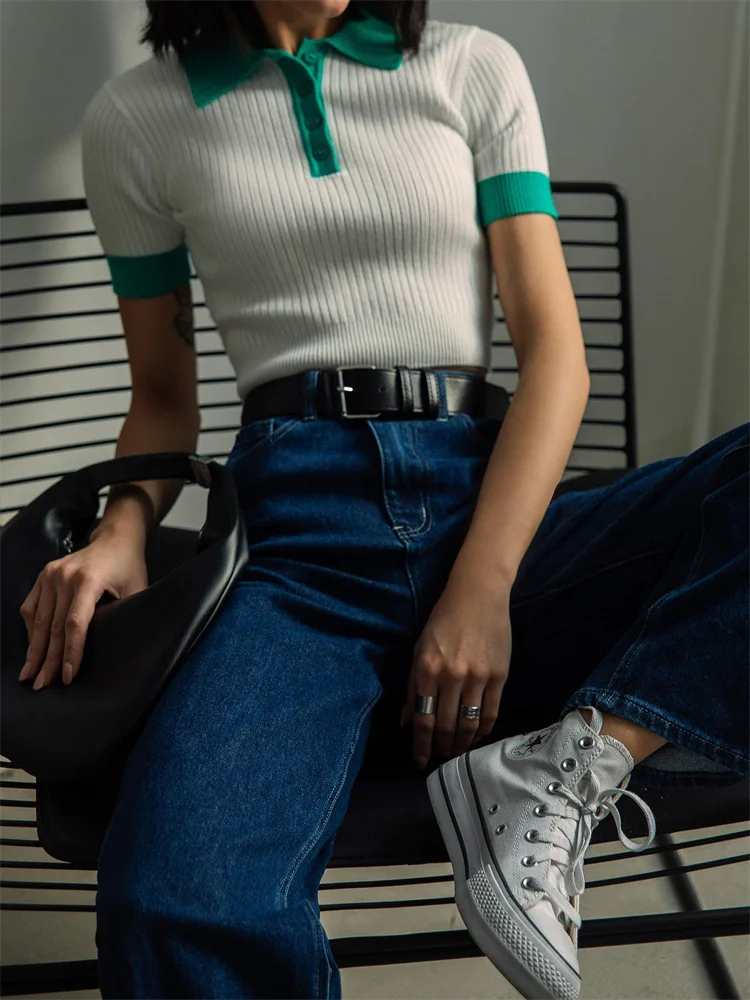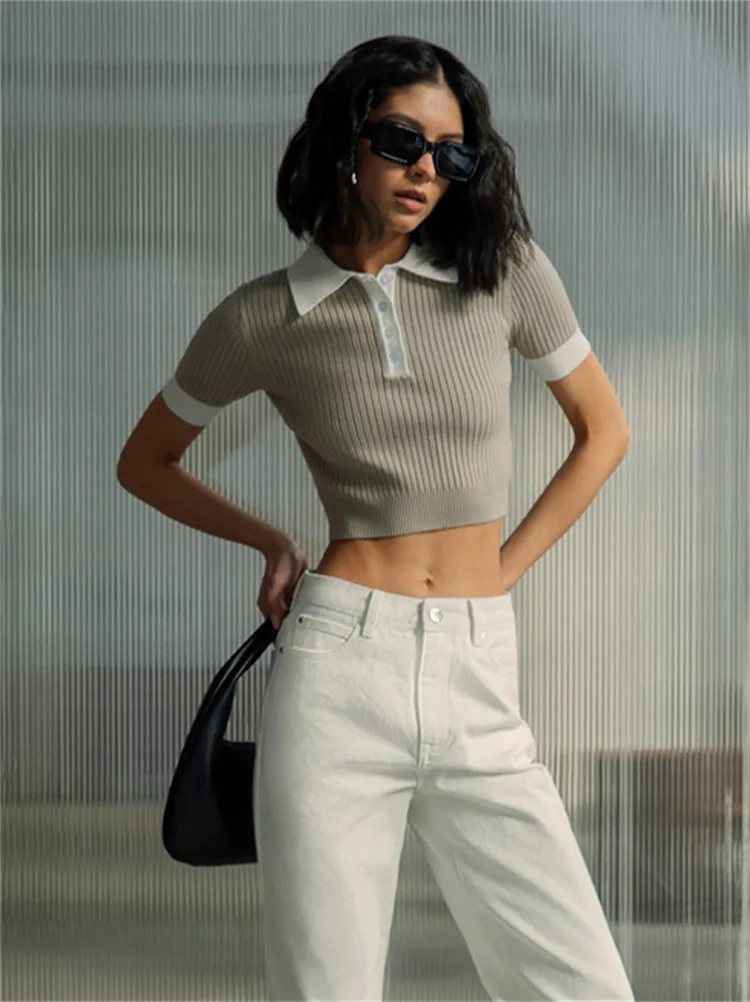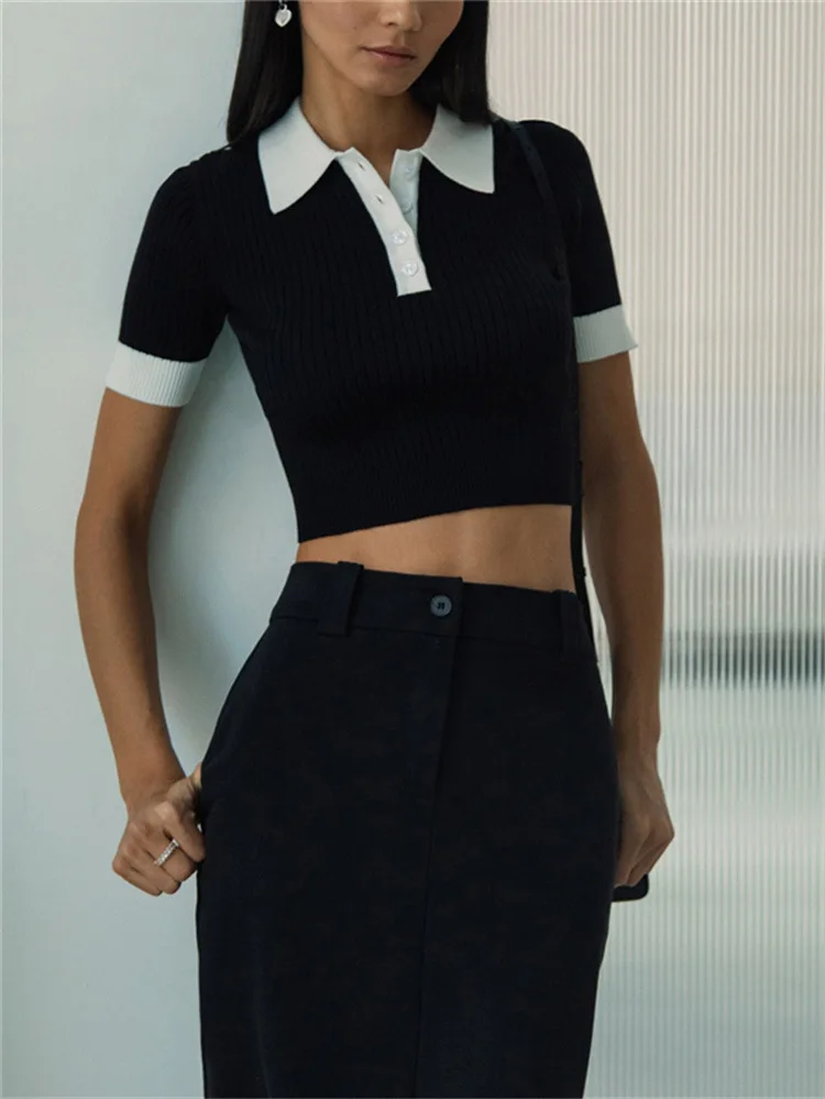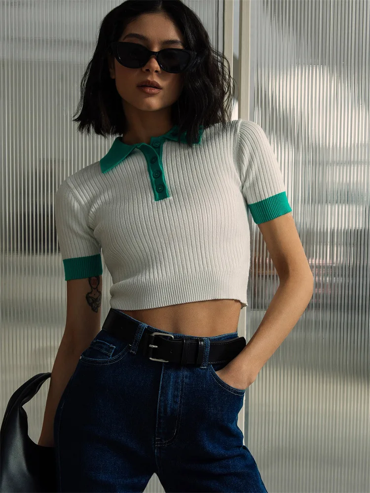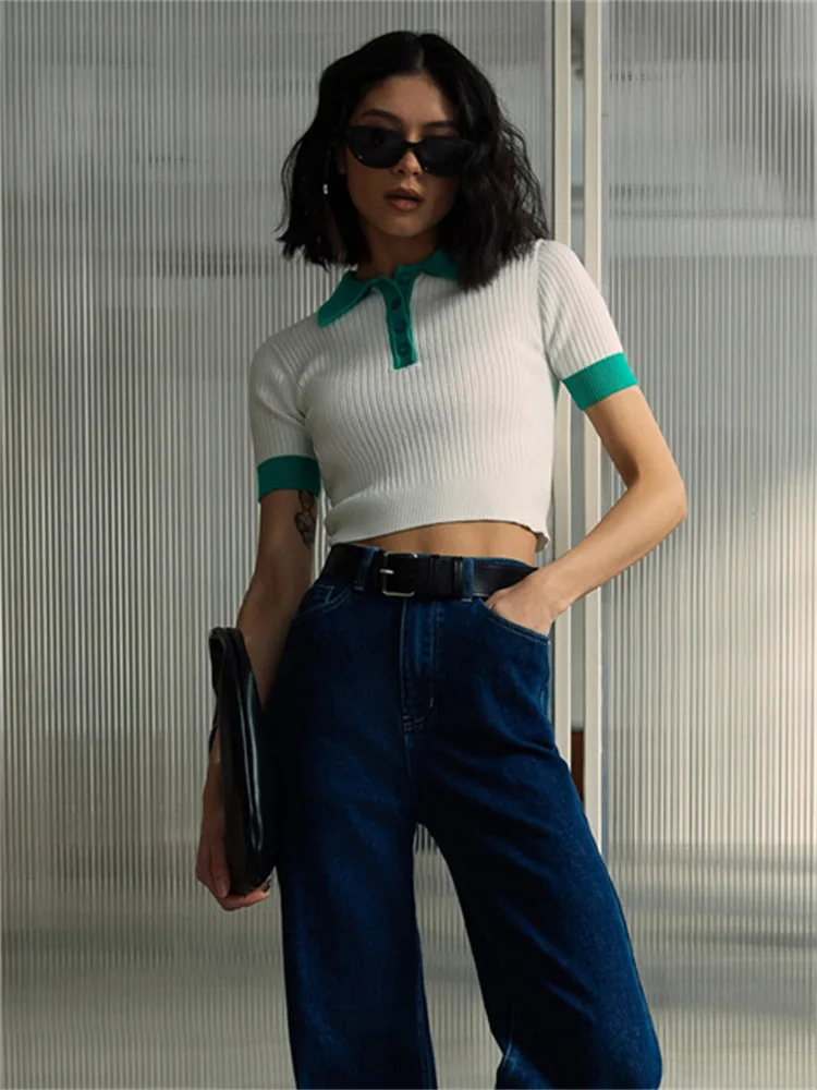 Tossy Summer Knitwear Sweater Pullover Top For Women Ribbed Lapel Short Sleeve Cropped Top Vest Patchwork Female Knit Pullovers
