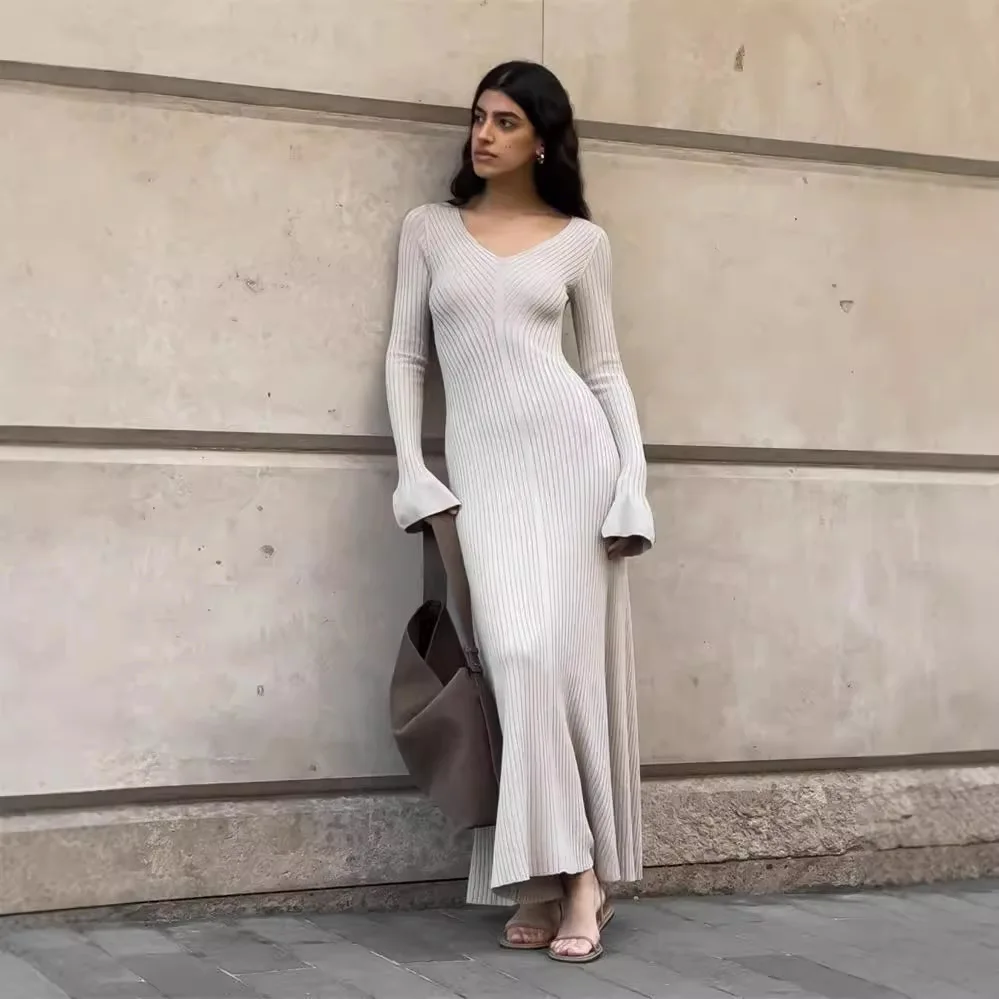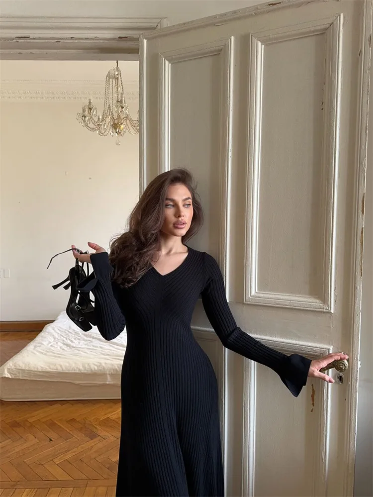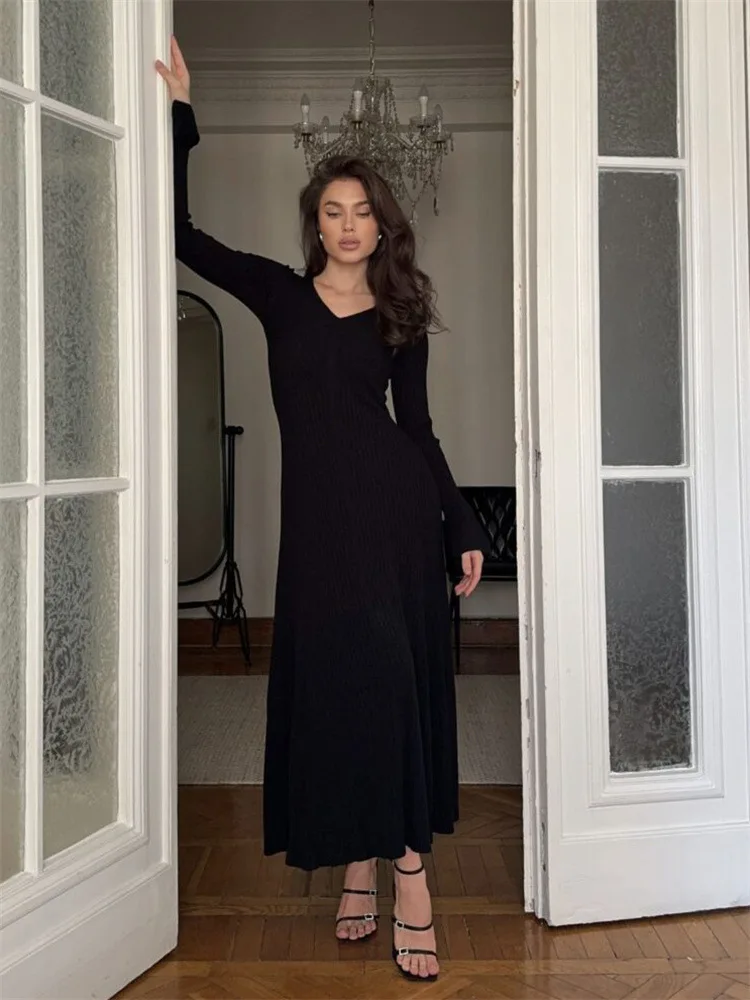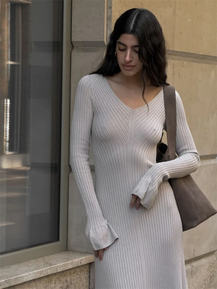 Tossy V-Neck Ribbed Knitwear Dress Female Patchwork Ruffled Slim High Waist Long Sleeve Bodycon Dress Knit Vintage Maxi Dress