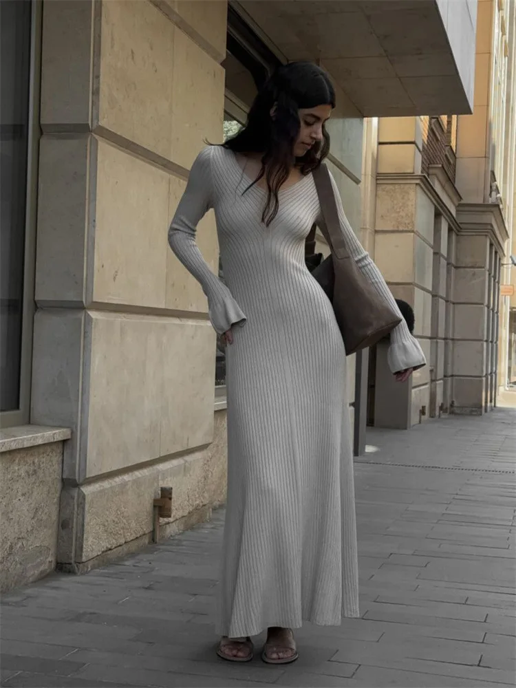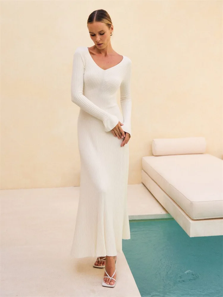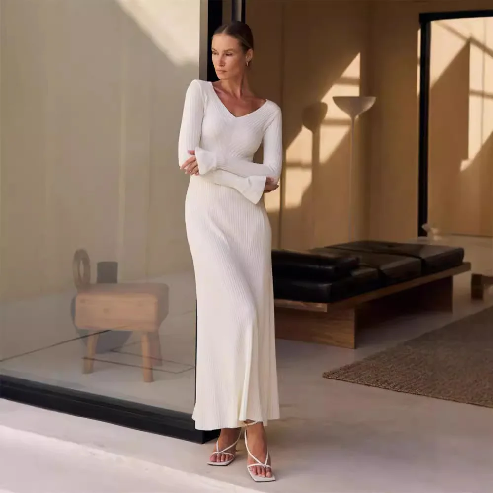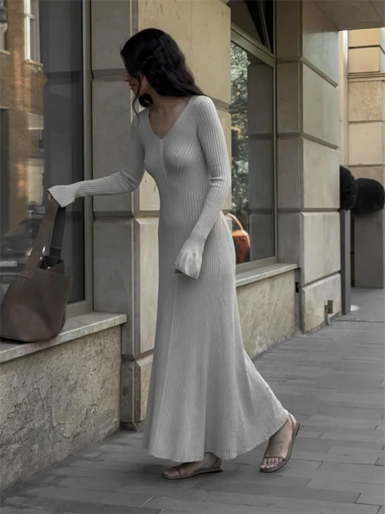 Tossy V-Neck Ribbed Knitwear Dress Female Patchwork Ruffled Slim High Waist Long Sleeve Bodycon Dress Knit Vintage Maxi Dress