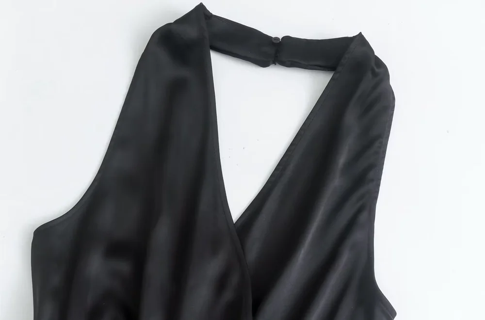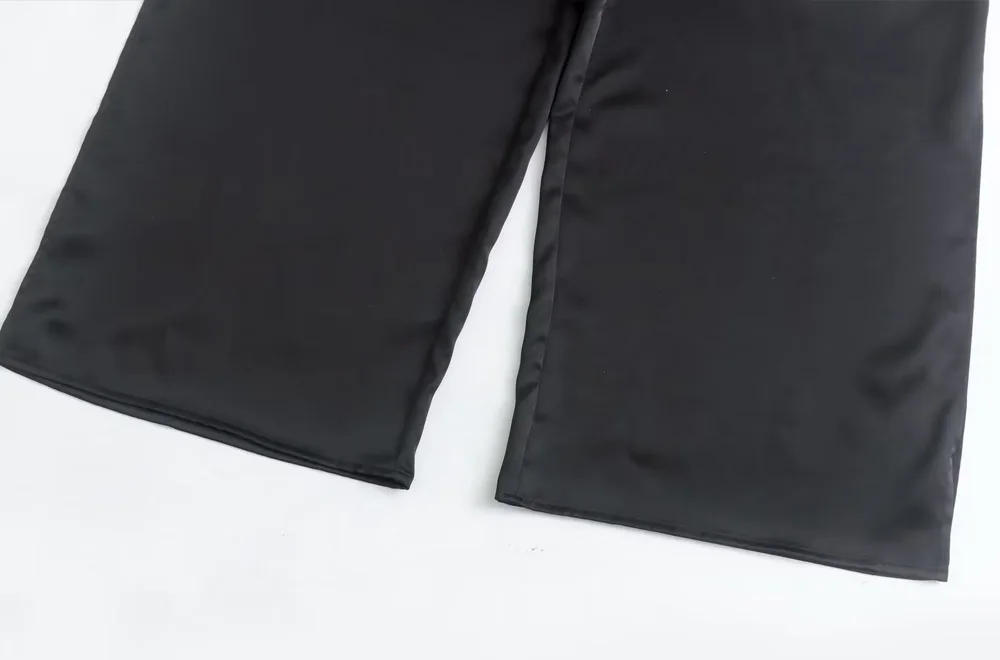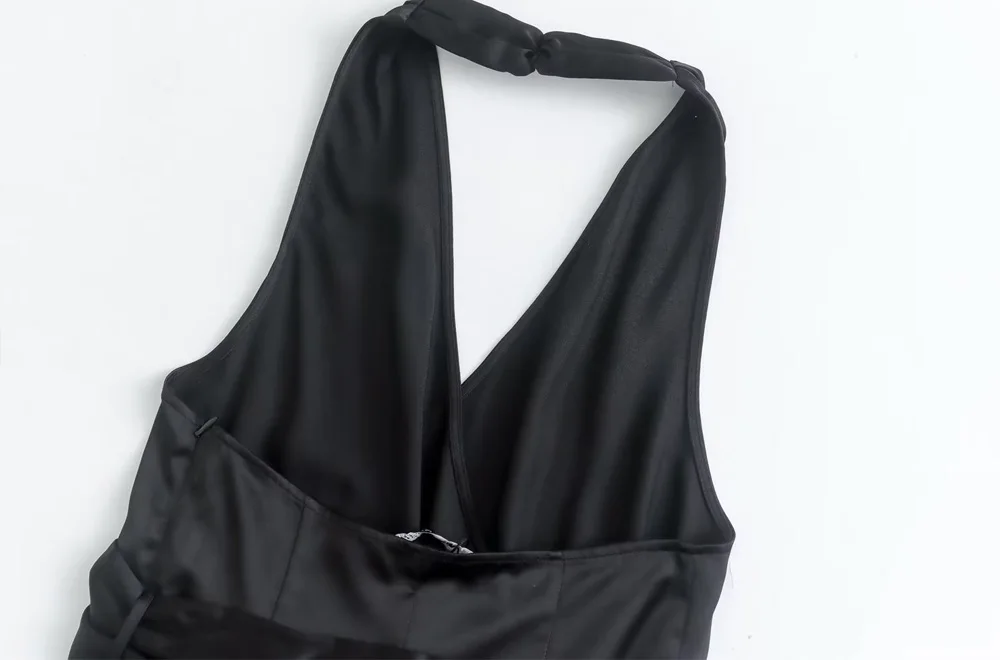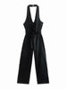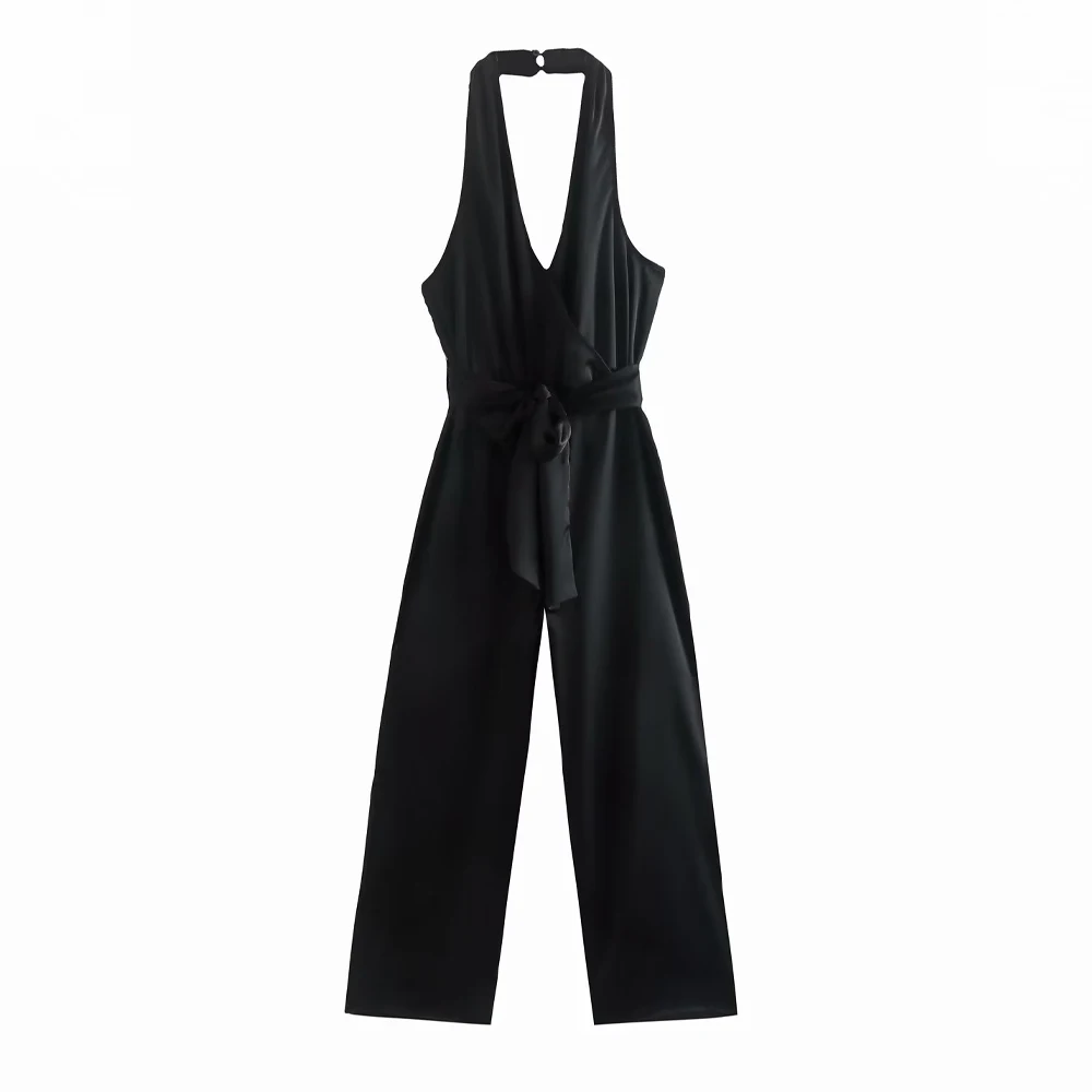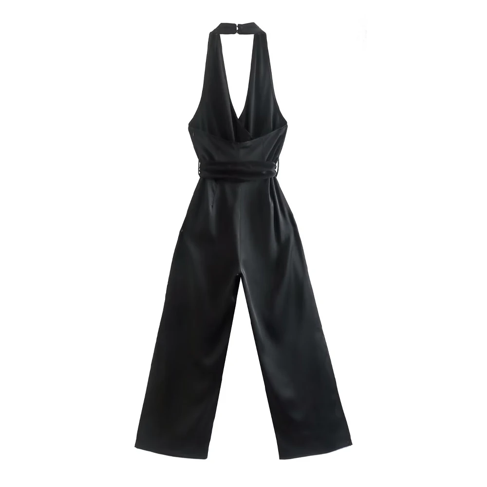 TRAF Women Fashion With Belt Satin Wide Leg Jumpsuits Vintage Halterneck Backless Zipper Female Playsuits Mujer