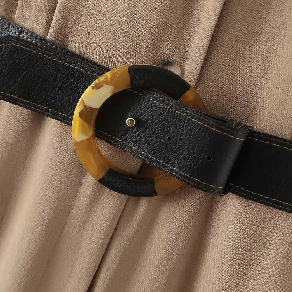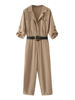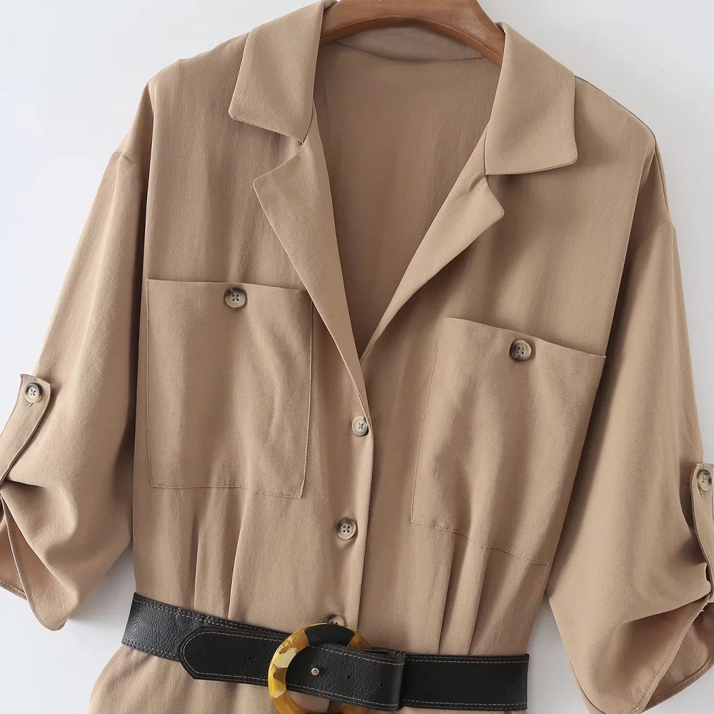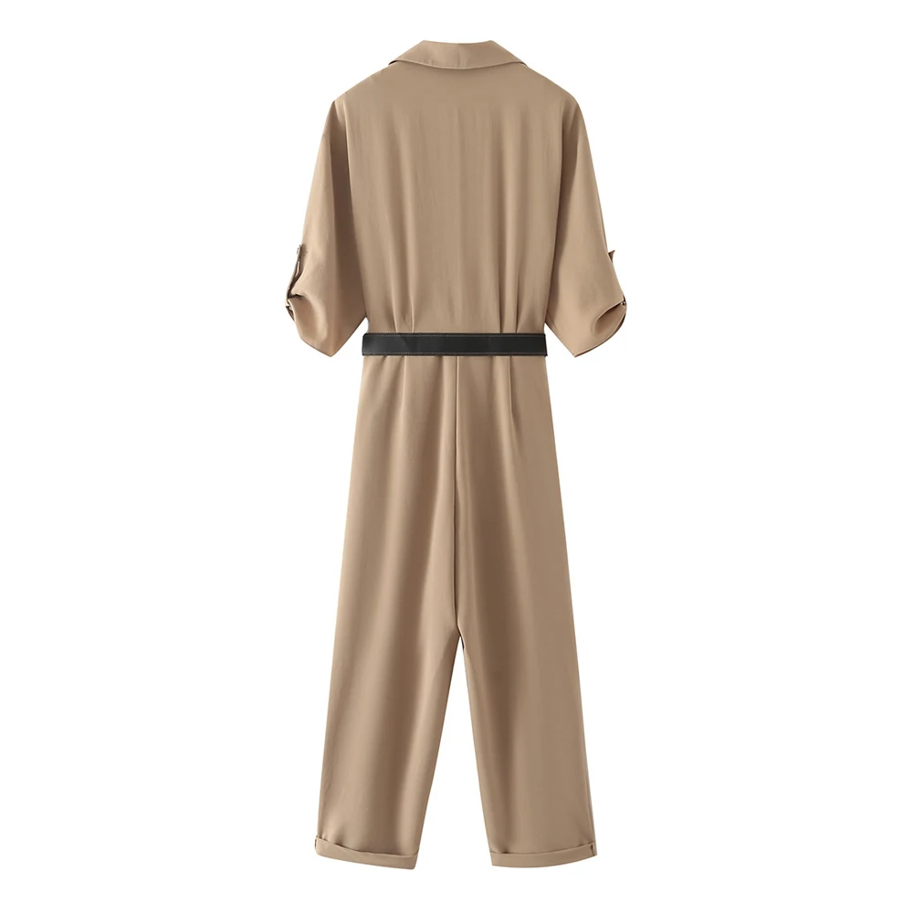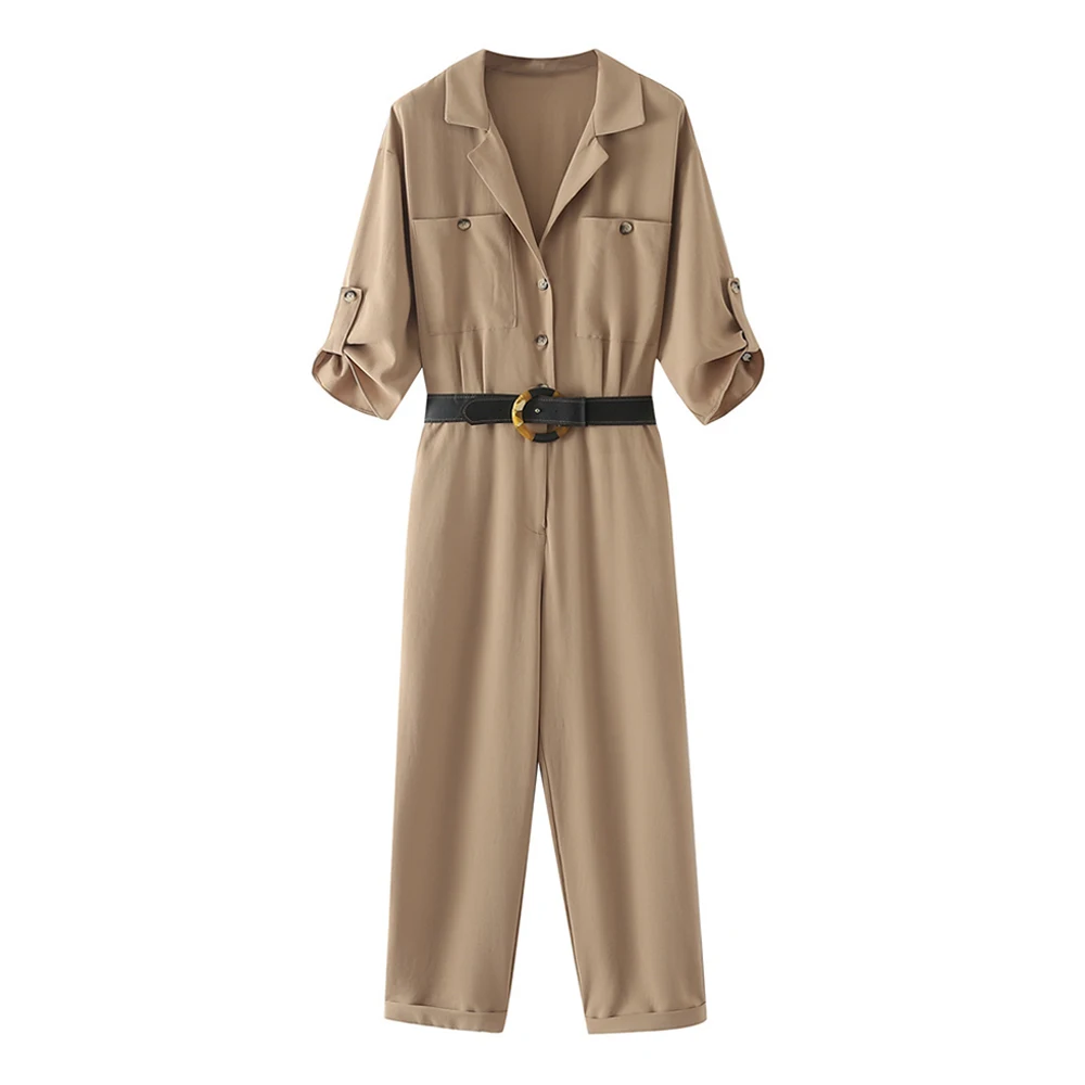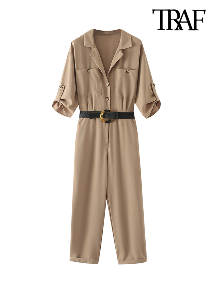 TRAF Women Fashion With Belt Side Pockets Jumpsuits Vintage Short Sleeve Front Buttons Female Playsuits Mujer