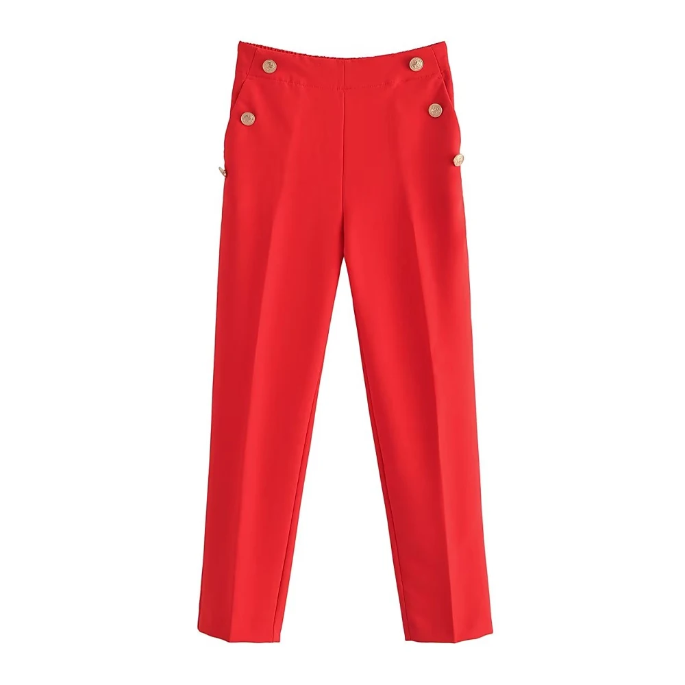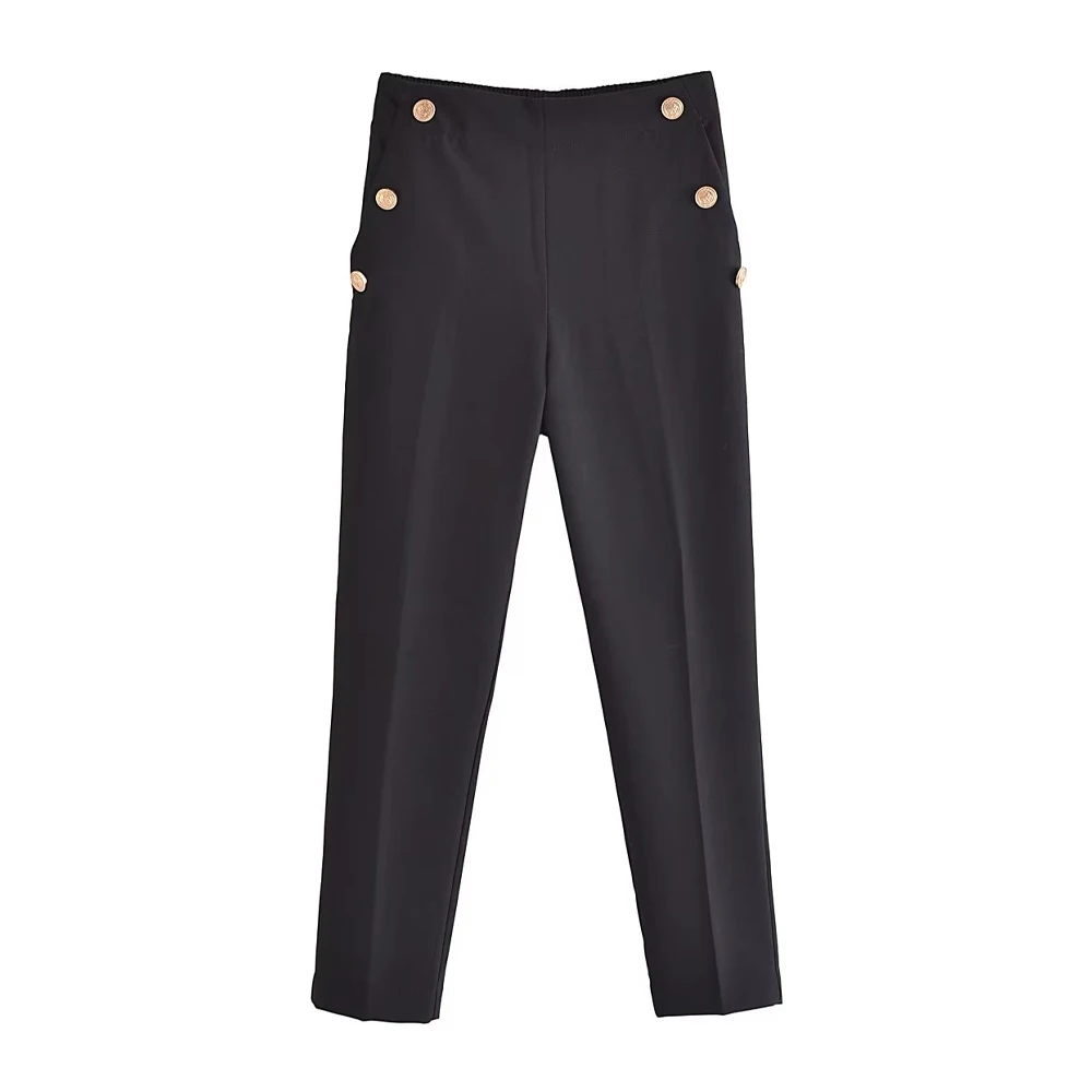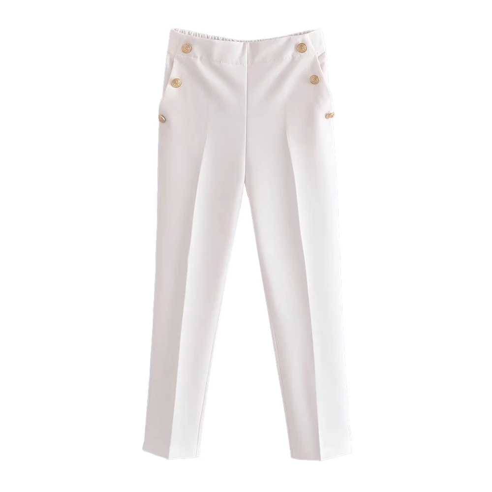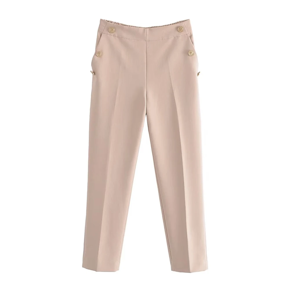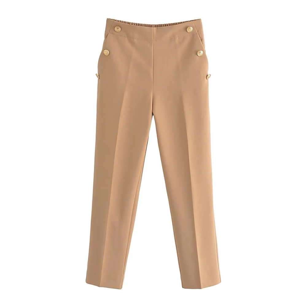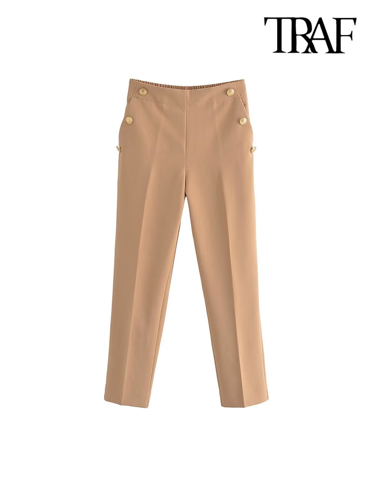 TRAF Women Fashion With Metallic Button Straight Pants Vintage High Waist Back Elastic Waistband Female Ankle Trousers Mujer