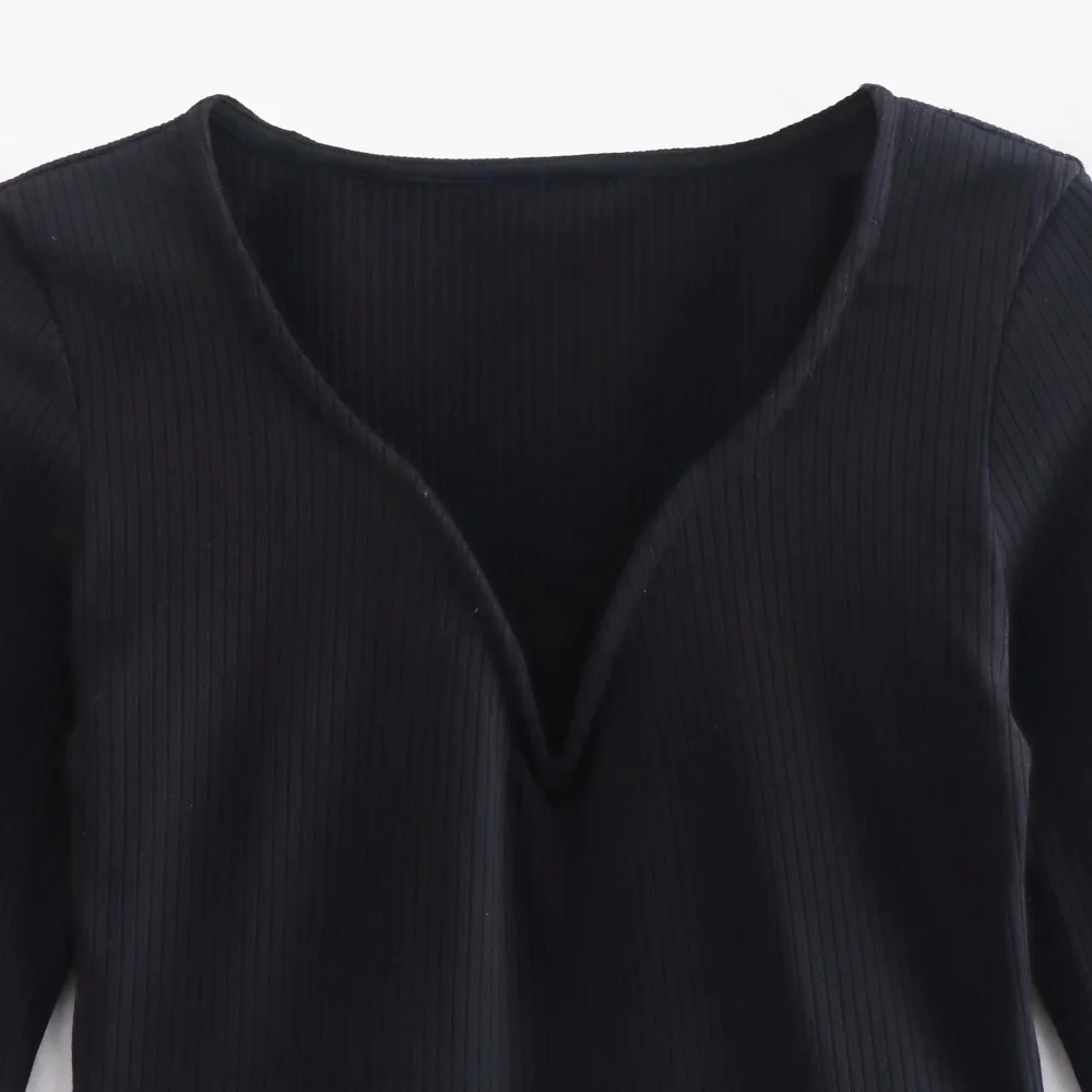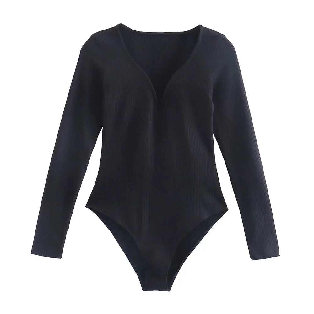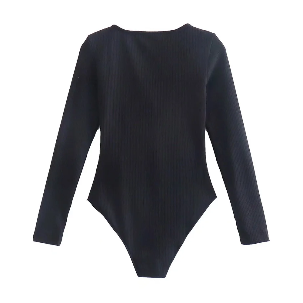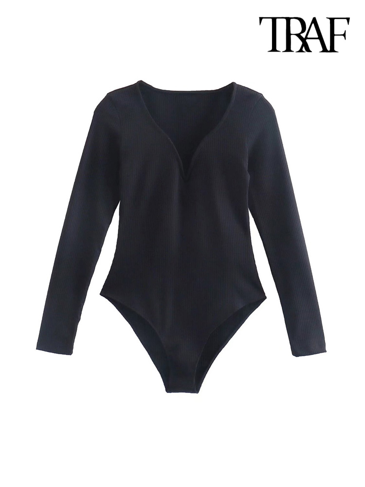 TRAF Women Fashion With V Neck Fitted Knit Bodysuits Vintage Long Sleeve Snap-button Female Playsuits Mujer