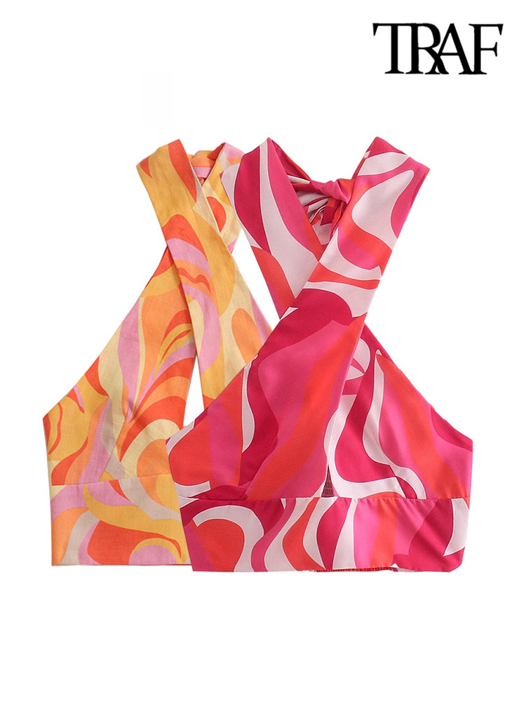 TRAF Women Sexy Fashion Printed Y2K Cropped Cross Tank Tops Vintage Backless Elastic Bow Ties Strap Female Camis Mujer