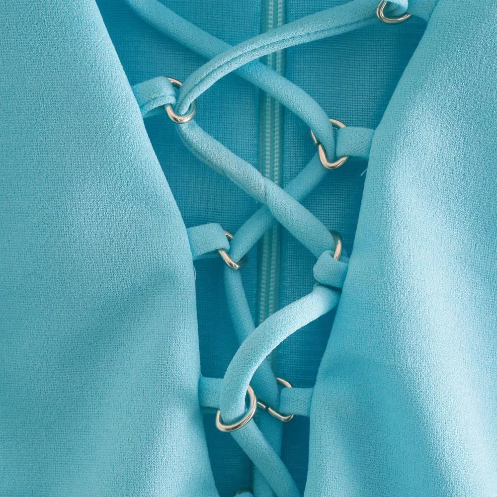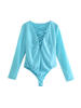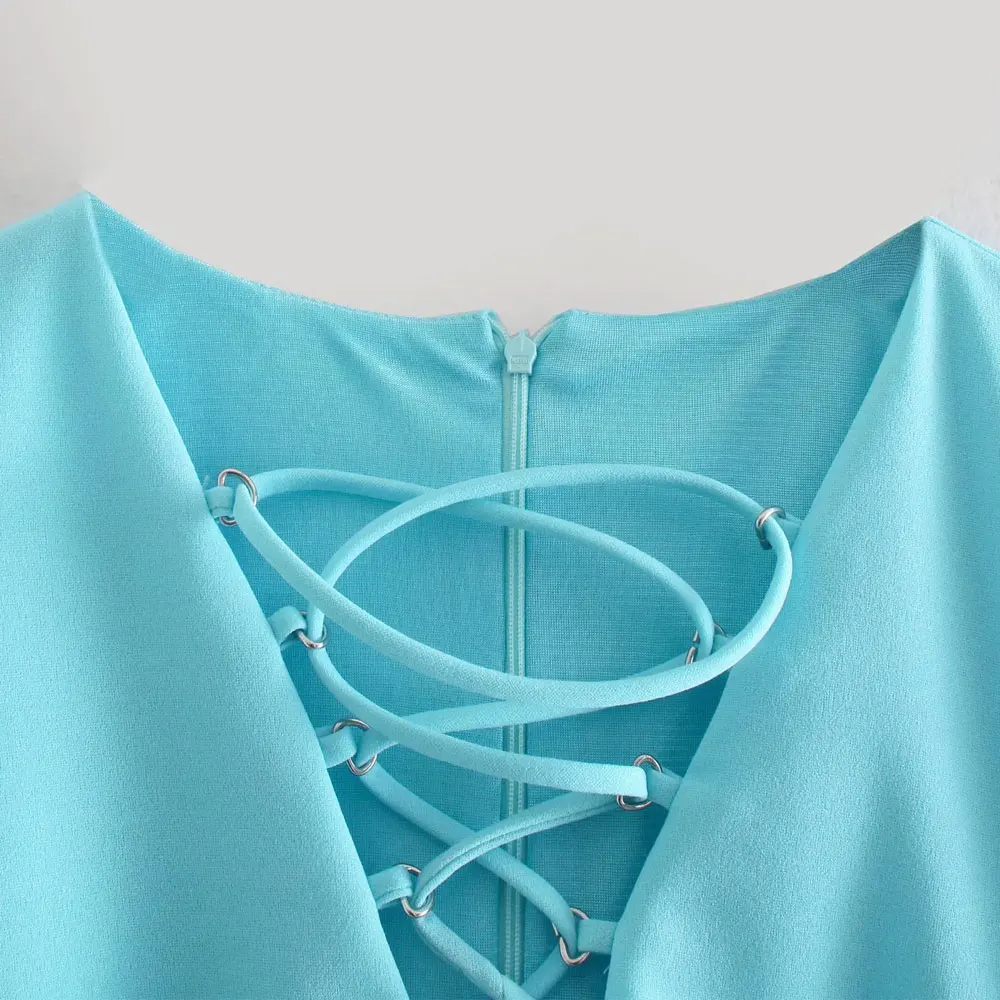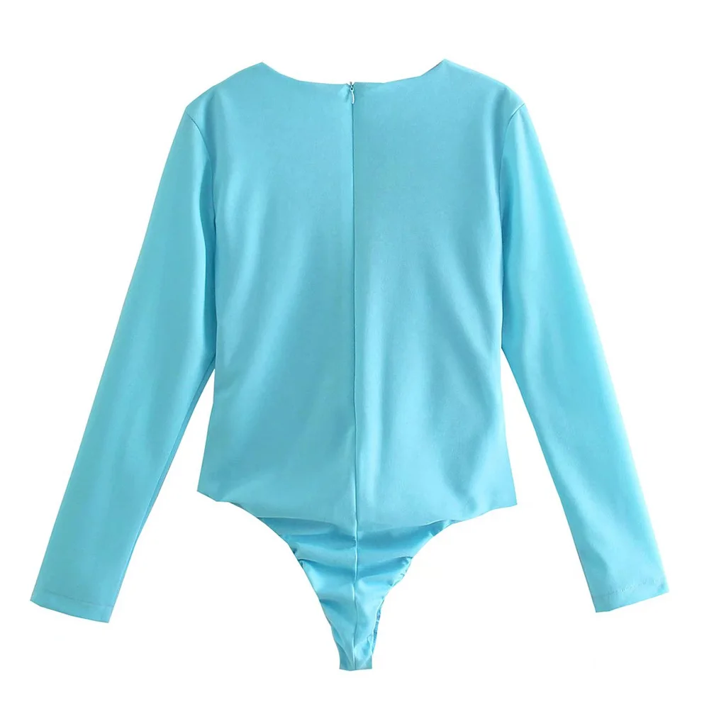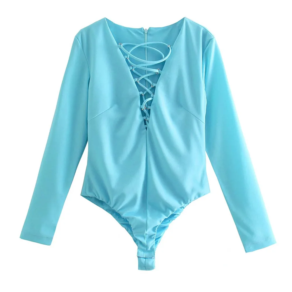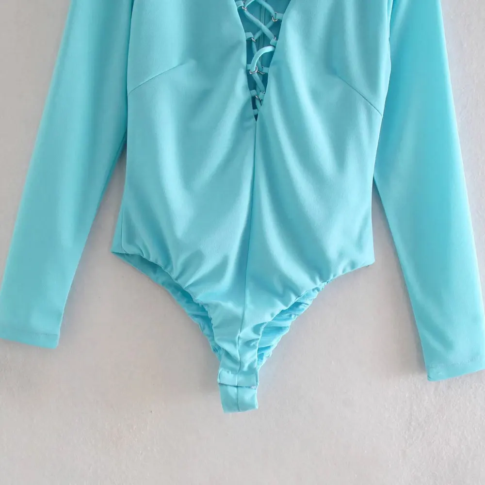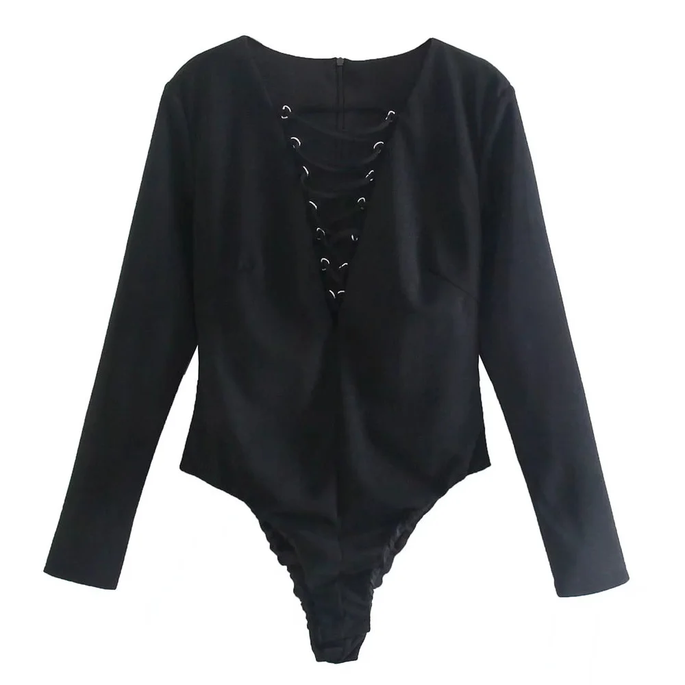 TRAF Women Sexy Fashion With Drawstring Snap-button Bodysuit Vintage V Neck Long Sleeve Female Playsuits Mujer