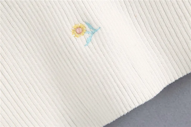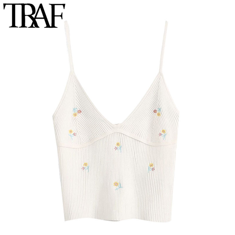 TRAF Women Sweet Fashion Floral Embroidery Cropped Knitted Blouses Vintage Backless Thin Straps Female Shirts Chic Tops