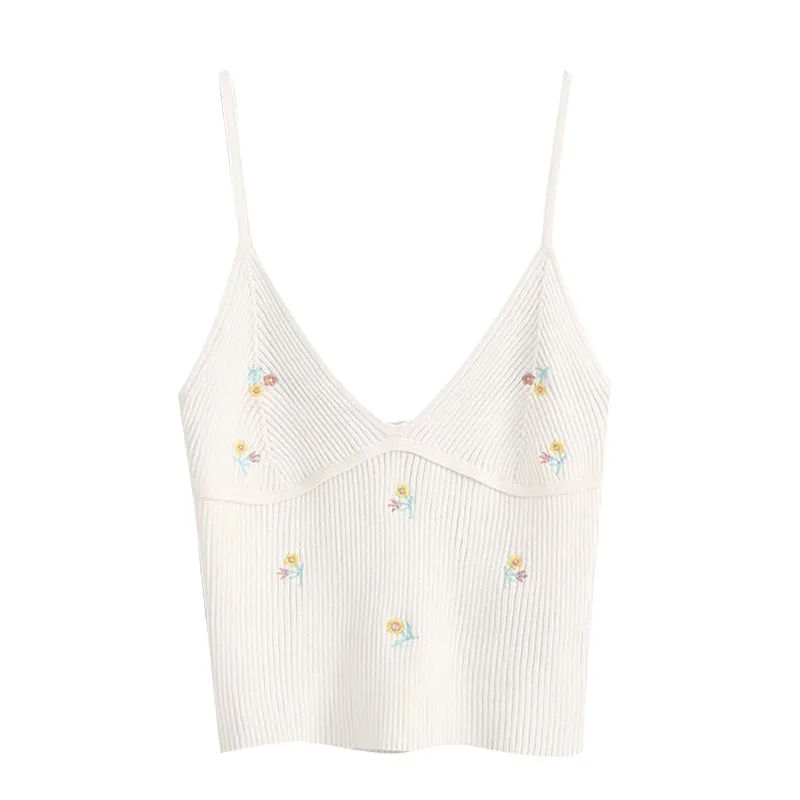 TRAF Women Sweet Fashion Floral Embroidery Cropped Knitted Blouses Vintage Backless Thin Straps Female Shirts Chic Tops