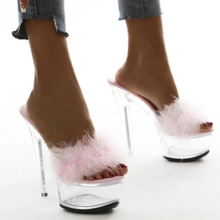 Transparent waterproof table hairy pink purple super high heel women slippers fashion sexy women high heels