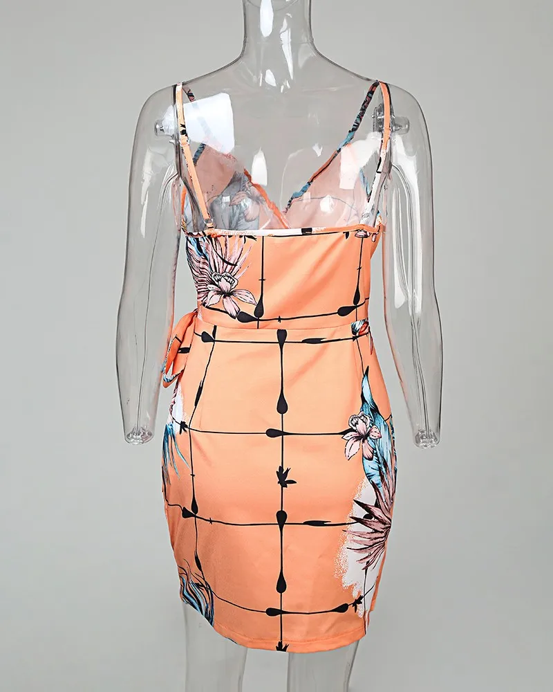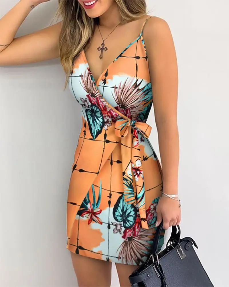 Tropical Print V-Neck Wrap Casual Dress Women Sleeveless Summer Holiday Mini Dress