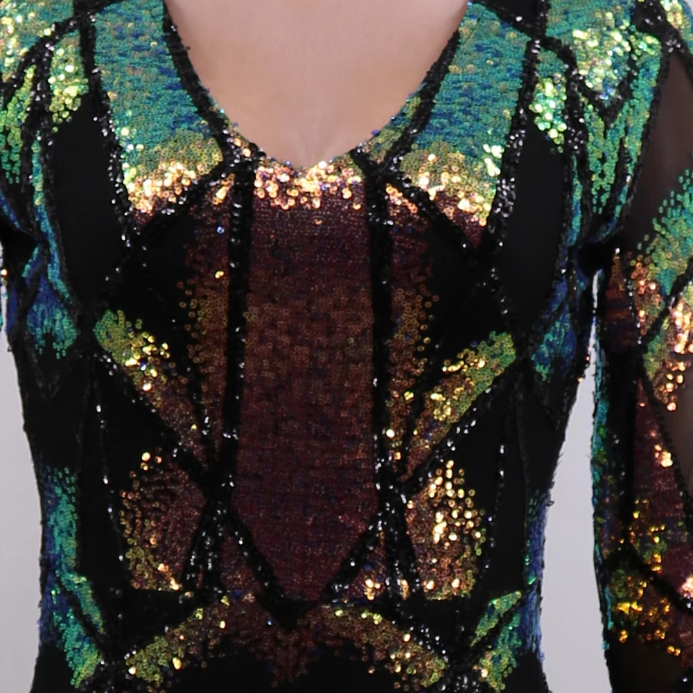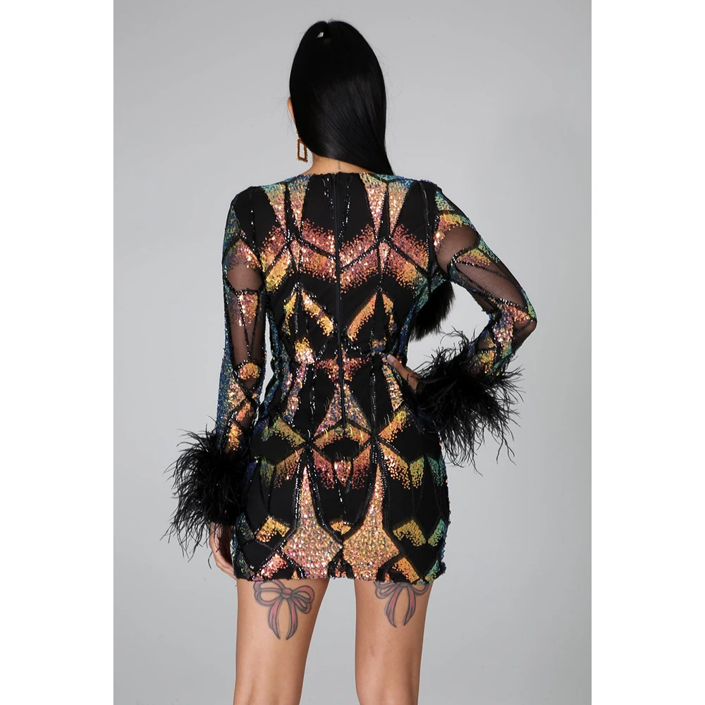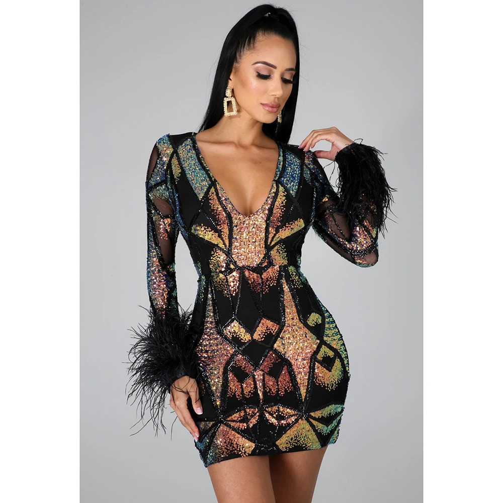 V-collar African Dresses Women Sexy Sequins Design Exquisite Long Sleeve Ostrich Feather Slim Evening Party Dress Vestidos