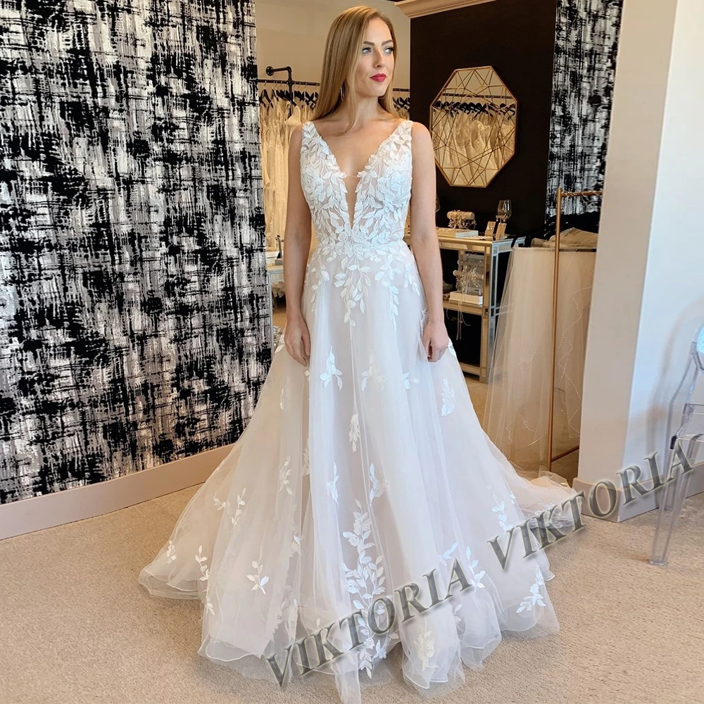 VIKTORIA Fashion Aline Wedding Dresses V-neck Custom-Made Court Train Appliques Sleeveless Robe De Mariée Engagement Plus