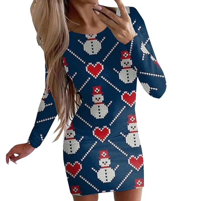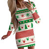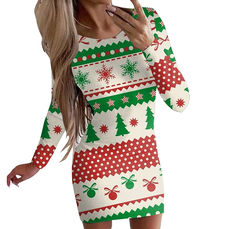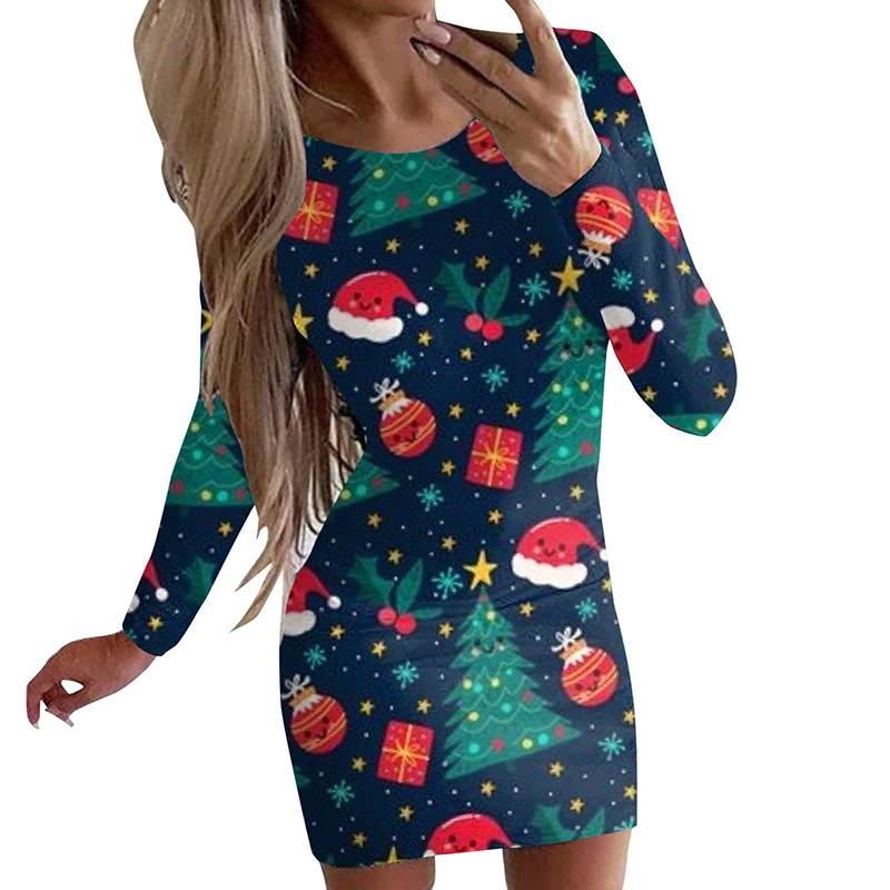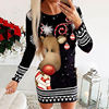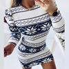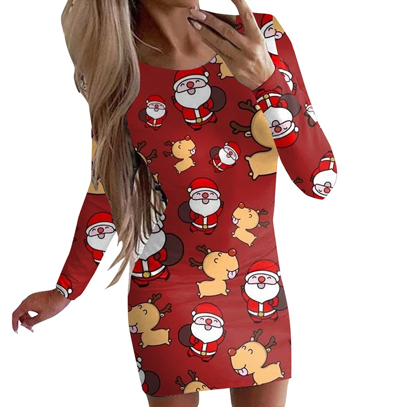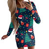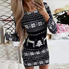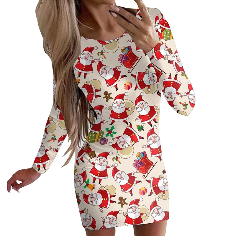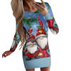 Vintage Christmas Mini Dresses For Women Winter O Neck Santa Claus Print Slim Dress Elegant Ladies Long Sleeve Bodycon Vestidos