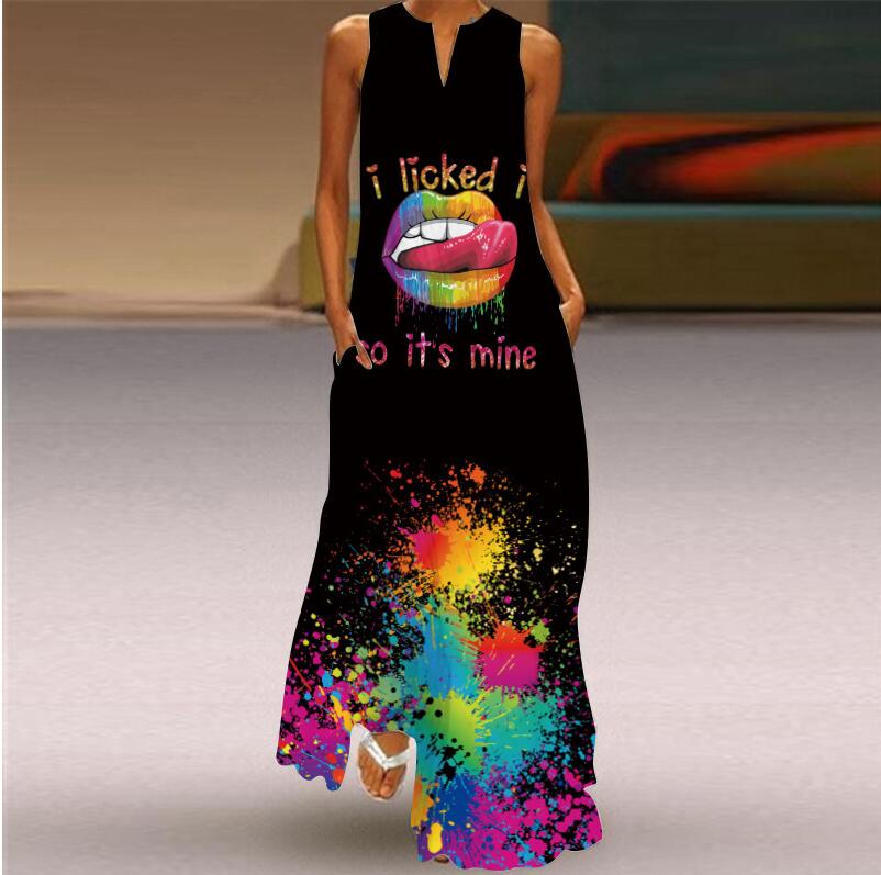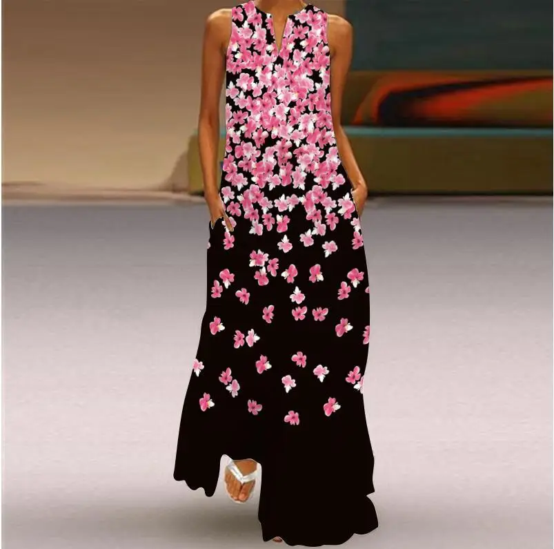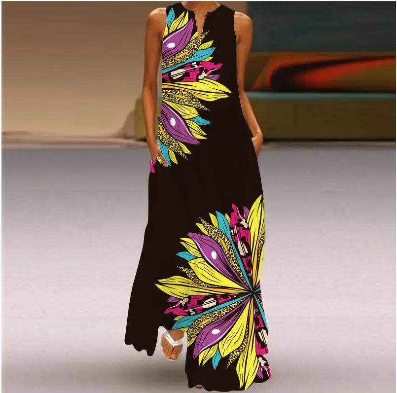 Vintage Print V-neck Sleeveless Summer Dress Elegant Women 2021 Dress Plus Size Casual Ladies Pocket Party Long Dresses Vestidos