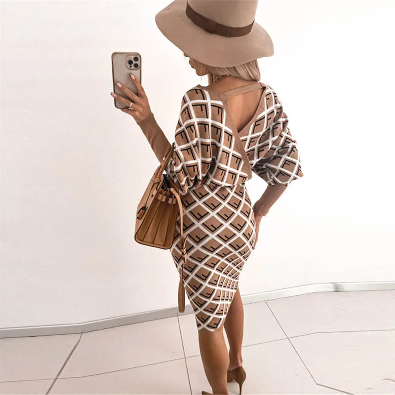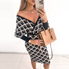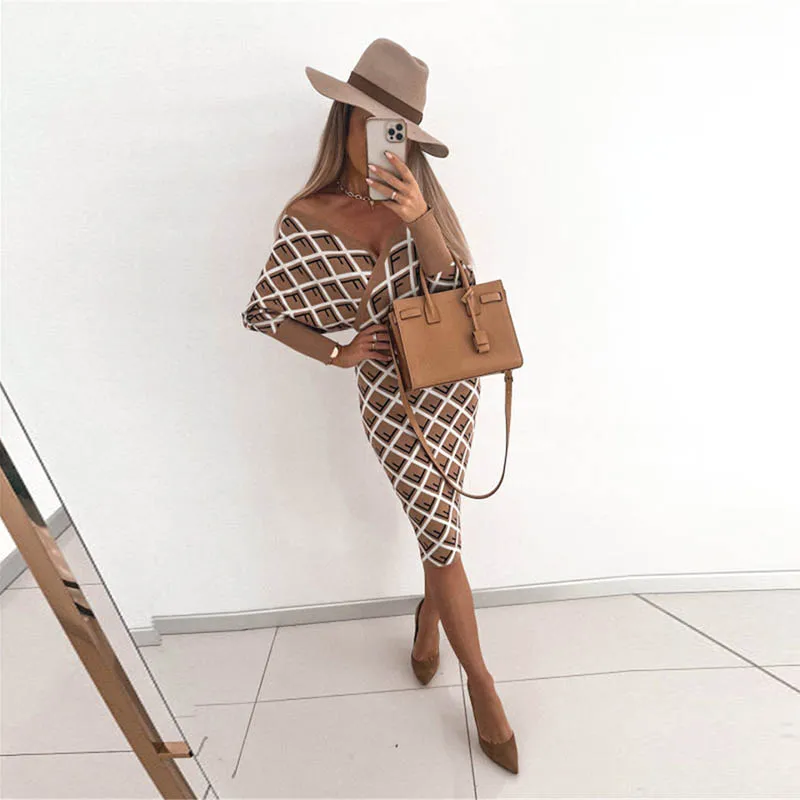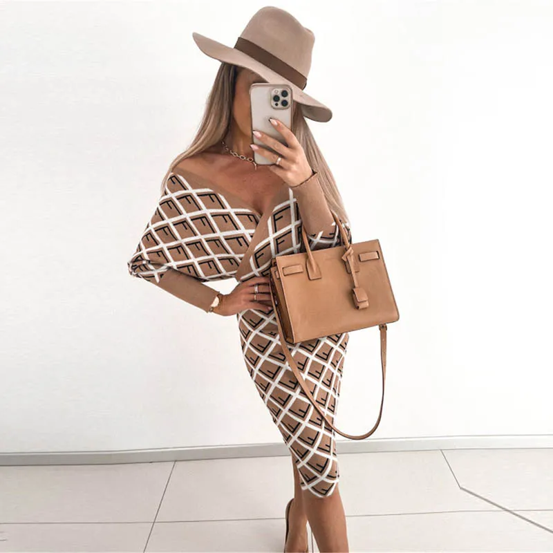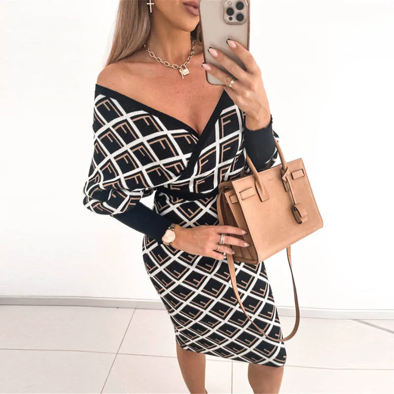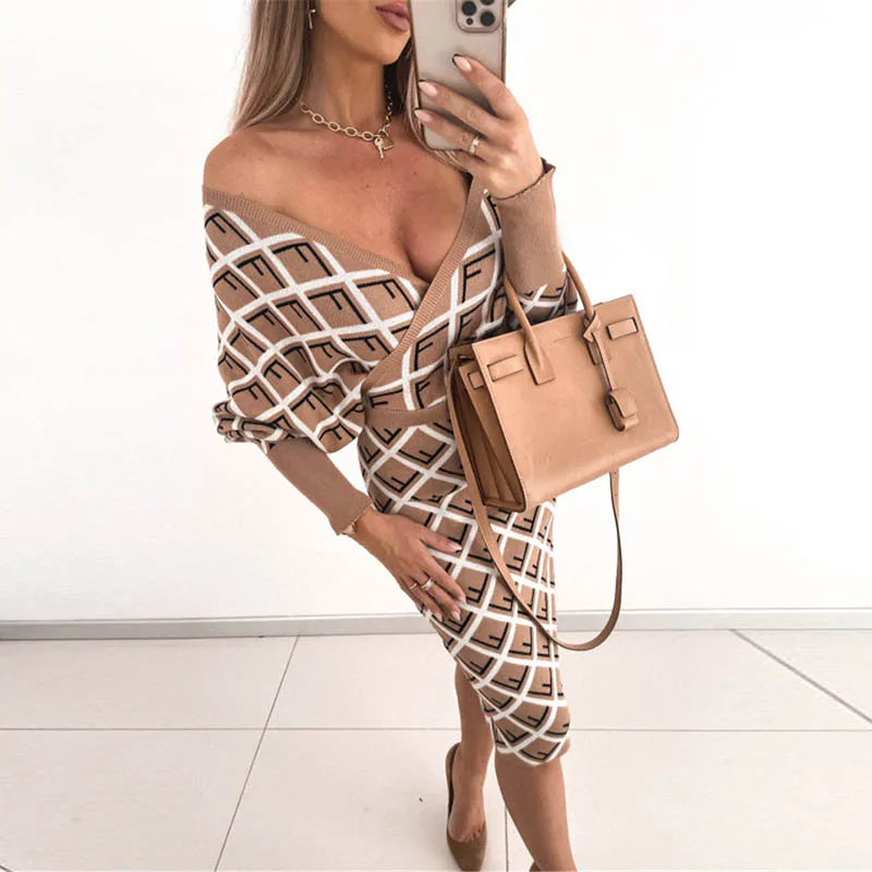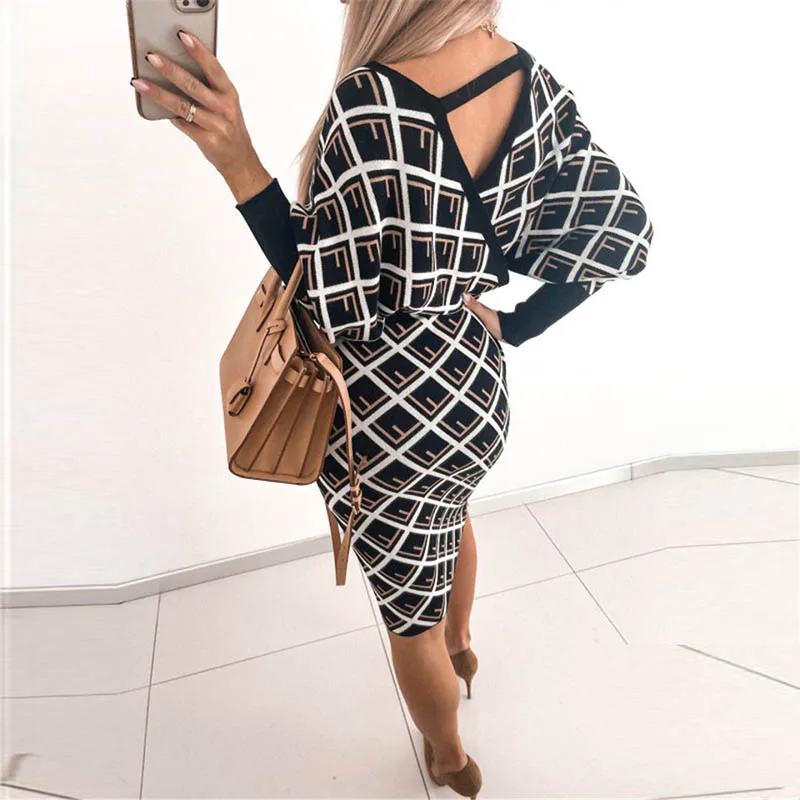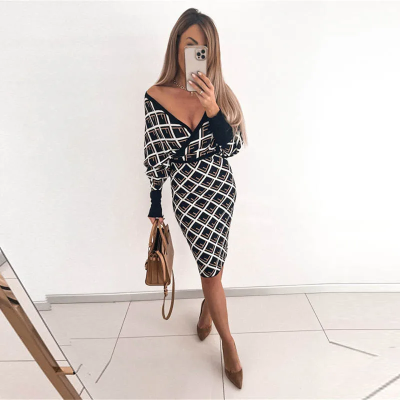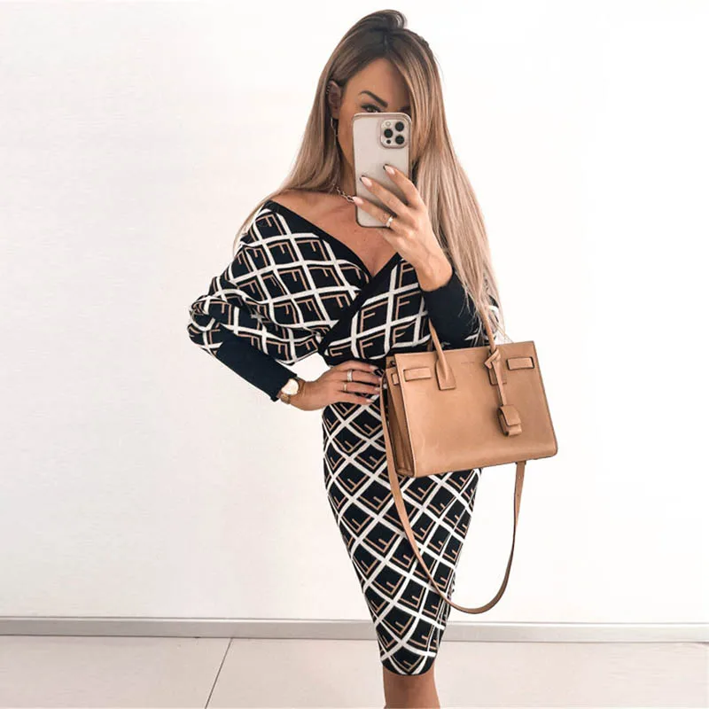 Vintage Printed Women Dress 2021 Autumn Fashion Long-sleeved Sexy Deep V Neck Slim Dress Elegant Ladies Party Dresses Vestido