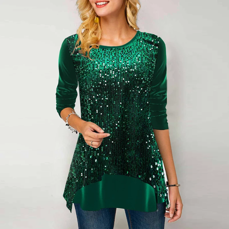 Vintage Solid Sequinis Blouse Women 2022 Fashion Spring O Neck Long Sleeve Ladies Blouse Street Casual Loose Pullover Tops