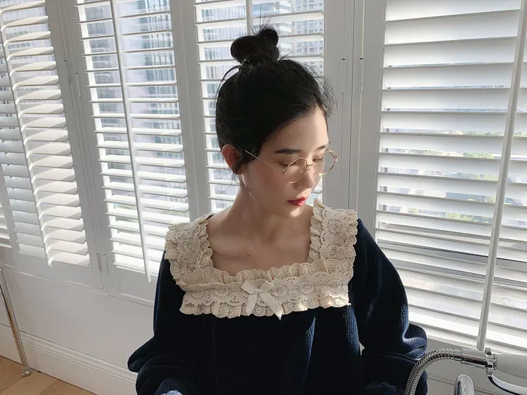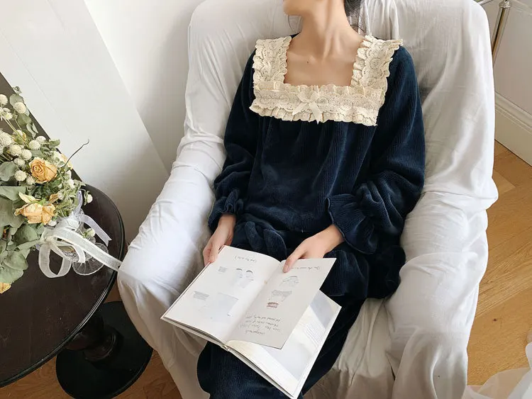 Vintage Thick Fleece Women’s Pajamas Sets Elegant Blue Lace Long Sleeve Sleepwear Suits Winter Autumn Sweet Pyjamas Homewear